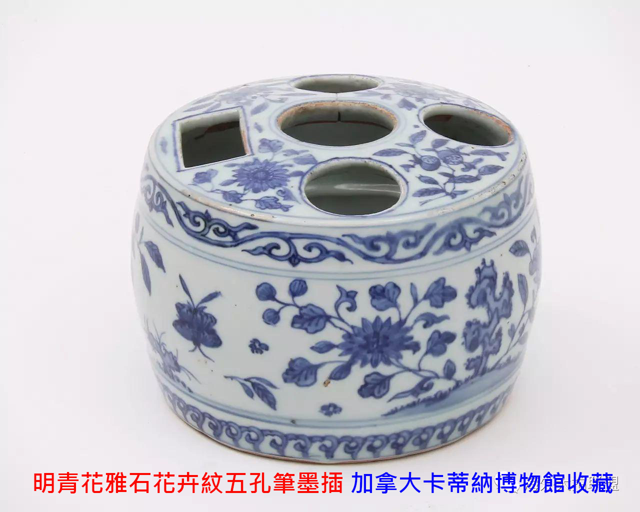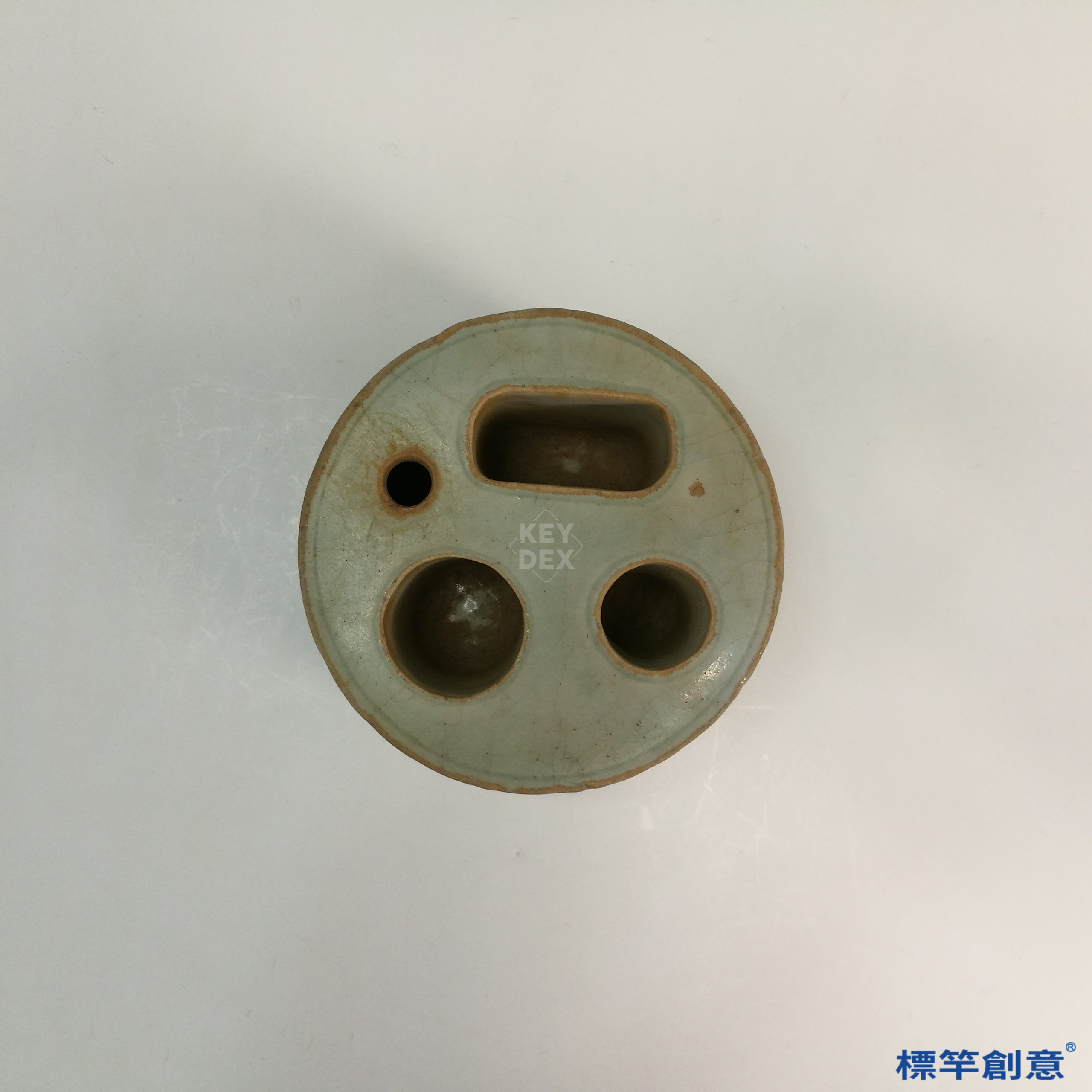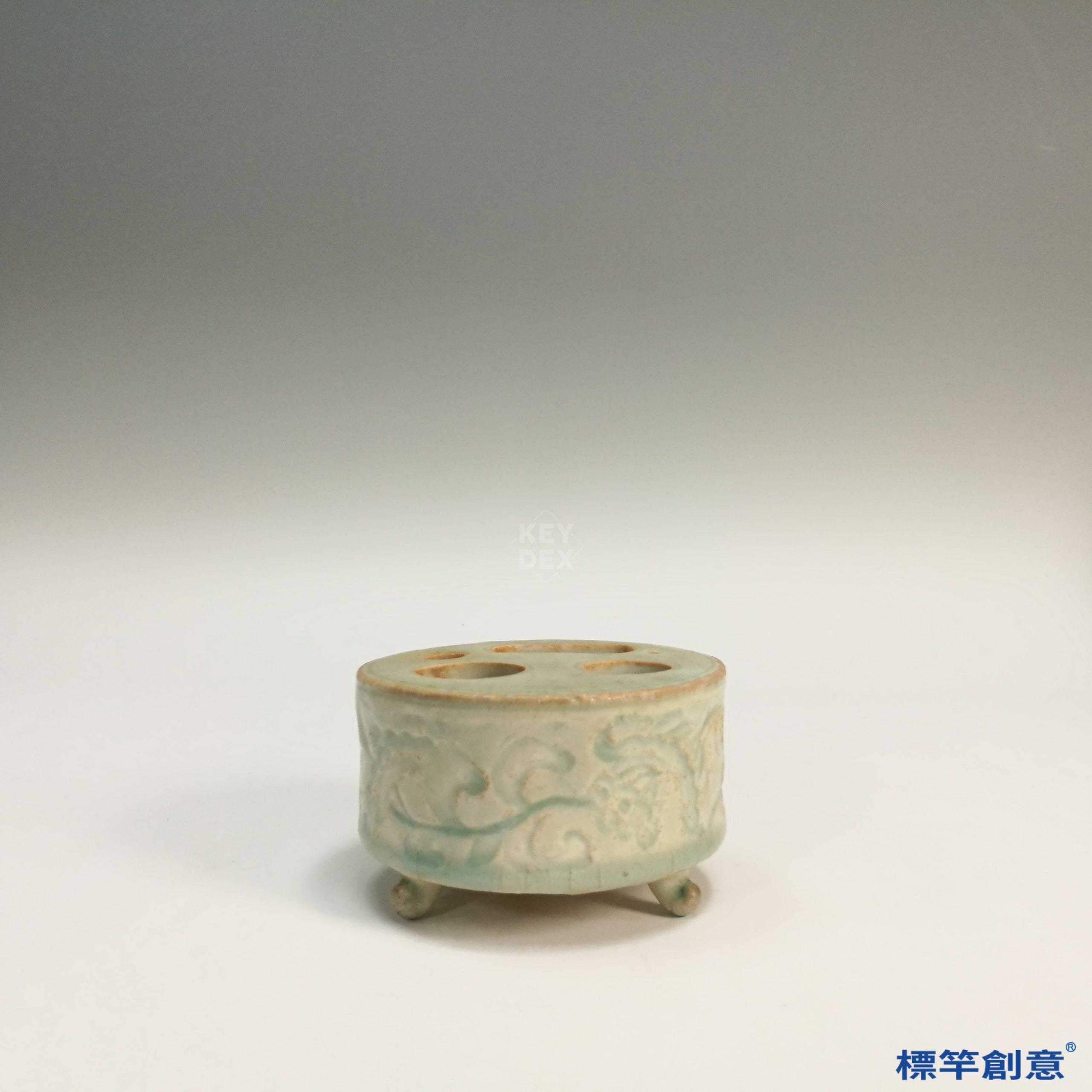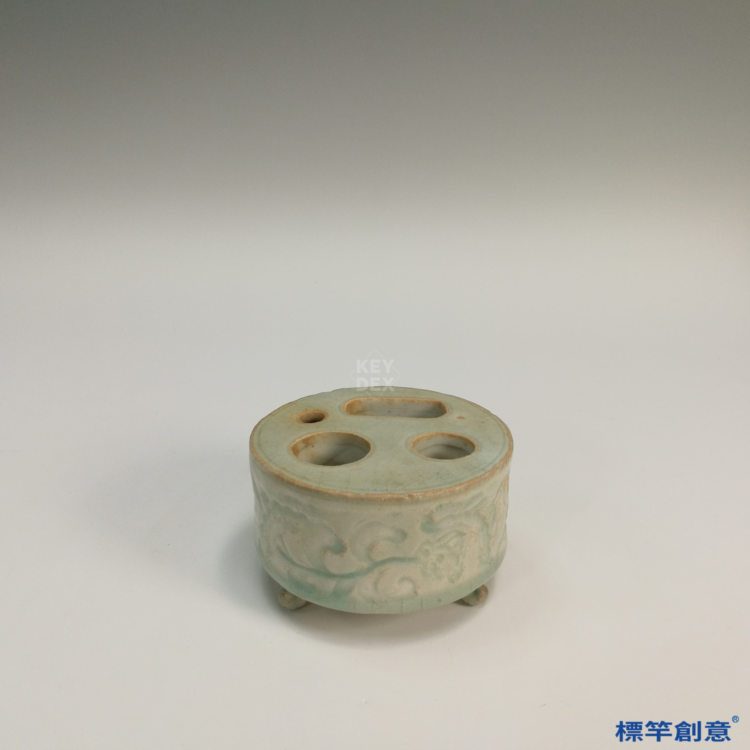 本器通高5.5公分,口徑9.5公分,呈圓柱狀,略似鼓形,下承三足支撐,器身飾以刻花,器頂開設數孔,便於插筆,造型實用而穩重。