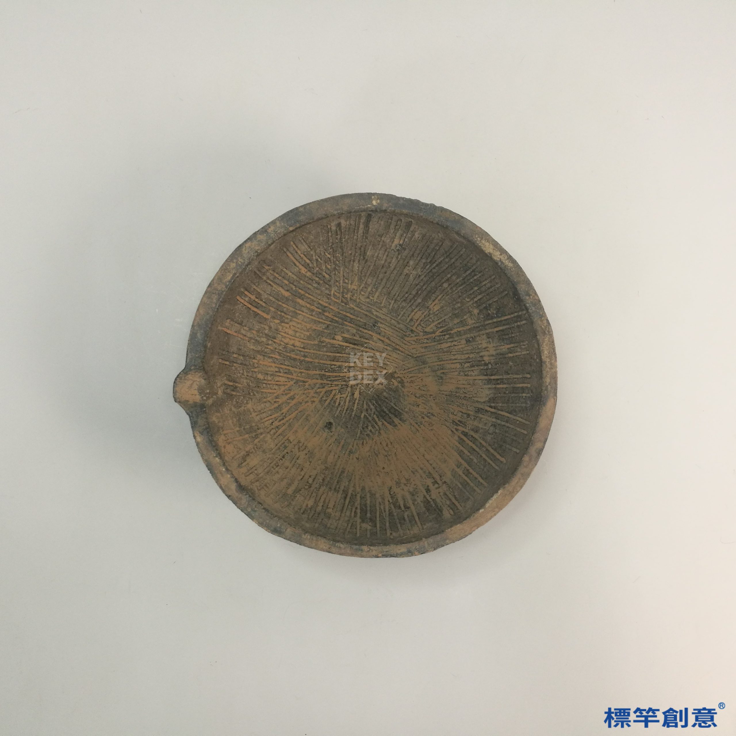 採高含鐵黏土成形,修整刻紋後入窯素燒,不施釉。經高溫還原燒製而成,展現建窯日用陶器之質樸工藝。