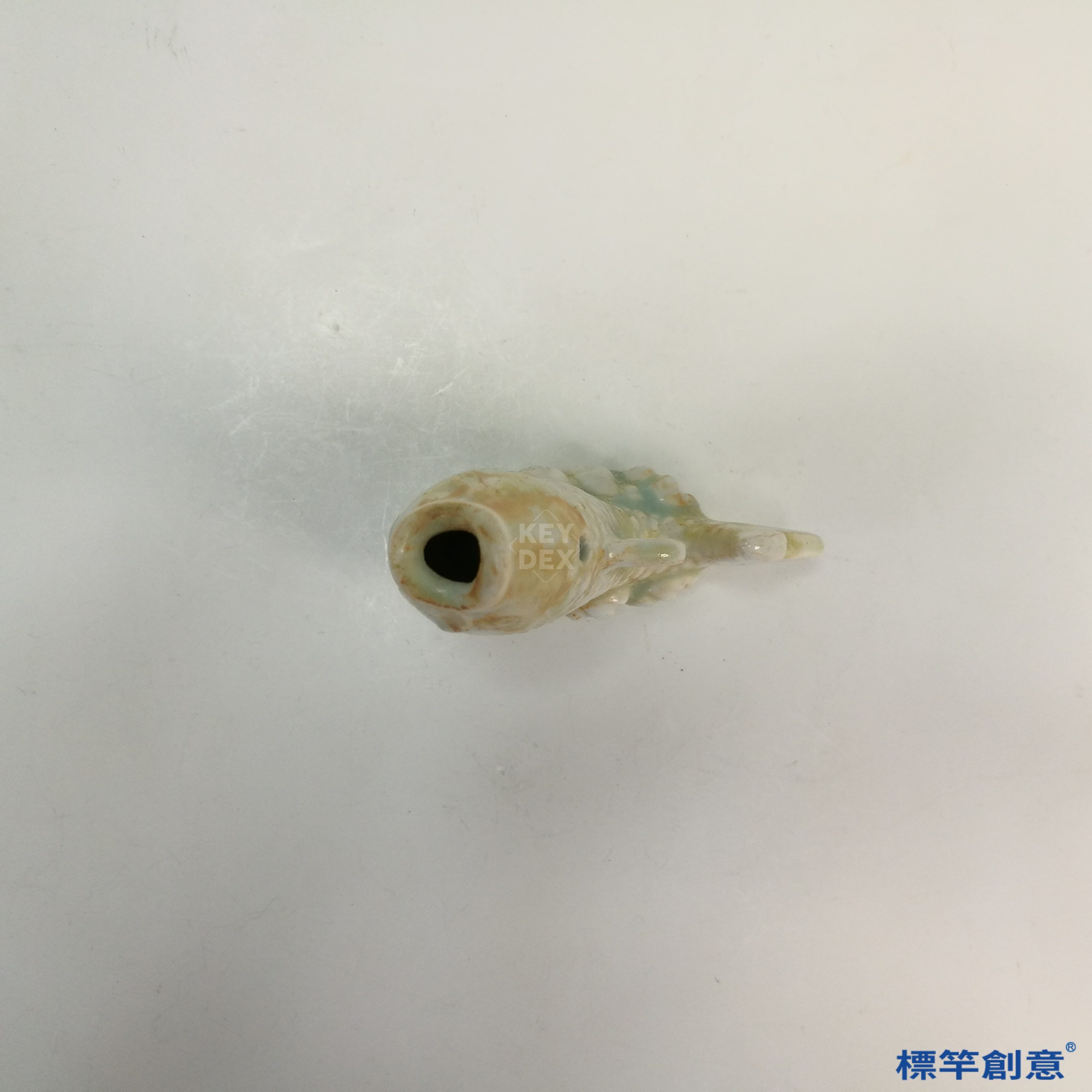 本器通長約11公分,通高約5公分,呈鯉魚形臥姿,口微張、尾上翹,體態生動自然。整體比例勻稱,為一件具象寫實的文房用具。