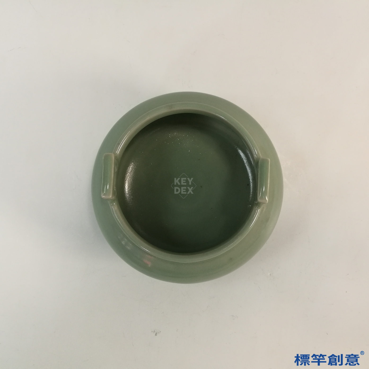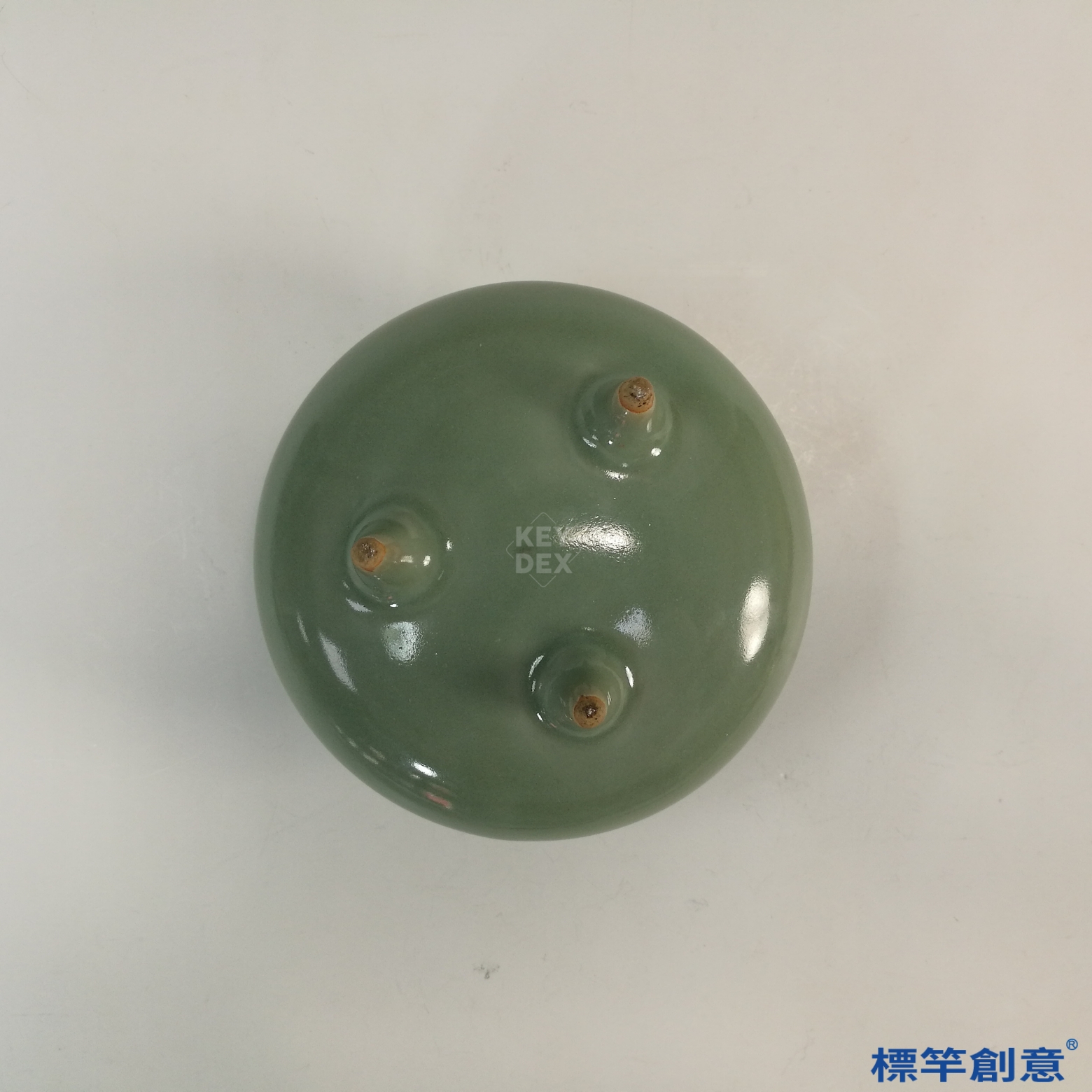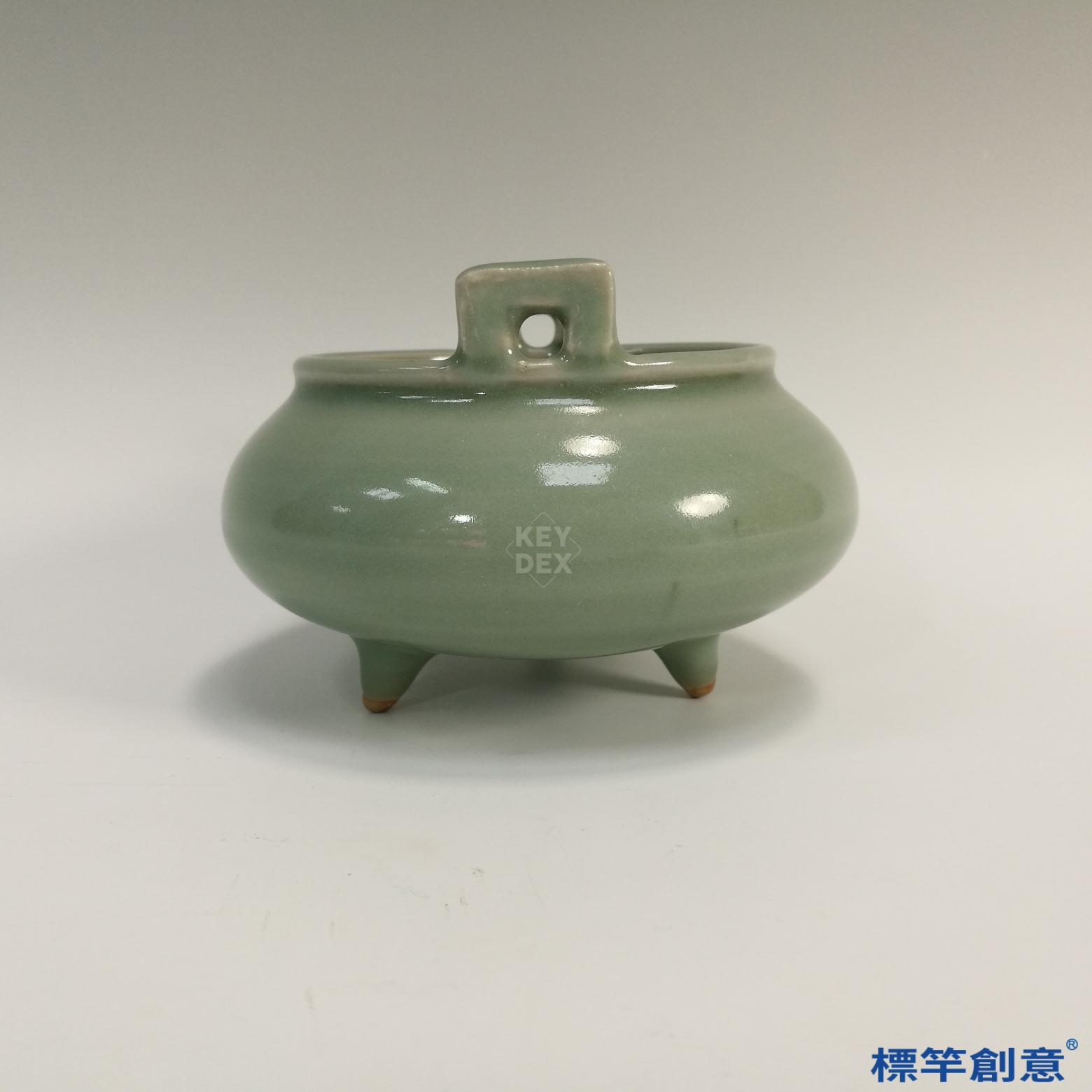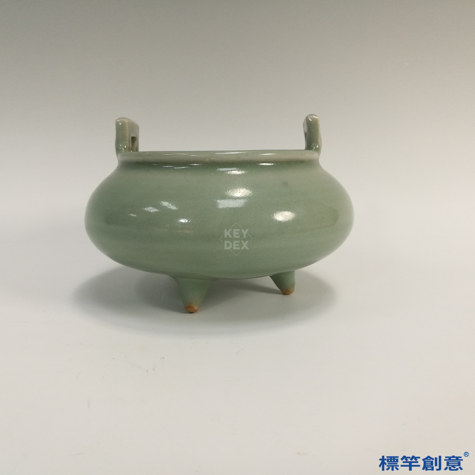 採分段成形法,三足與雙耳另塑後黏合,再通體施釉高溫還原燒成,溫度控制精準,釉面溫潤透亮,展現高超技藝。
