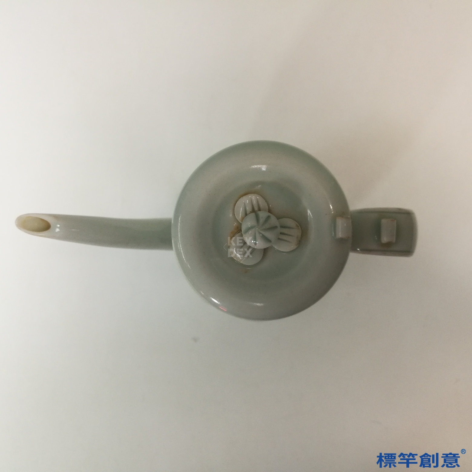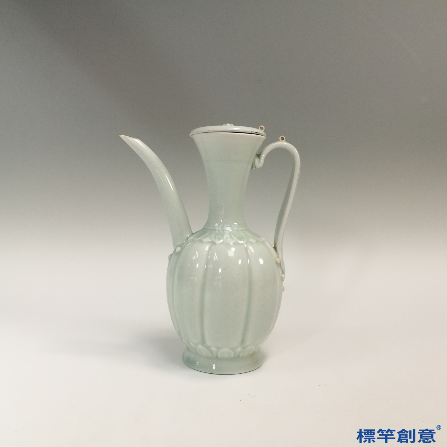 通體施青白瓷釉,釉色瑩潤帶微青,表面透明釉均勻,釉下呈現明顯瓜稜起伏,蓋與流、柄接合嚴密,整體工藝細緻。