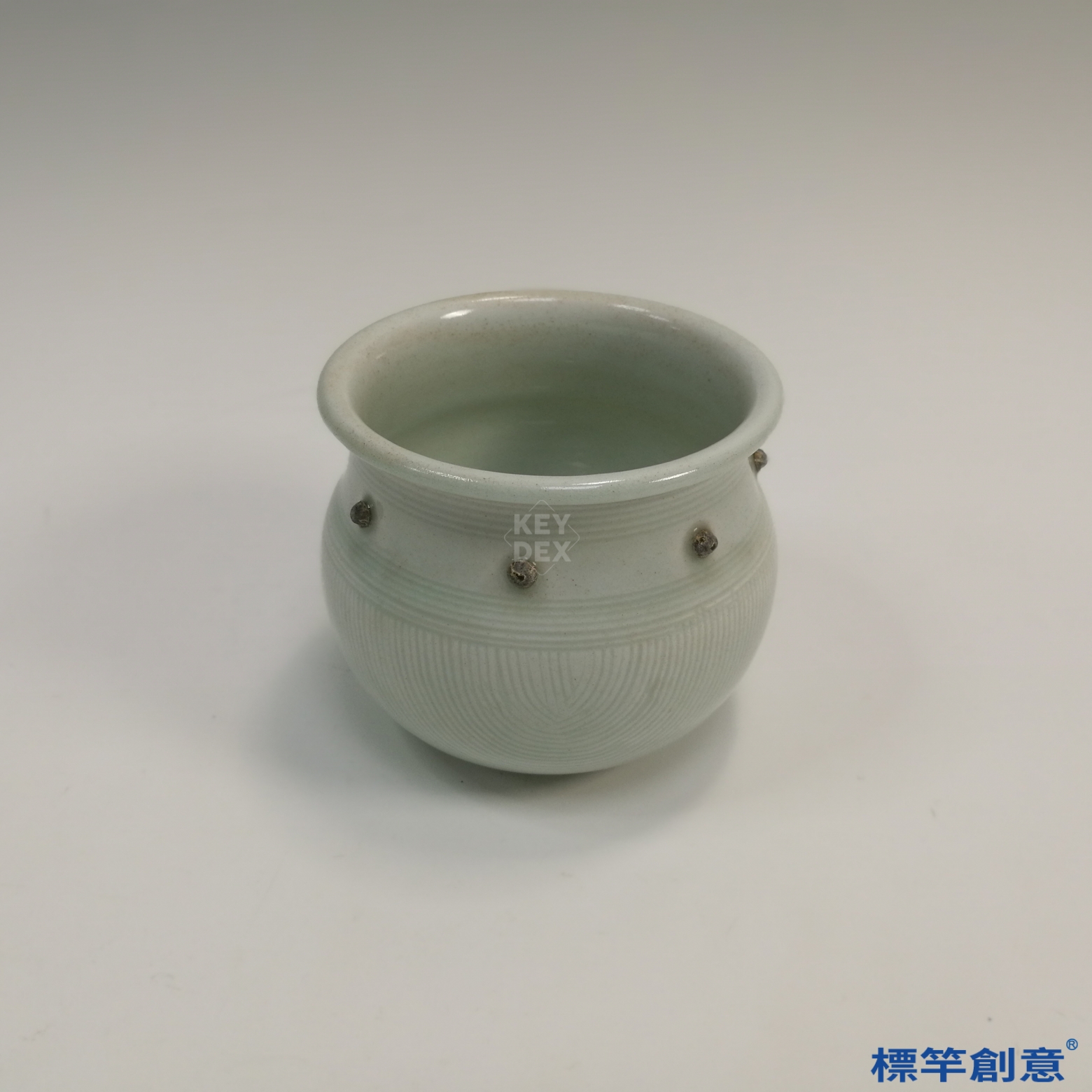 先拉胚成形,再雕飾柳斗紋,施釉後入窯高溫燒成,胎釉融合度高,顯現自然開片與乳白晶瑩之釉質。