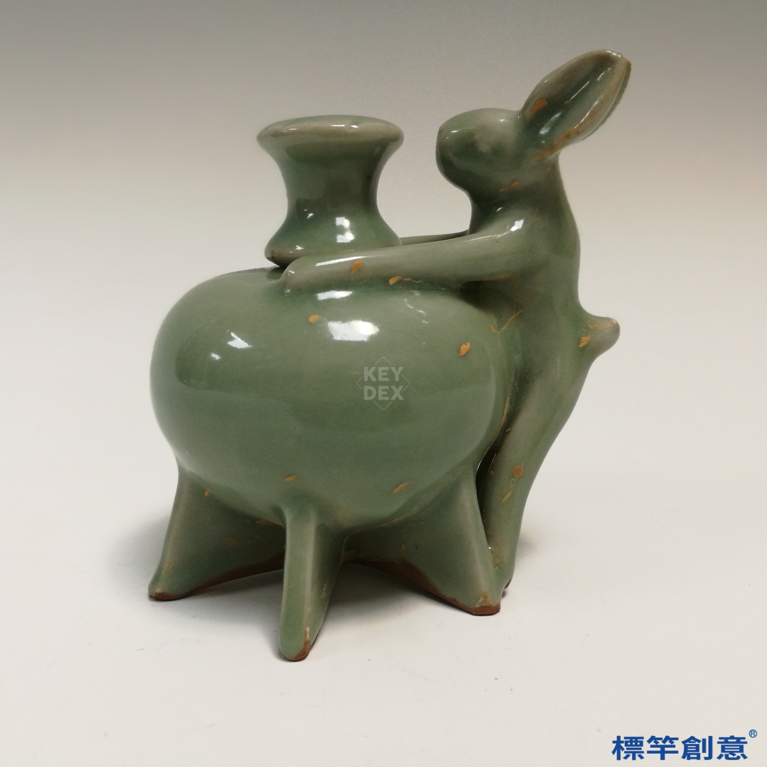 玉兔象徵月宮與仙獸,結合文房用途展現宋代文人審美與自然信仰交融,亦為宋代青瓷中少見的立體動物文具作品,極具收藏價值。