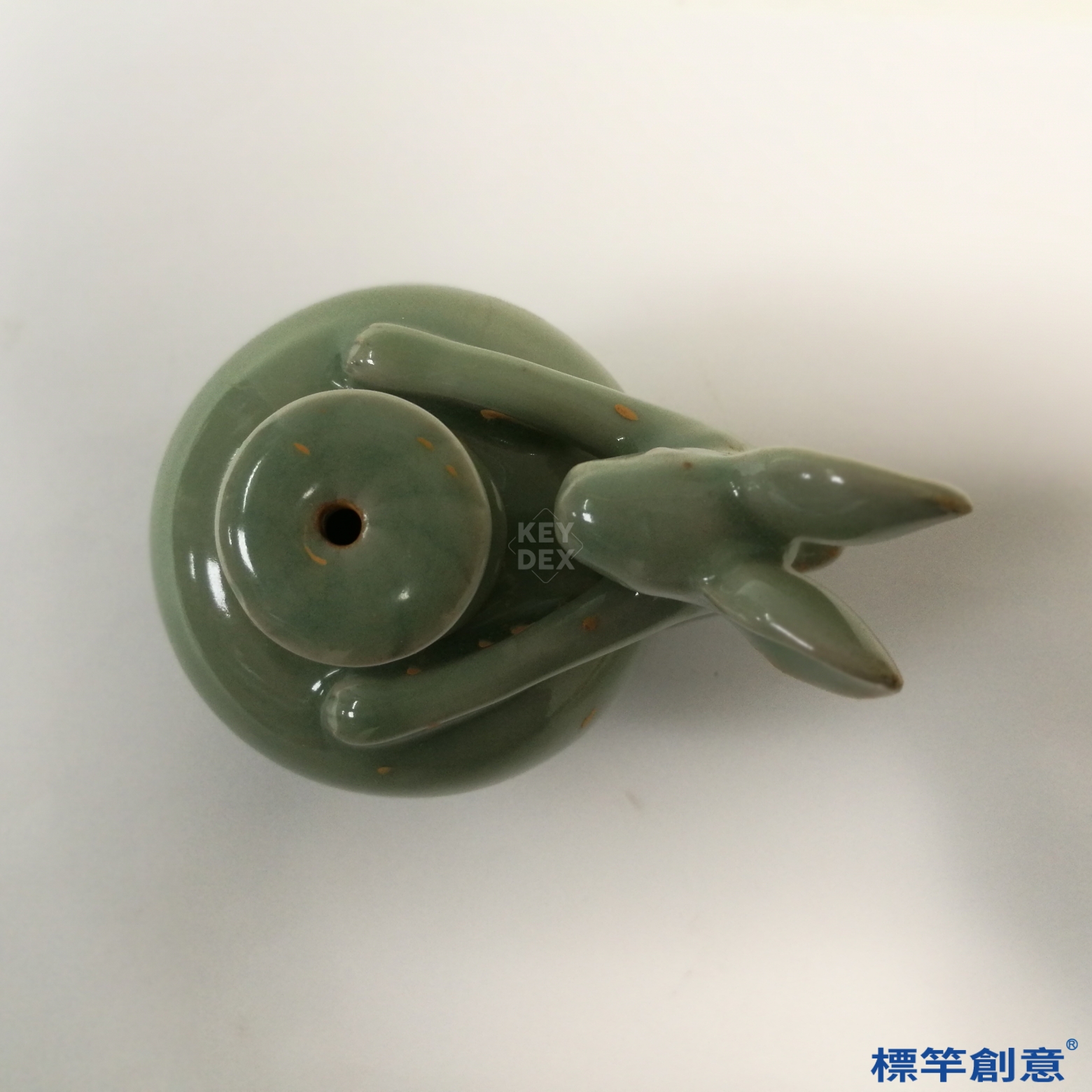 通體施粉青釉,色澤柔潤細膩,釉層厚實,兔形線條流暢自然,壺嘴、出水口與兔體銜接精巧,細節寫實,展現高超捏塑與裝飾技藝。