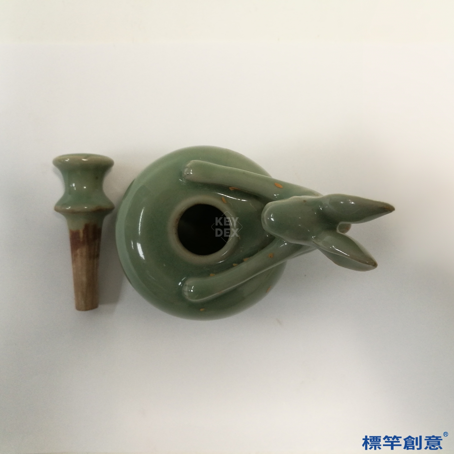 先模製兔形本體與注水口,再細修細節、安裝注水壺與孔道,通體施釉後經高溫燒成,控制氣氛以呈現清雅粉青色澤,燒成難度高。