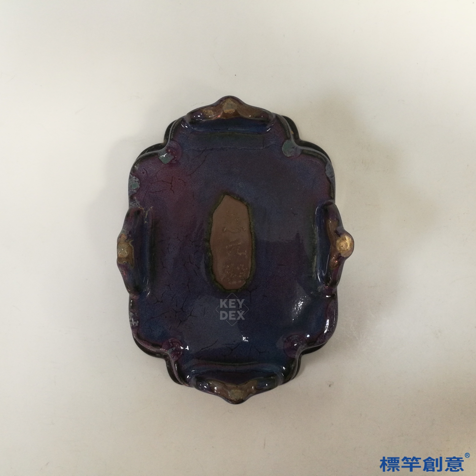 器形拉胚成形後修飾菱角稜線,先施天青底釉,再經還原焰高溫燒成,局部呈紫紅、天青、藍灰等自然過渡之窯變,並於底部寫款後施釉入窯,胎釉結合緊密。