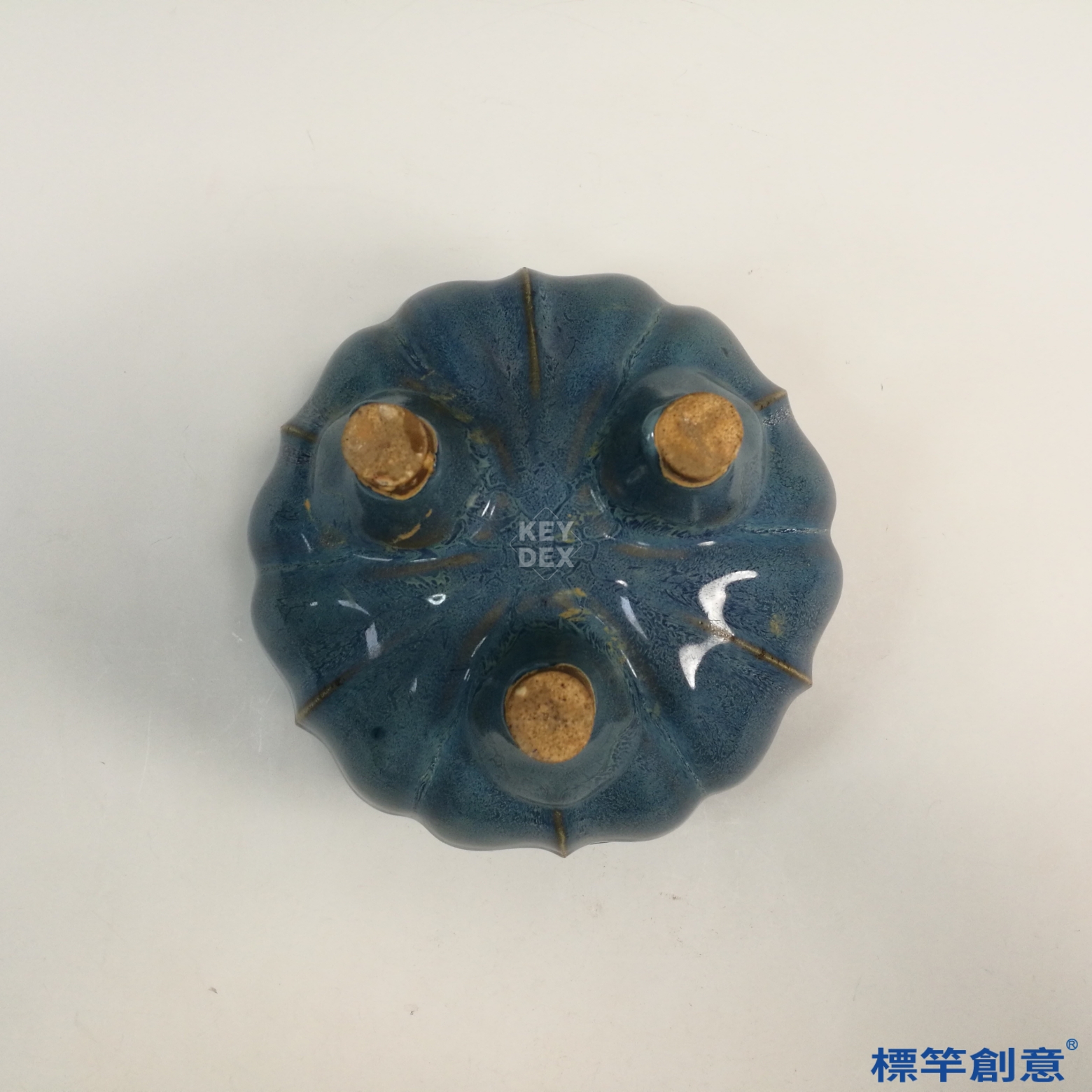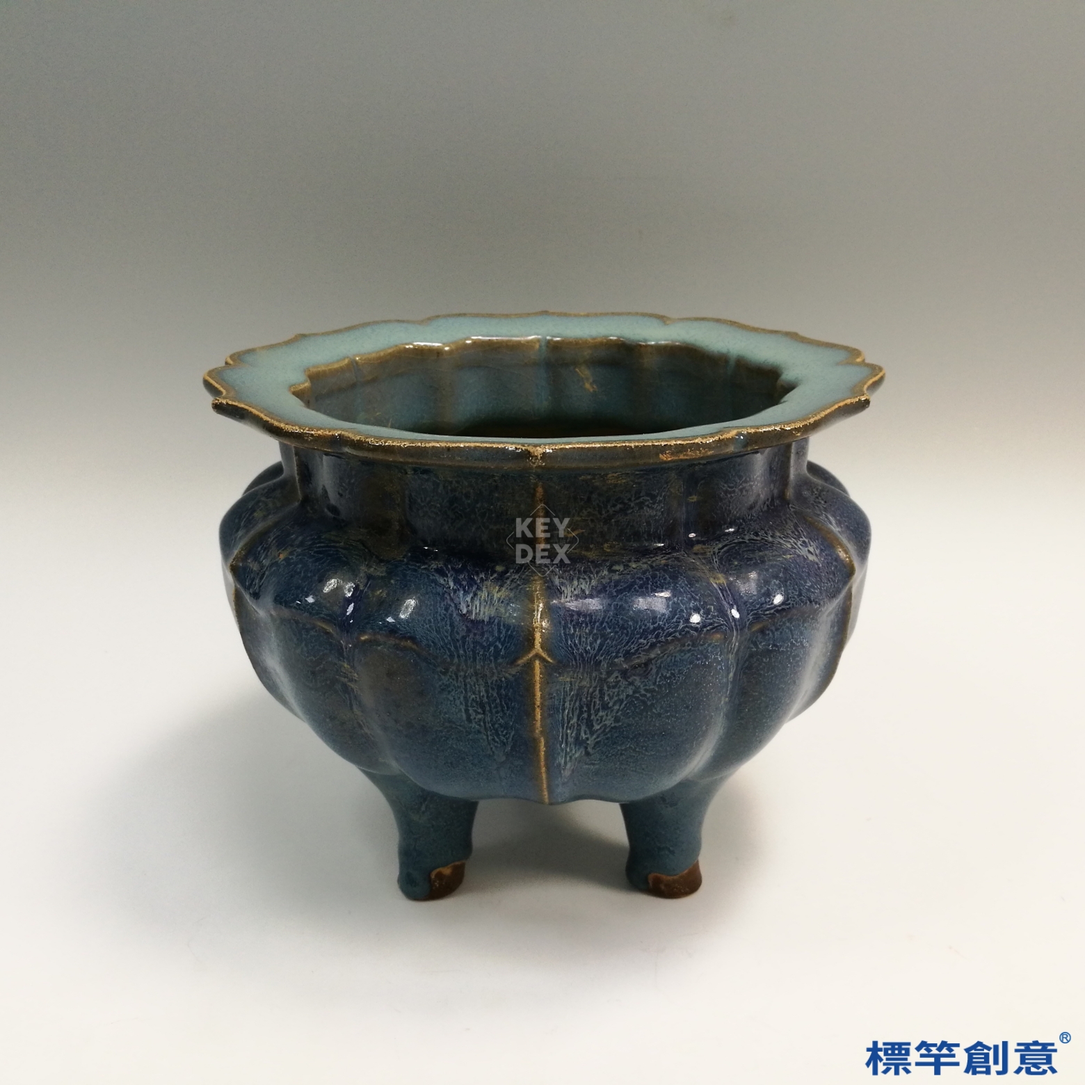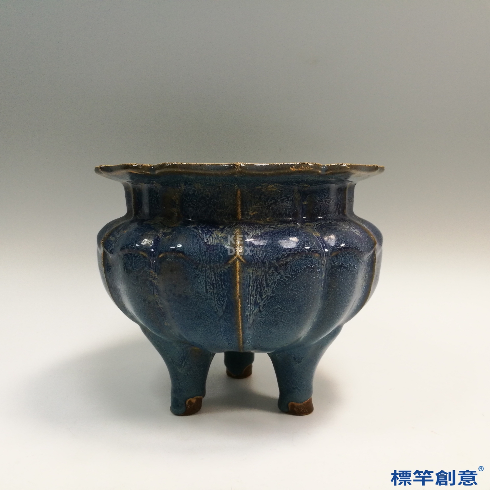 先拉胚成形後塑造多稜花口與三足結構,再經覆釉入窯高溫還原燒成,釉藥自然流淌、交融變化,形成天藍釉中帶紫紅斑之鈞窯特色。