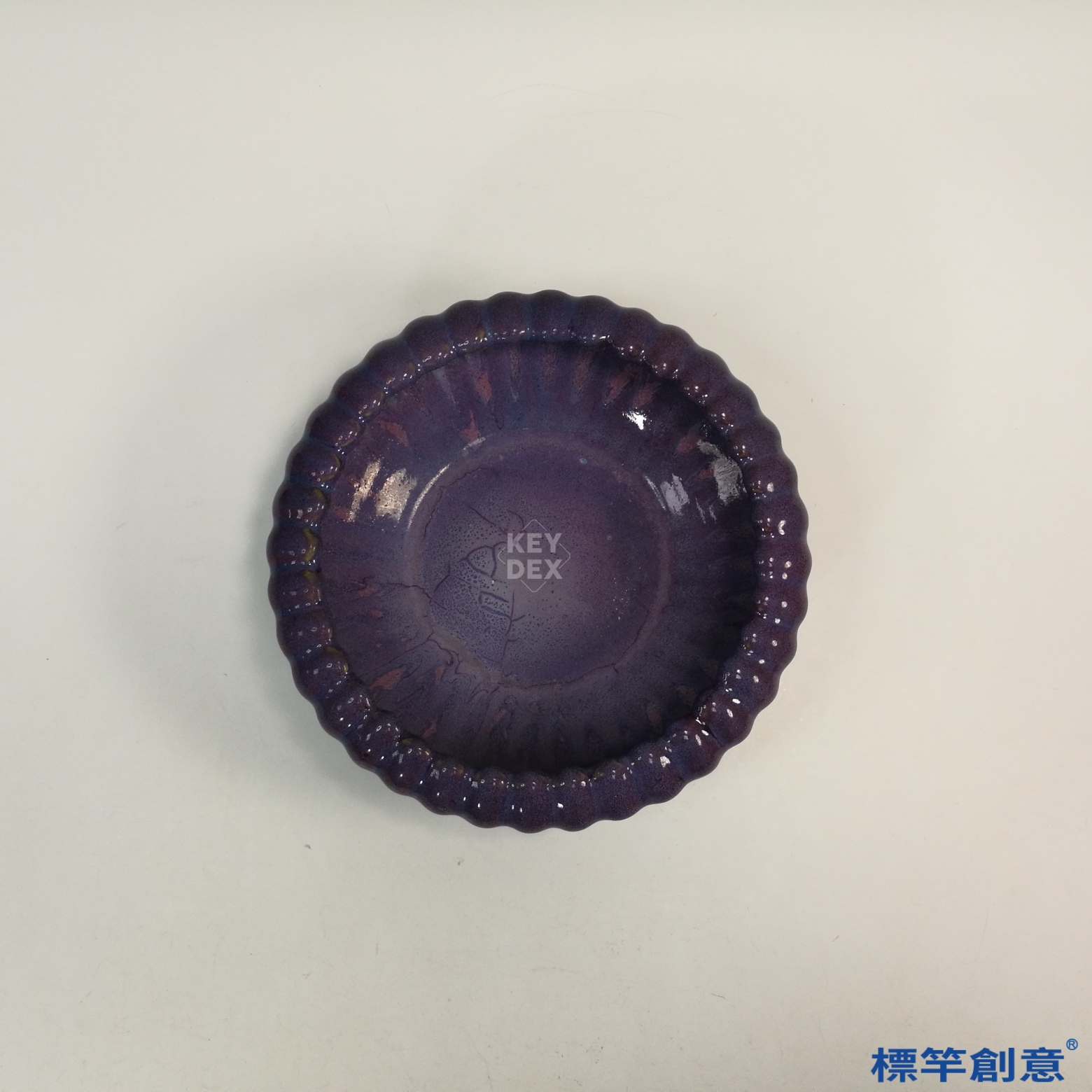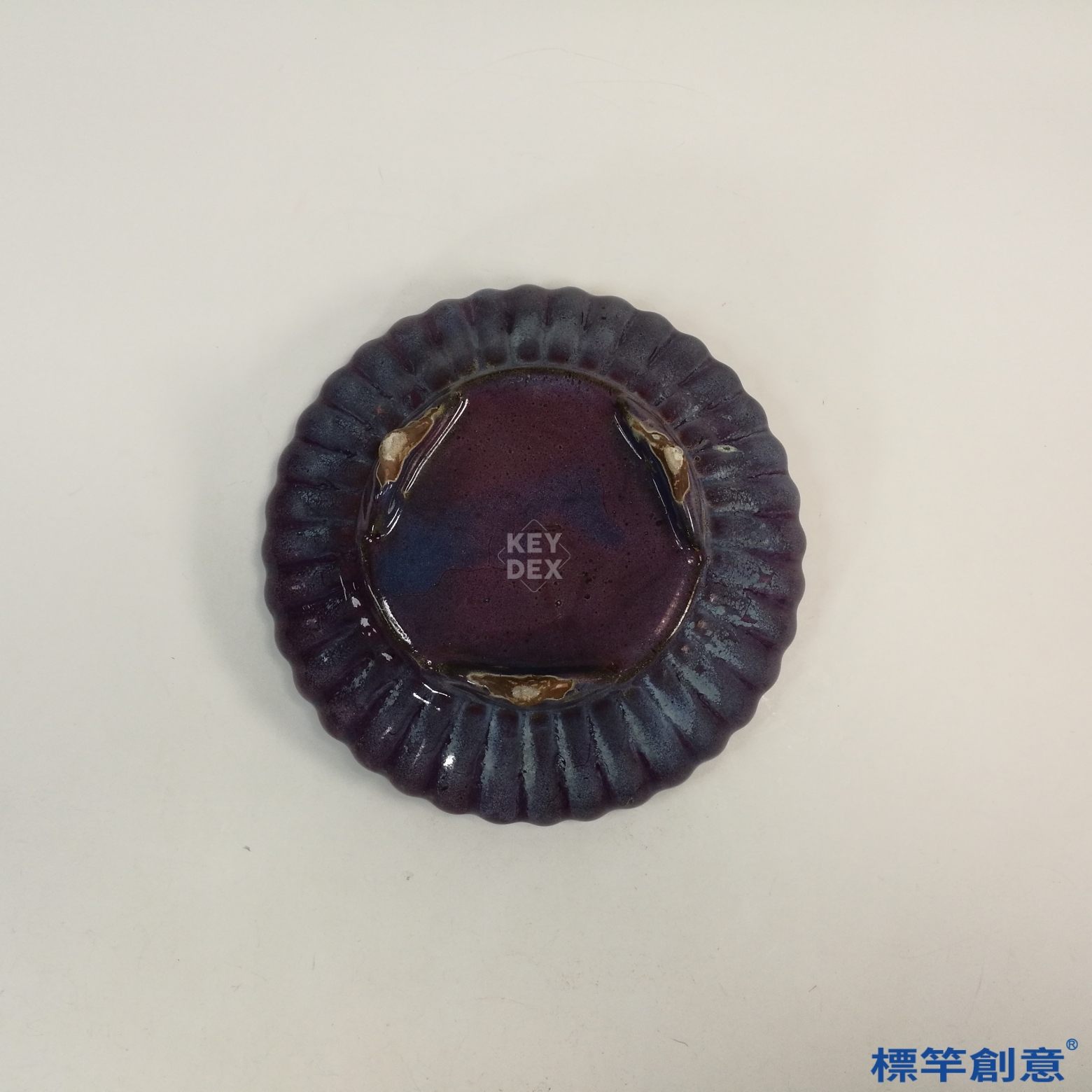 通體施紫紅釉,釉色濃郁飽滿,於起伏輪廓間自然流淌,並帶有些微藍斑與釉縮處,釉層厚潤,隱現銀光。菊瓣外形源自模印成形,釉色於凹凸之間產生視覺層次,極富裝飾效果。
