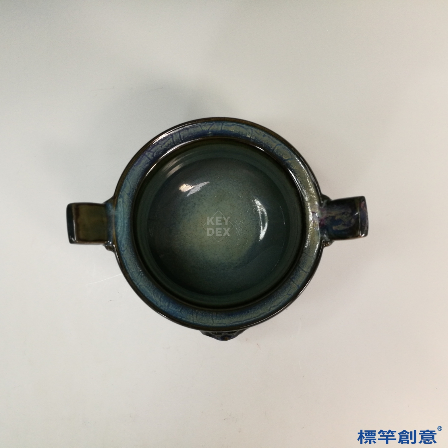 先模製鬲形胚體,另雕獸面耳後接於兩側,再整體施釉,以還原氣氛高溫燒成,使天藍與紫斑自然過渡,顯示控制火候與釉流技巧之高超。