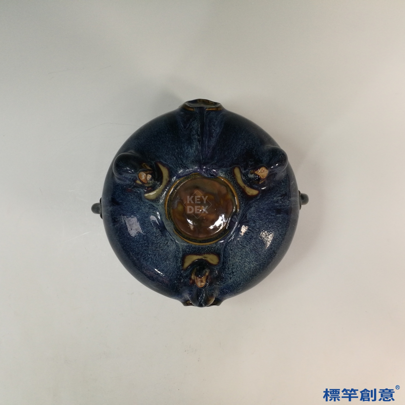 通體施天藍釉,局部有紫斑自然流淌,構成絢麗釉彩對比。釉面開片細密,呈潤澤玉質感,獸面耳浮雕立體,為塑形與釉色交融之佳作。