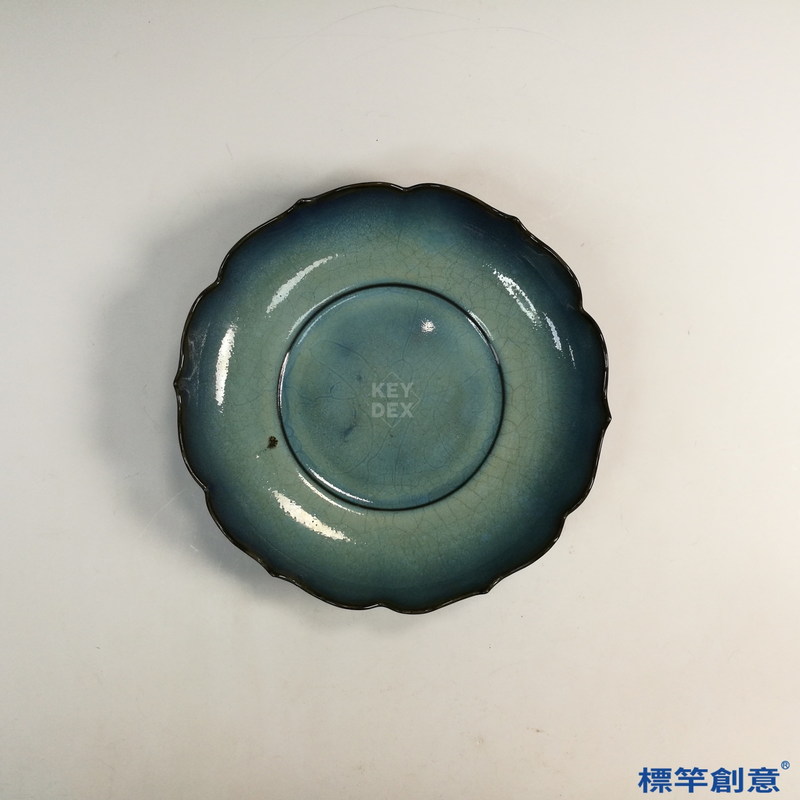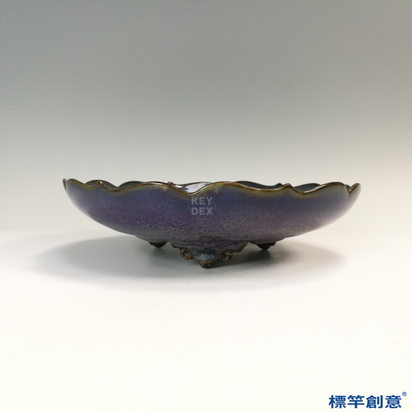 通體施紫紅釉,花口外沿見深紫微泛褐黑,盤心與凹部呈現藍灰流釉,隱約泛光,色階變幻自然。釉面具明顯蟹爪紋開片,釉色分佈具有「窯變」特色,為鈞窯釉藝的典型表現。