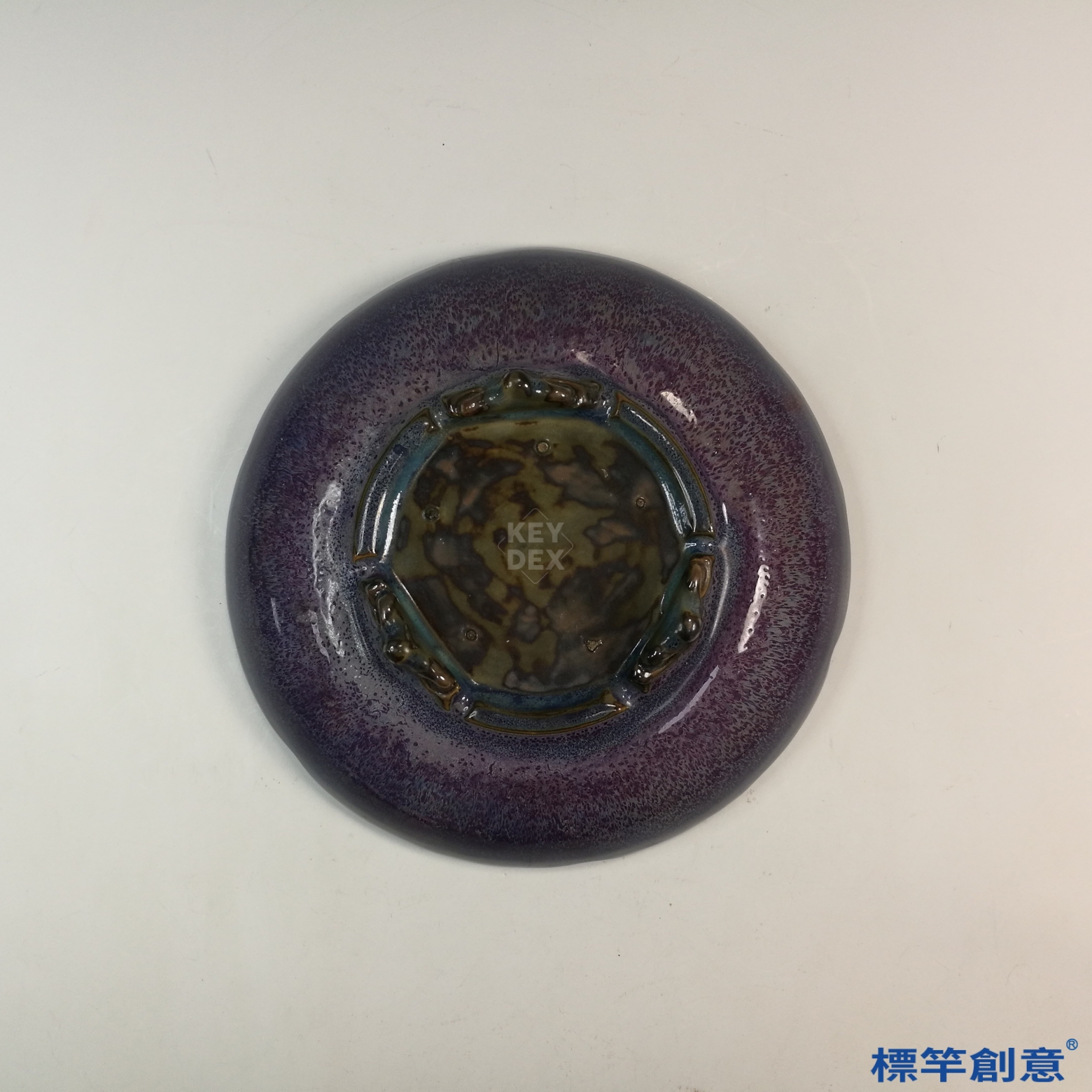 採精煉黏土為胎,高溫一次還原燒成,成形後以低鐵高鉀釉全器通施,置入匣缽中墊以支釘燒製。盤底三足痕明顯,為典型支燒痕跡。