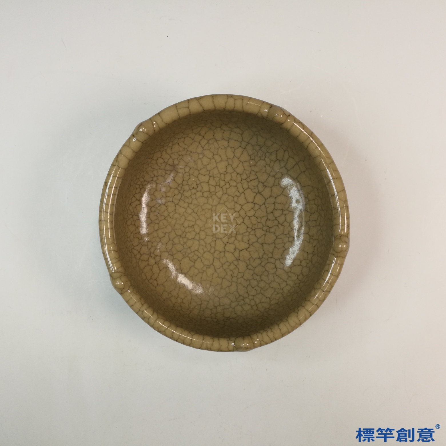 此器以細緻灰白胎燒製,先經修坯成型,再以高溫釉料施釉後一次燒成。開片乃冷卻過程中釉面收縮不均所致,需長時間自然氧化顯現紋理。