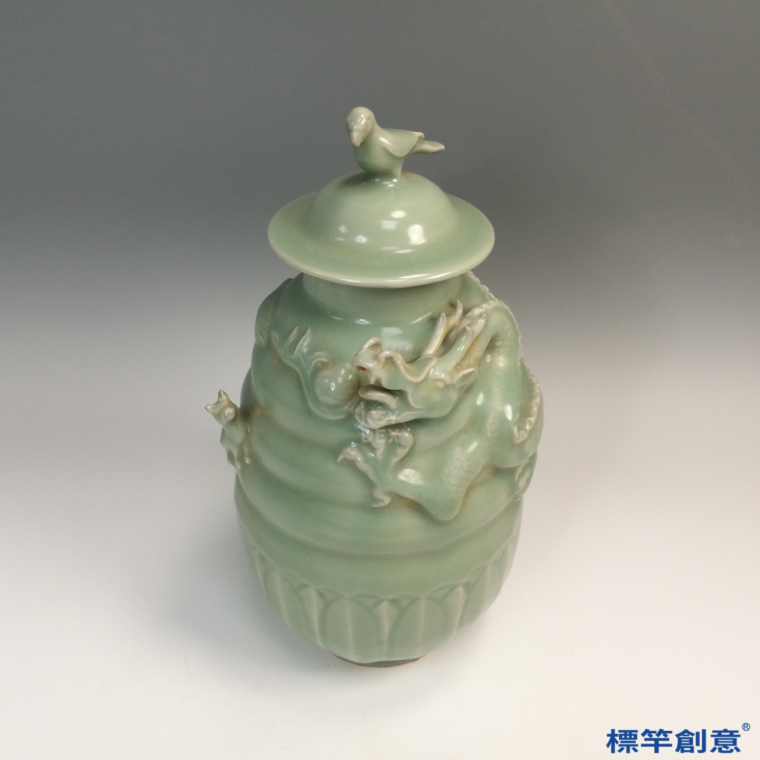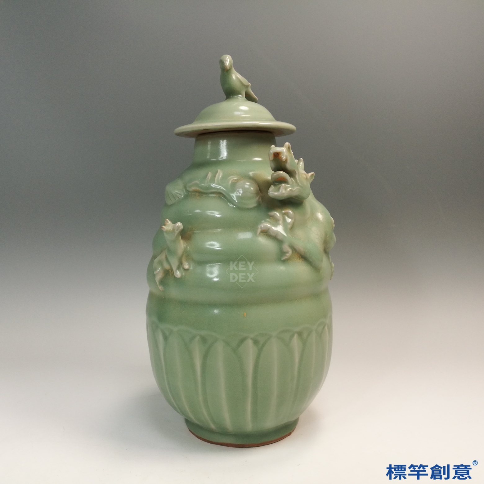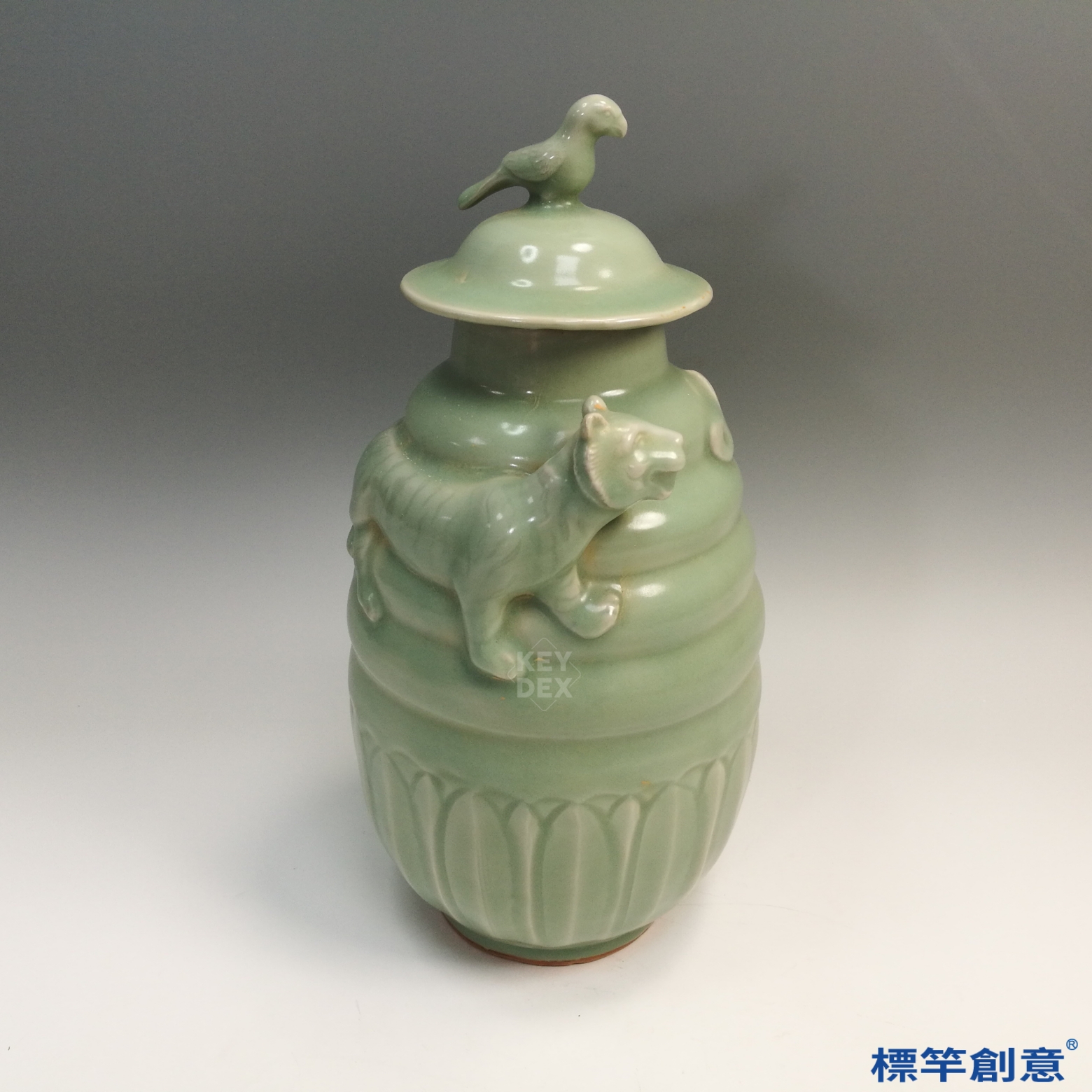 全器施粉青釉,釉色柔潤青翠,均勻覆蓋器面。貼塑技法細膩,龍虎造形威猛而富動感,蓋面禽鳥造型莊嚴穩定,整體表現出宗教與辟邪意涵。胎體厚重,胎質細緻堅實。