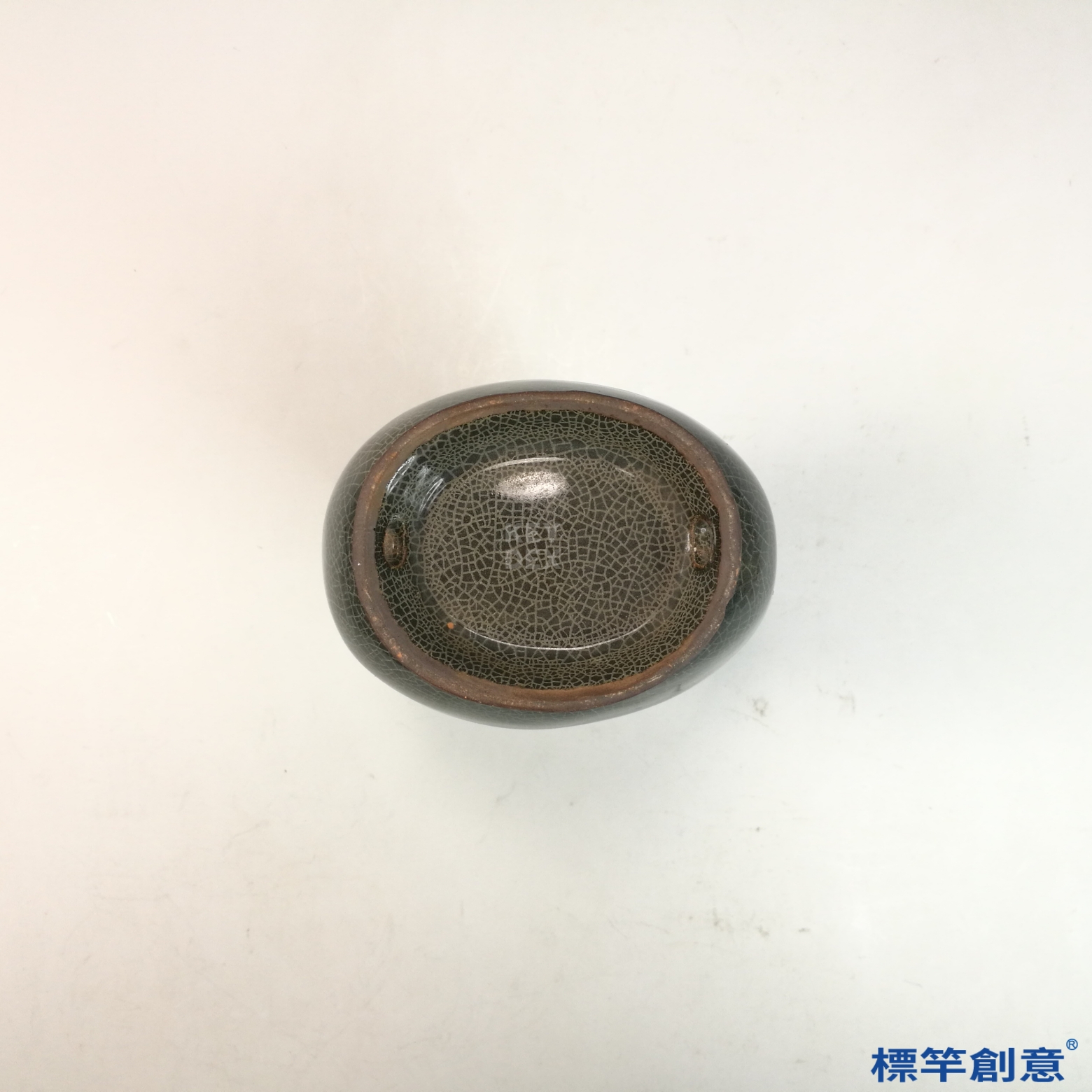 全器施灰黑釉,釉面光潤細膩,色澤均勻穩重。胎體為黑色胎土,通體佈滿開片,具明顯哈密瓜狀紋理,為溪口窯特有視覺特色。貫耳修飾勻稱,與圓潤器身形成鮮明對比,兼具結構與美感。