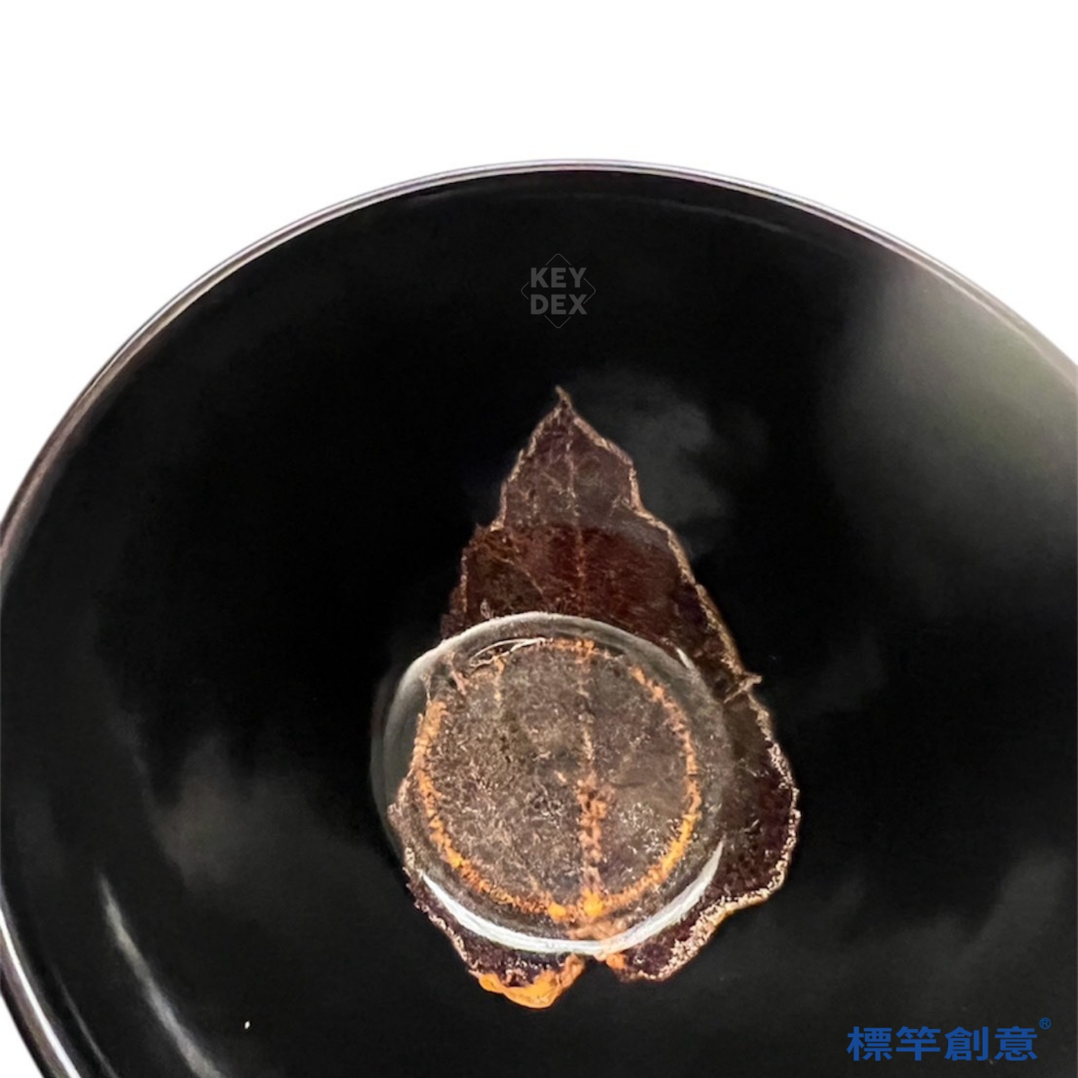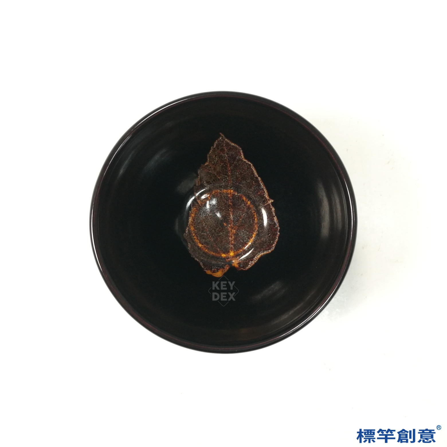 採天然落葉,貼附於胎體後施釉燒製,葉片經高溫燒蝕,留影於釉下,呈現獨特「葉中有脈、脈中有骨」之自然紋理。技術要求高,成品率極低。