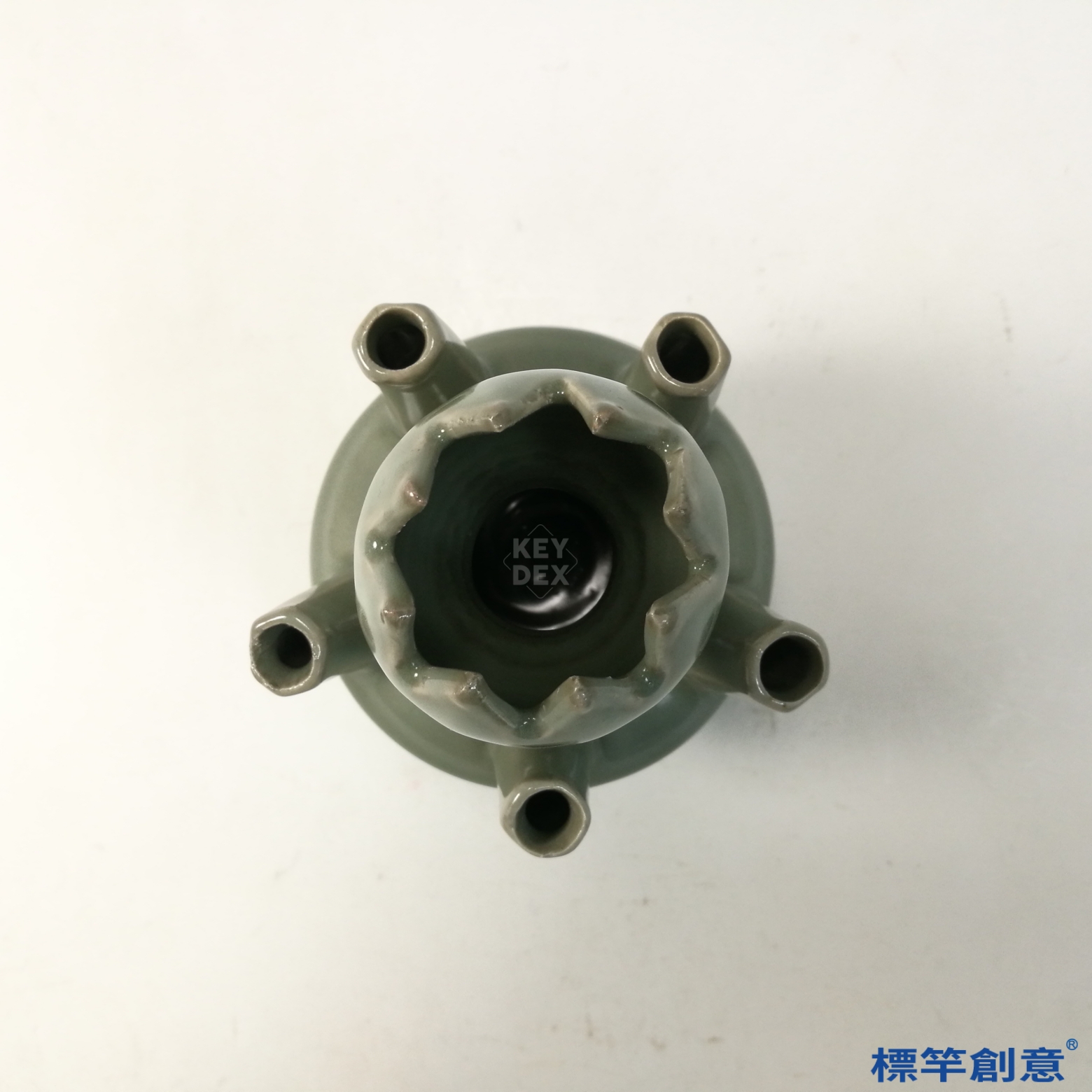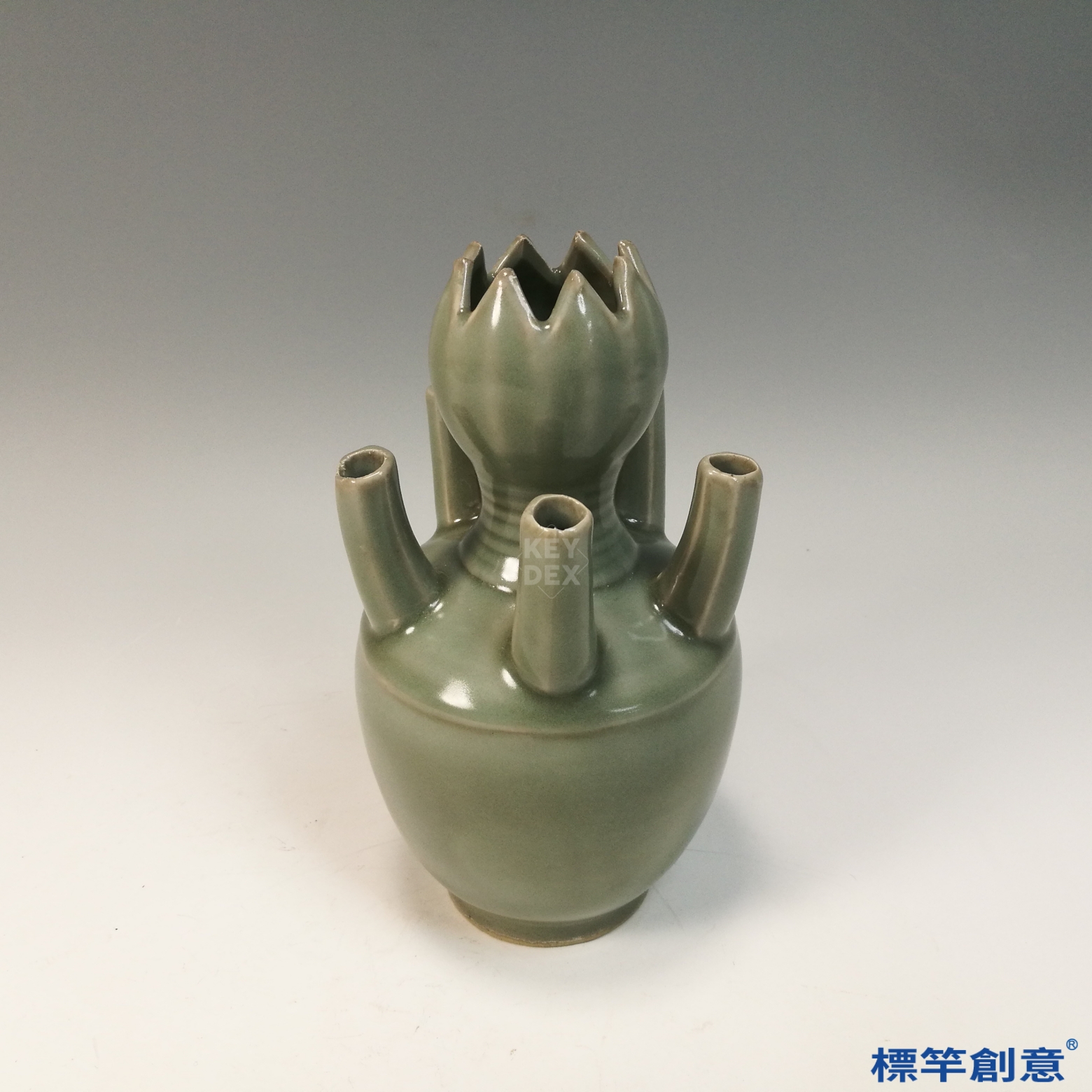 器表通體施粉青釉,釉面光潤細膩,色澤溫雅,釉層厚潤猶如碧玉。器身以模製與手工結合成型,五支管道分佈均衡,主管略高於四側小管,蓮瓣形口沿修飾繁麗,顯示極高的製作技術水準。