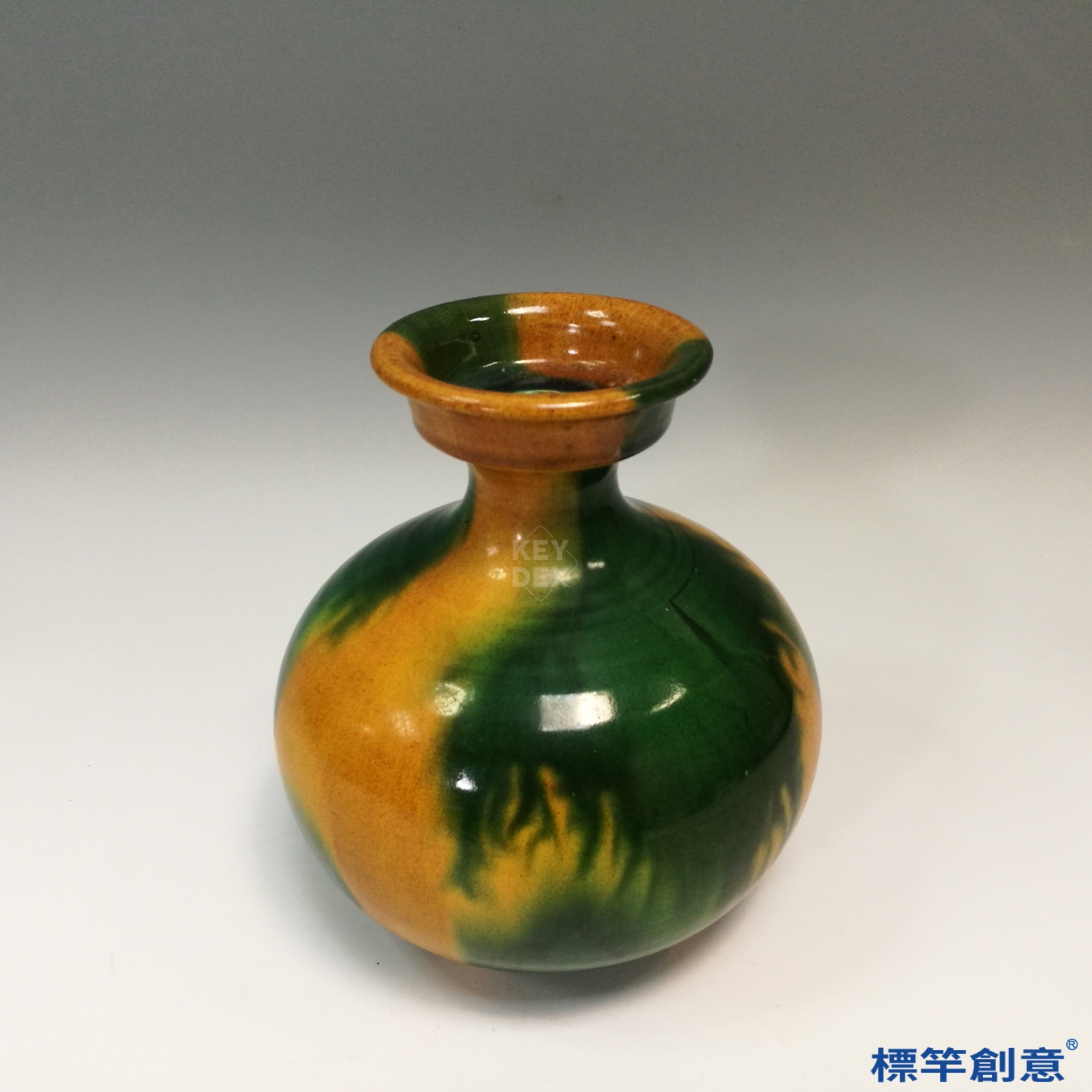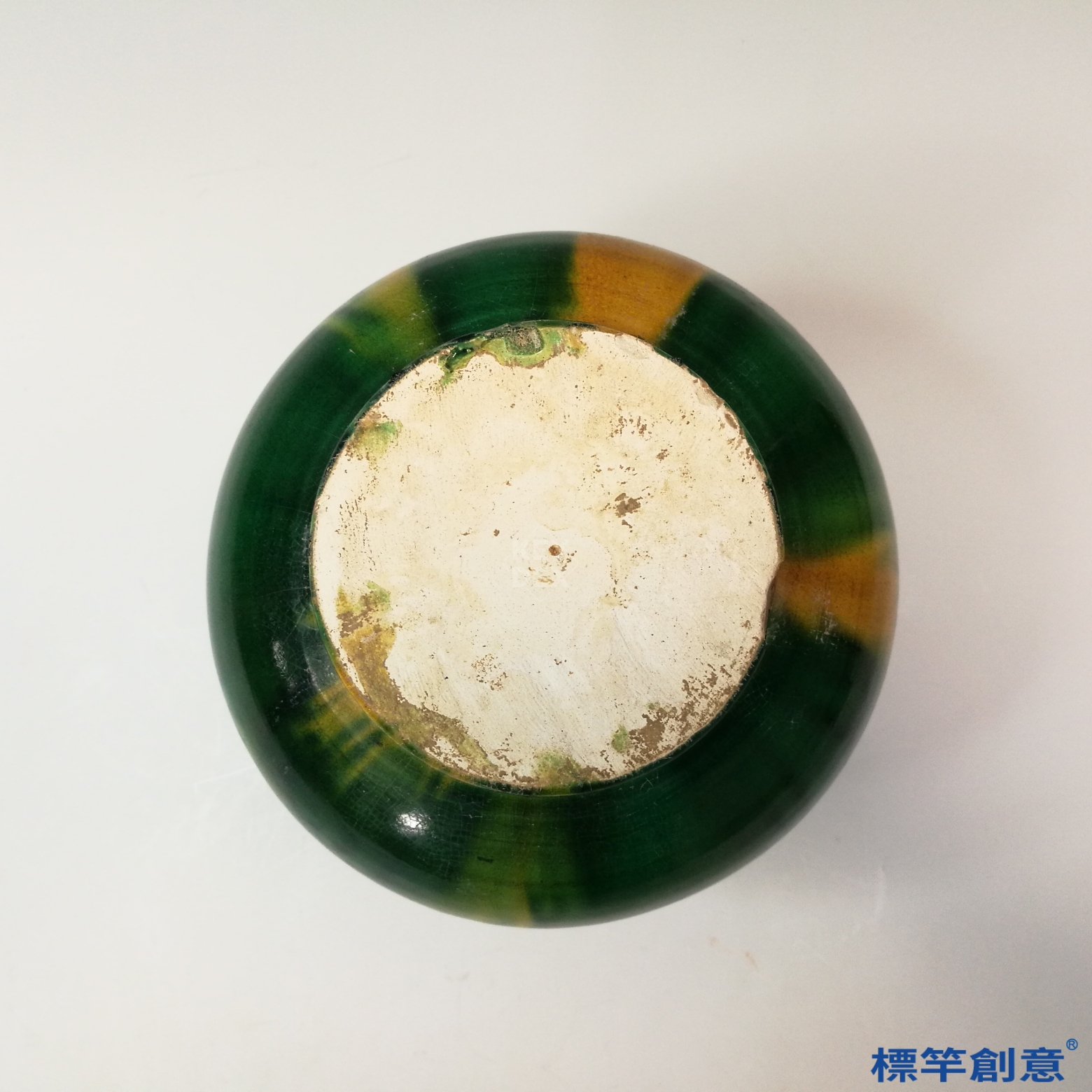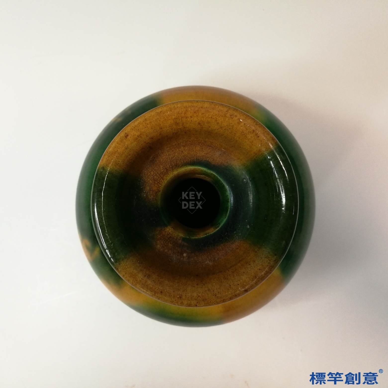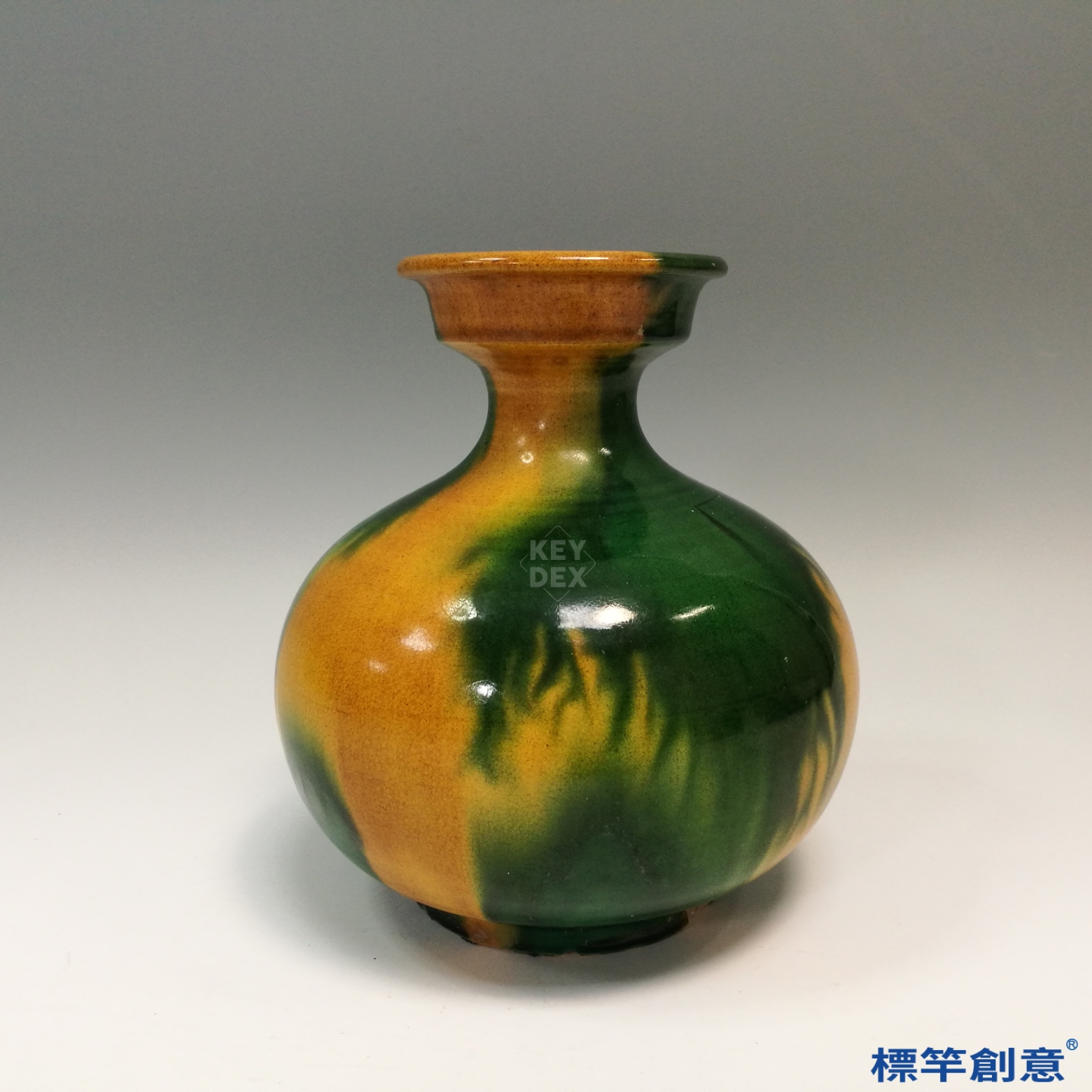 以細質陶土為胎,高溫素燒後施以鉛釉著色,再入窯經約800℃還原燒成,釉色於燒製過程中自然垂流,形成三彩交錯的視覺效果。