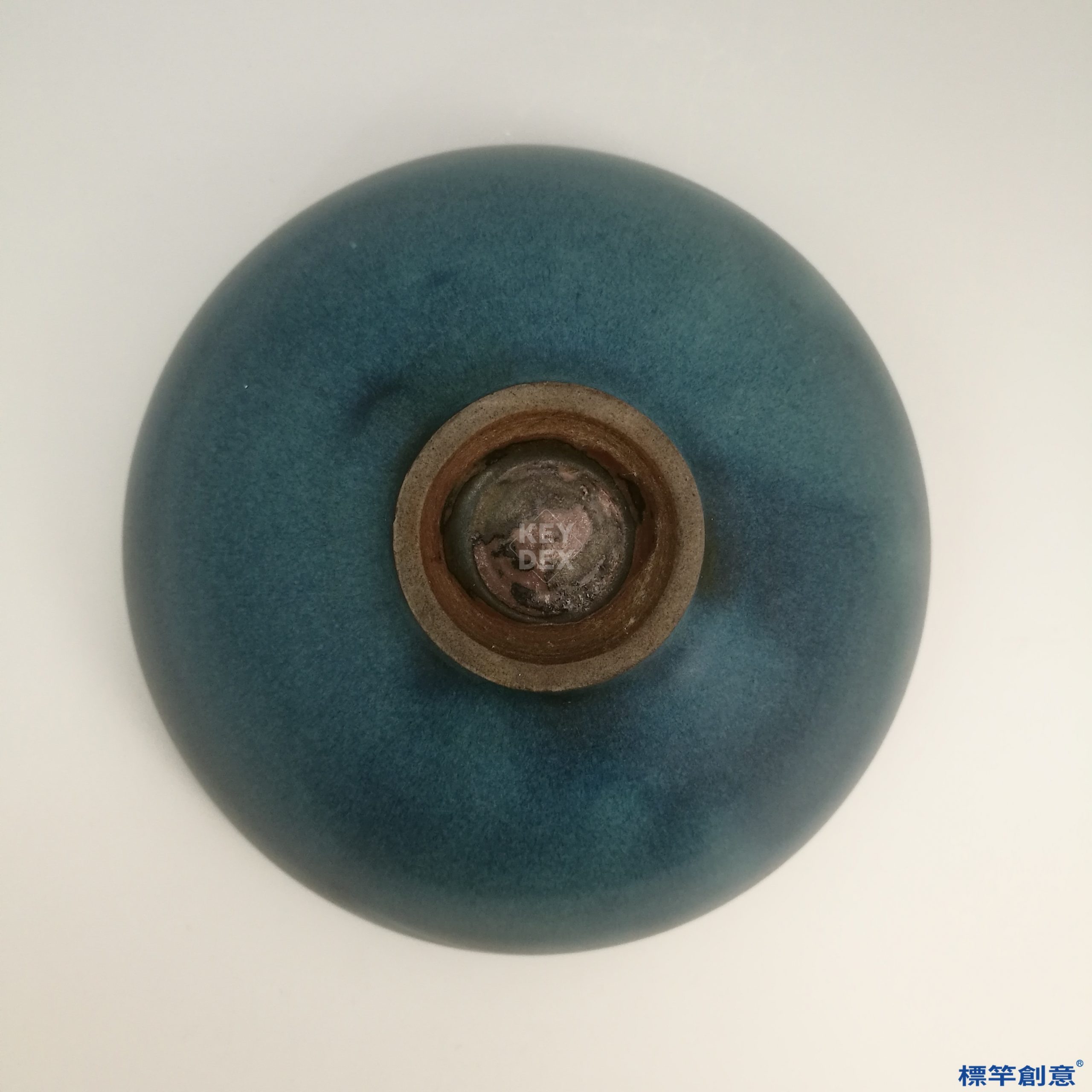 通體施天藍釉,釉面滋潤凝厚,釉質微泛暈光。碗內釉心自然浮現一片紫斑,與天藍釉色交融呈現暈染效果,為鈞釉典型「窯變」特色。底部露胎呈紅褐色,質地細密堅實,圈足修整整齊,為器身提供穩固支撐。