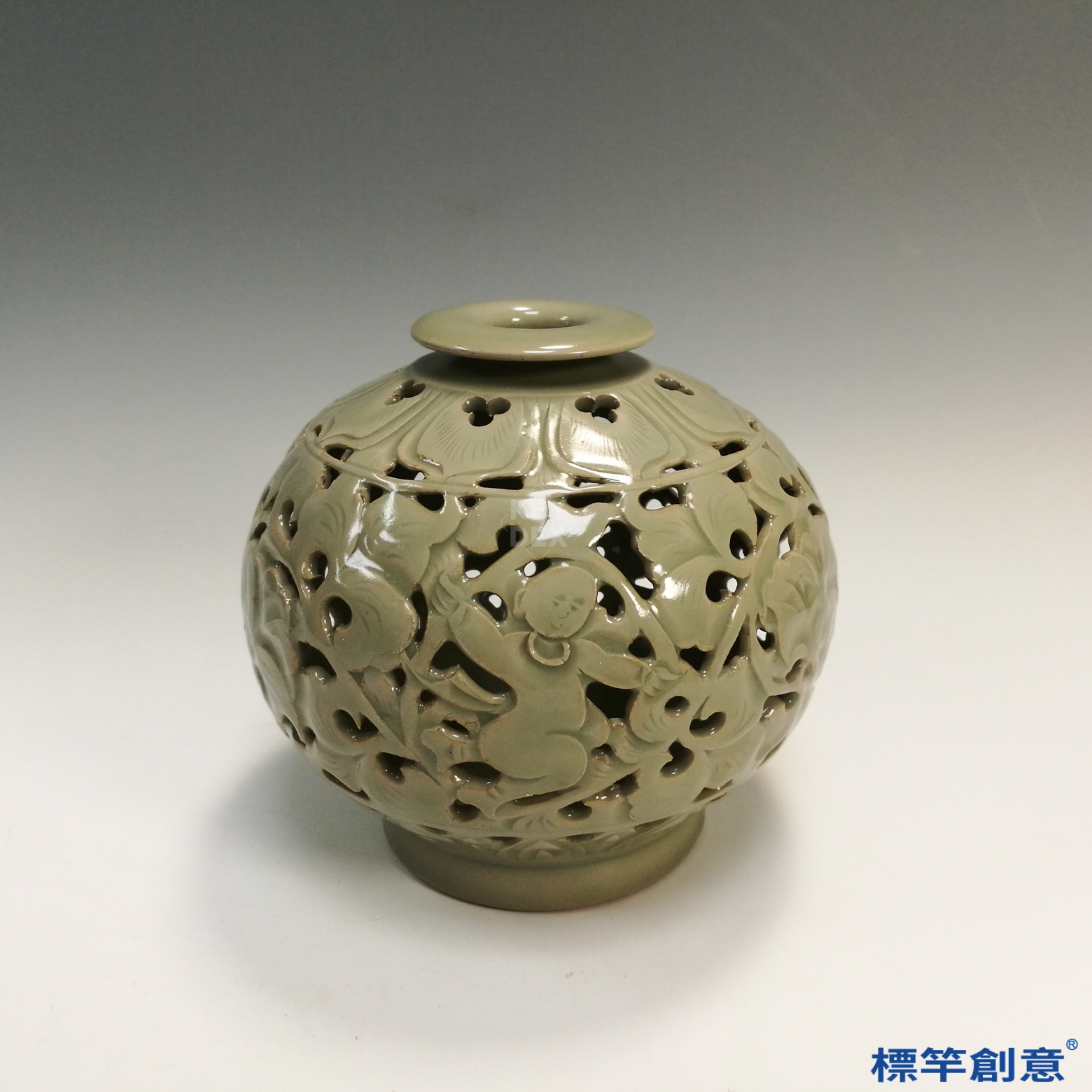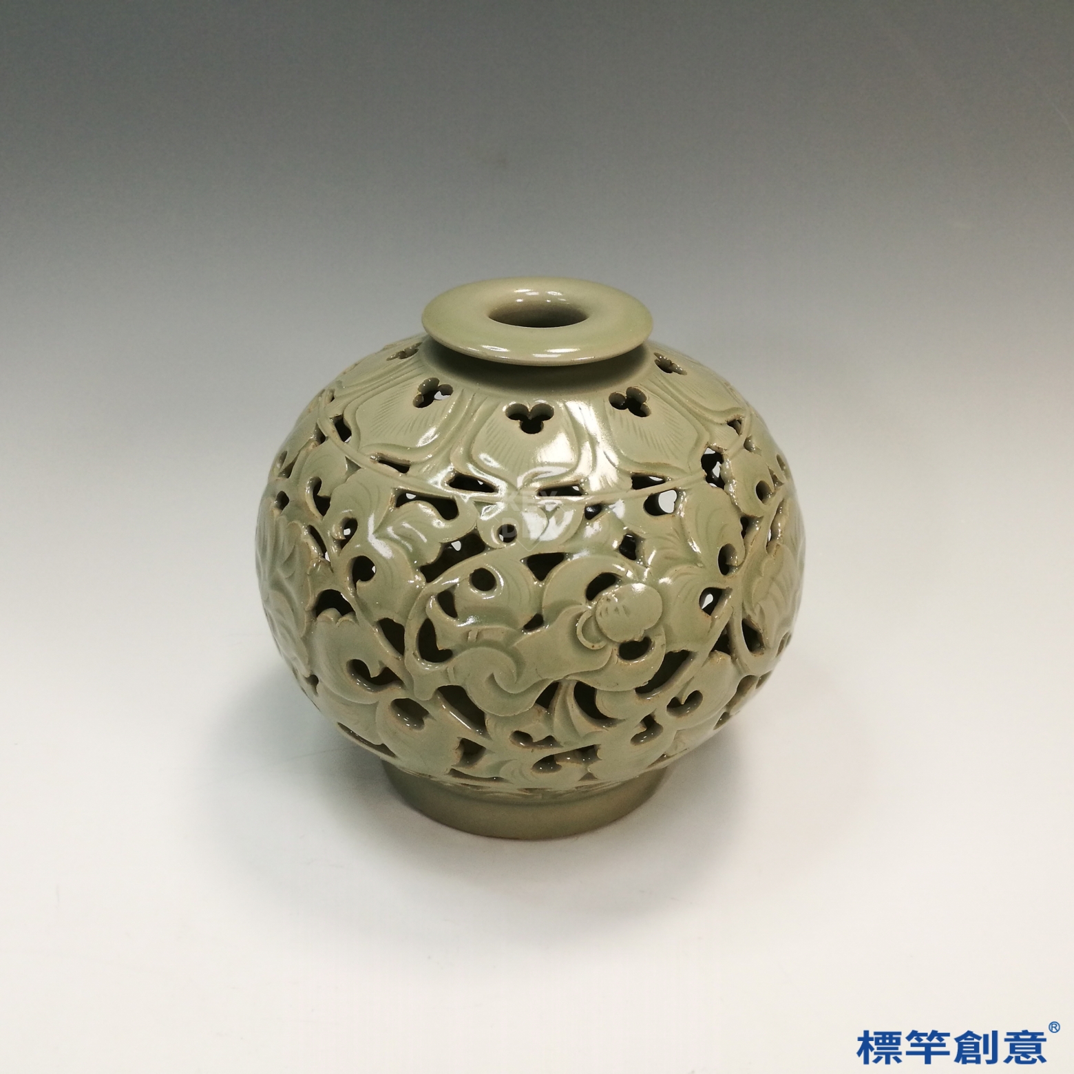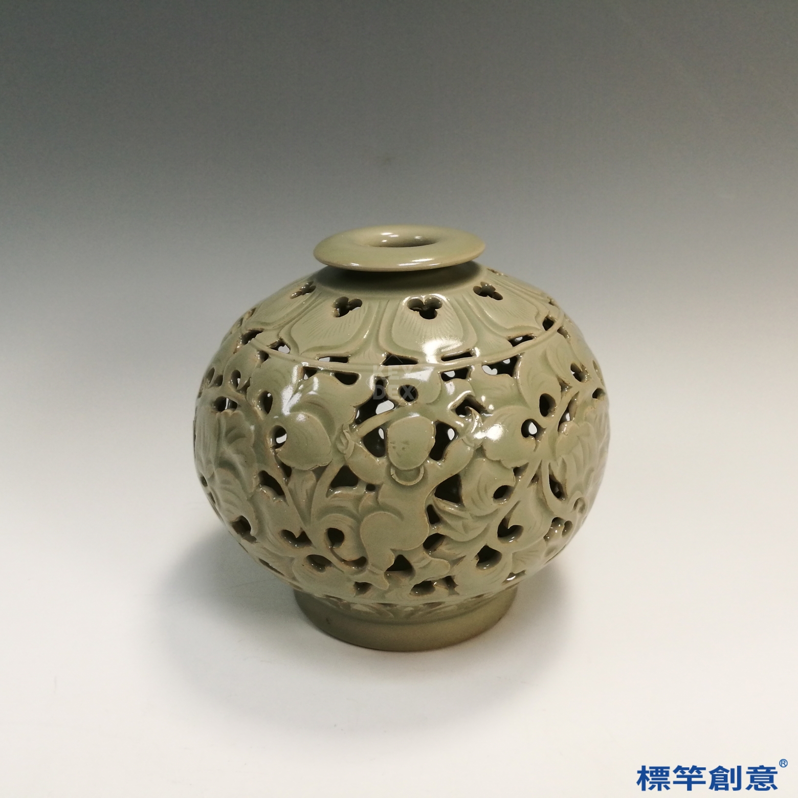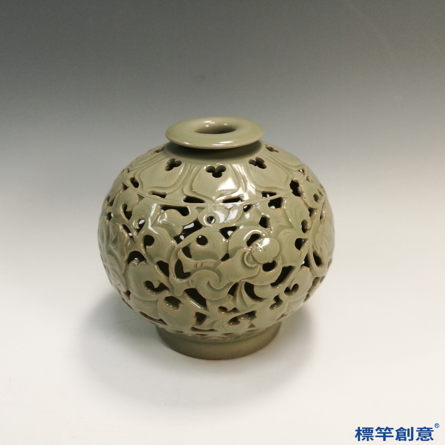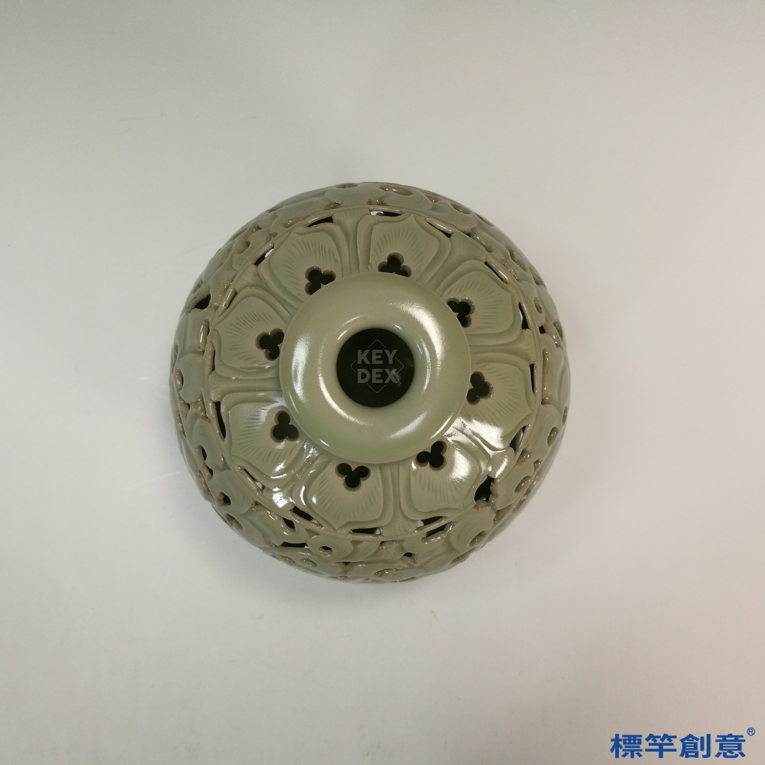先成內瓶,後以薄胎雕鏤花卉外罩套合之,再施釉一體燒成。鏤空需依器型作預先套合設計,並在高溫還原氣氛中一次燒製成功,展現耀州窯複雜成型與控火技術。