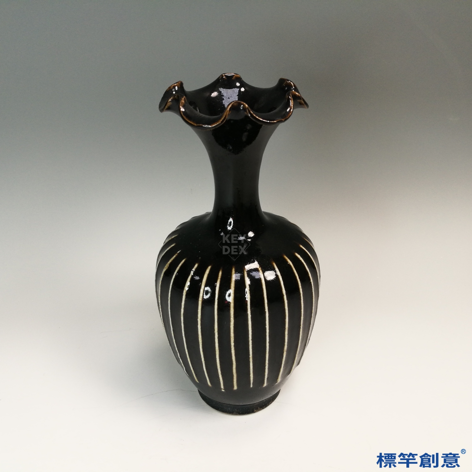 瓶身通體施黑釉,釉質厚潤光潔,光澤如漆。以剔刻技法雕出多道垂直白線條紋,筆直均勻,線條潔白突起,對比鮮明,具有強烈裝飾效果。花口亦經細緻修整,造型飽滿圓潤,展現高超製瓶工藝。