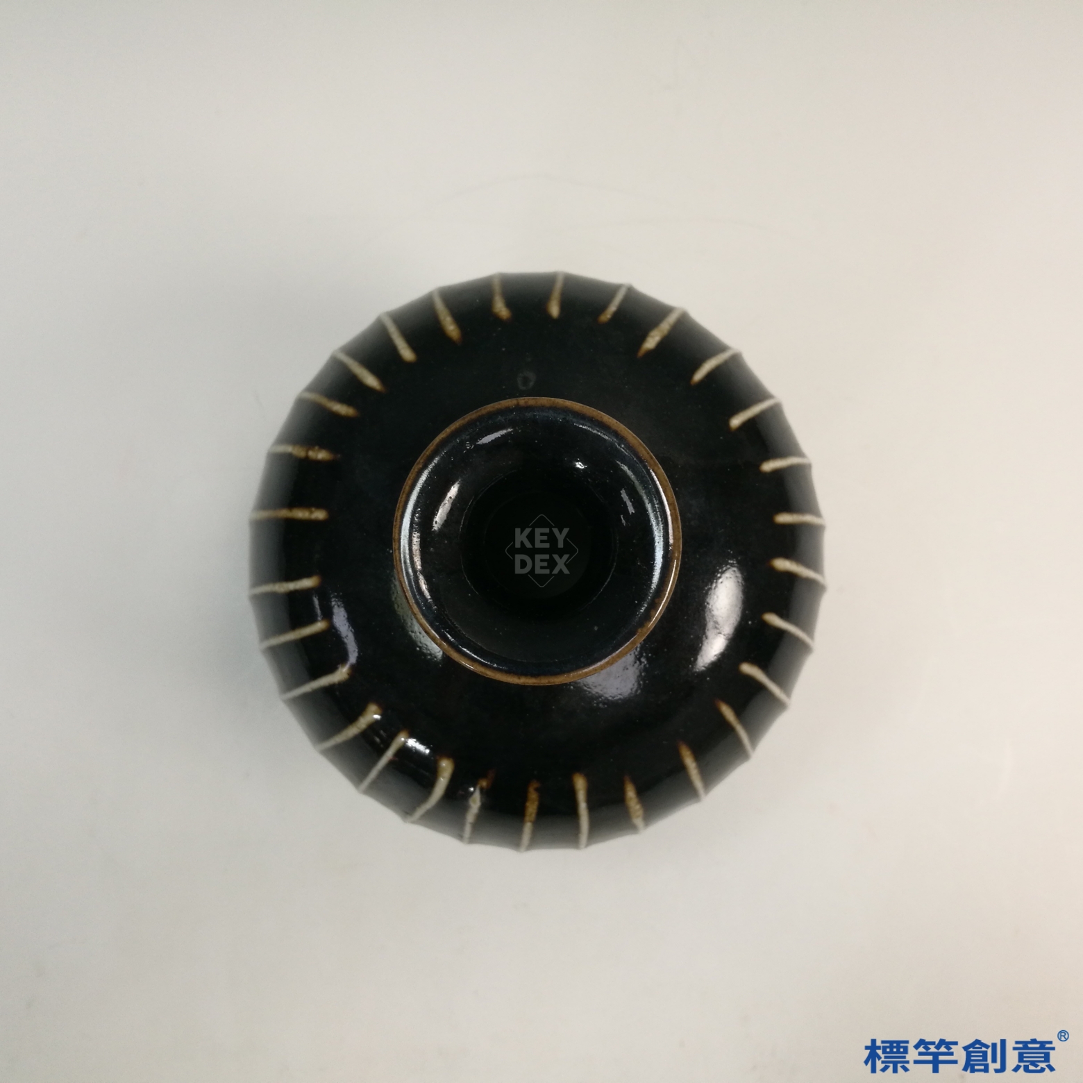 通體施黑釉,釉色光潤細膩,泛有青紫光澤,釉層較厚。腹部以剔刻技法剔出垂直條狀白線紋,露出胎體本色,與黑釉形成強烈對比。線條排列整齊勻稱,裝飾節奏感強,展現高超的剔刻工藝。
