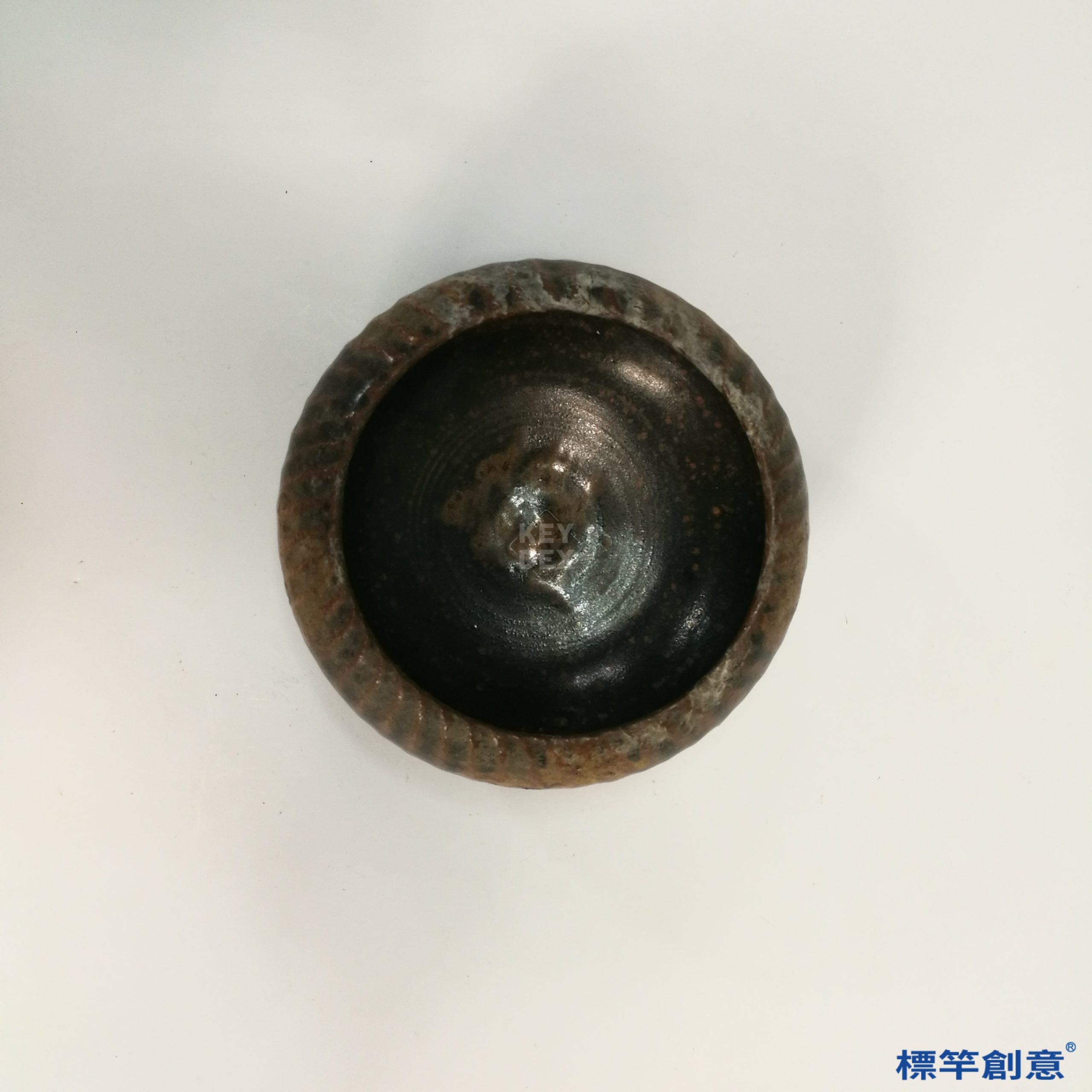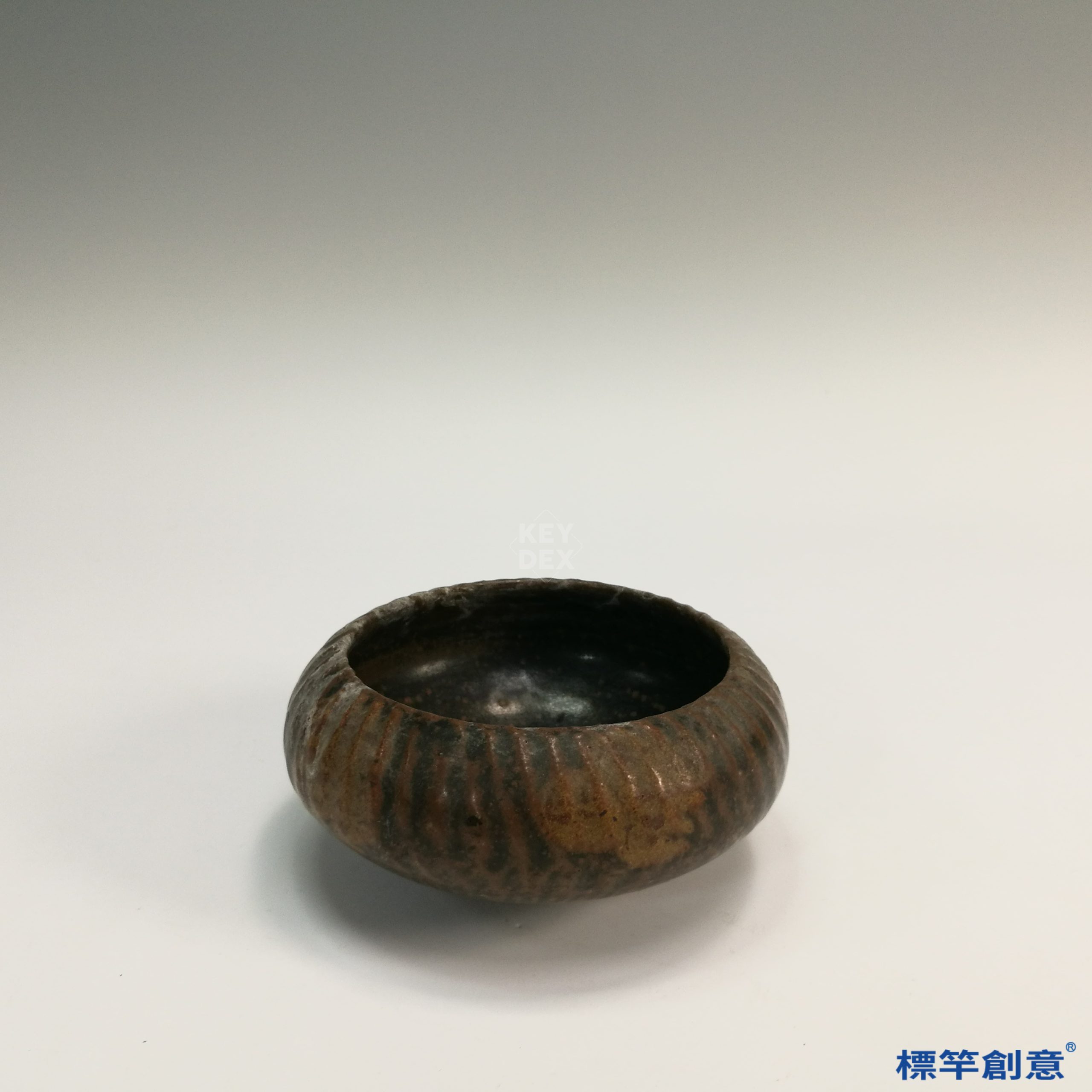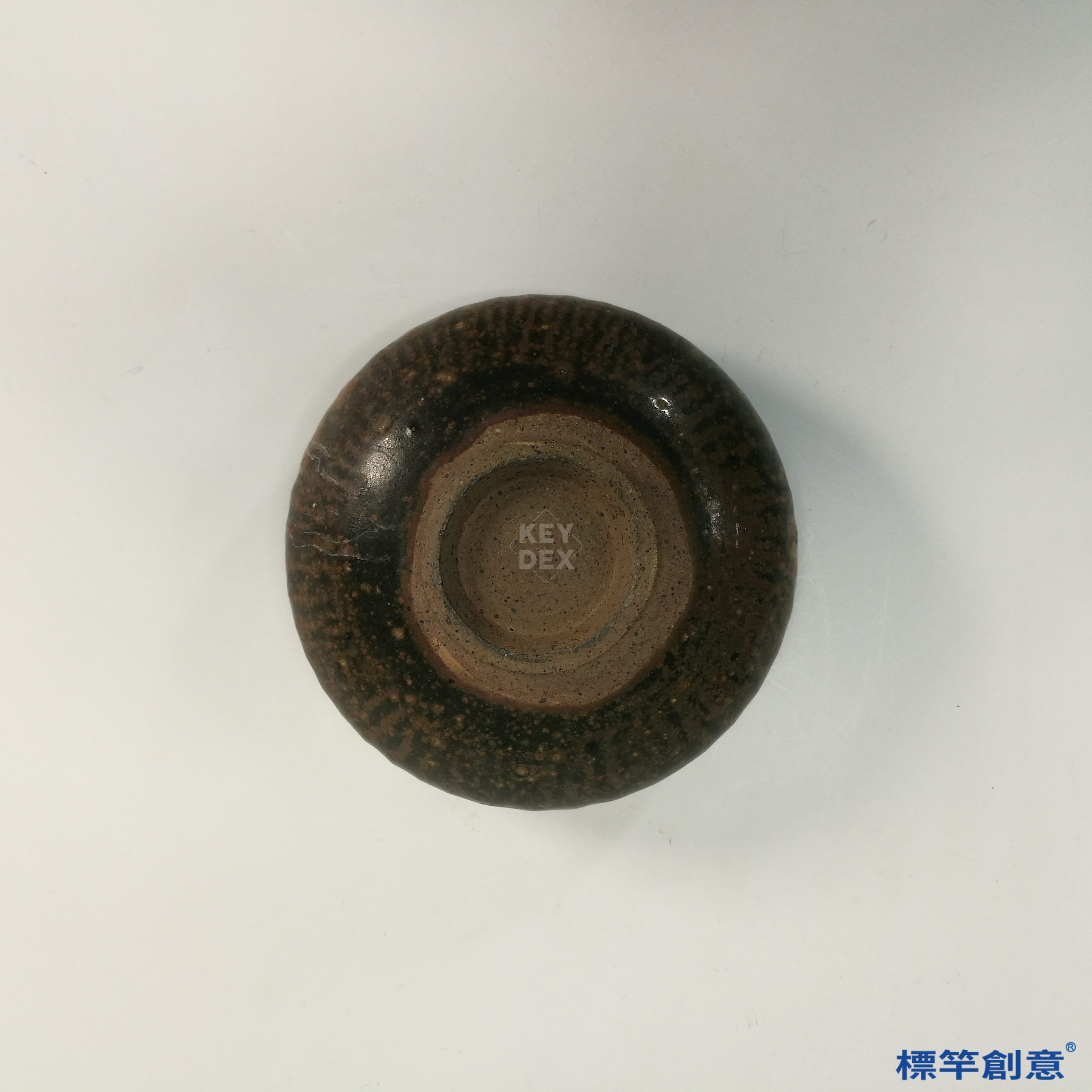 通體施高鐵釉,色澤深褐帶金屬光澤,釉面局部出現自然結晶斑與垂流痕跡,形成特殊肌理與色彩變化。胎體粗厚堅實,器表無裝飾,純以釉色變化見長,呈現樸實與莊重並存之美感。