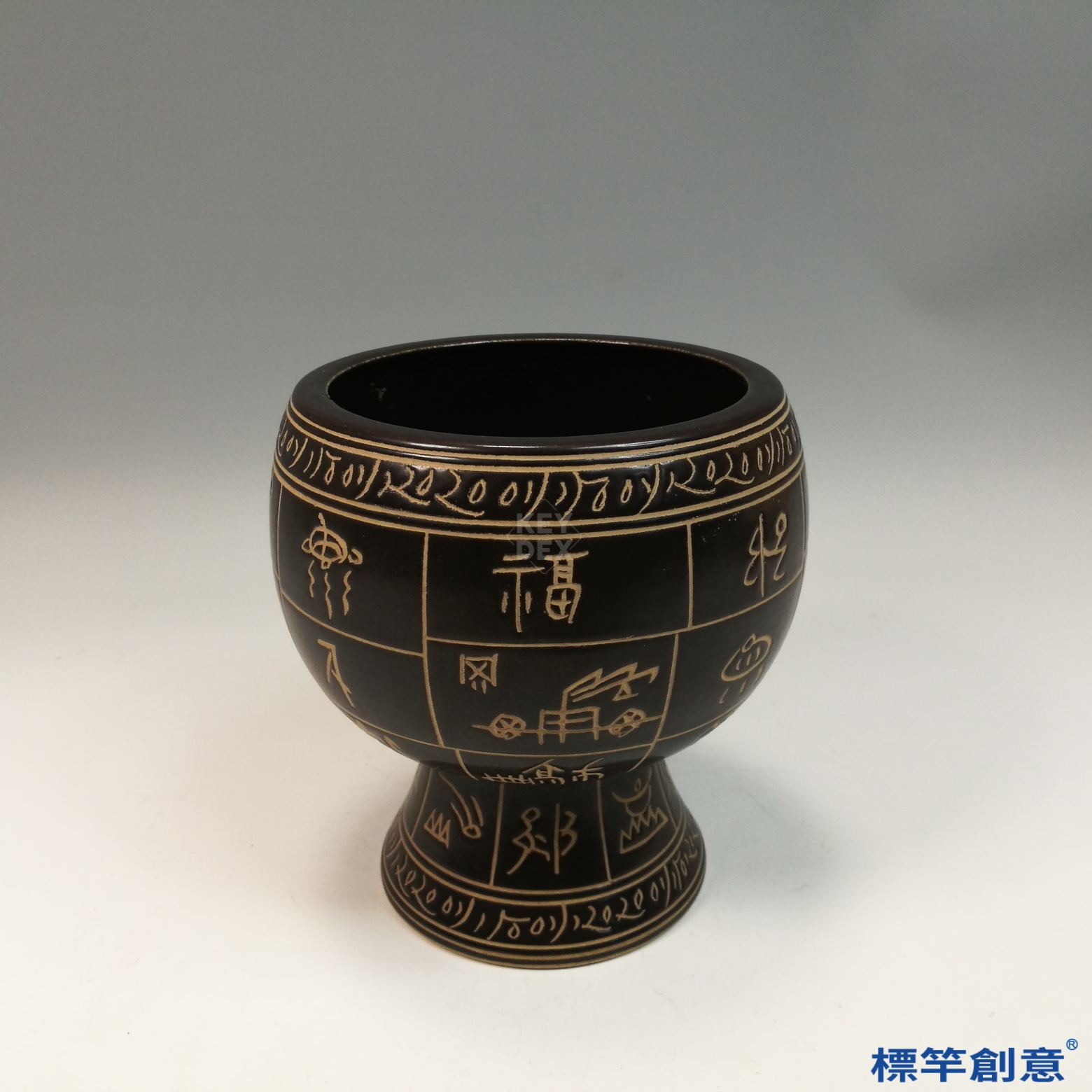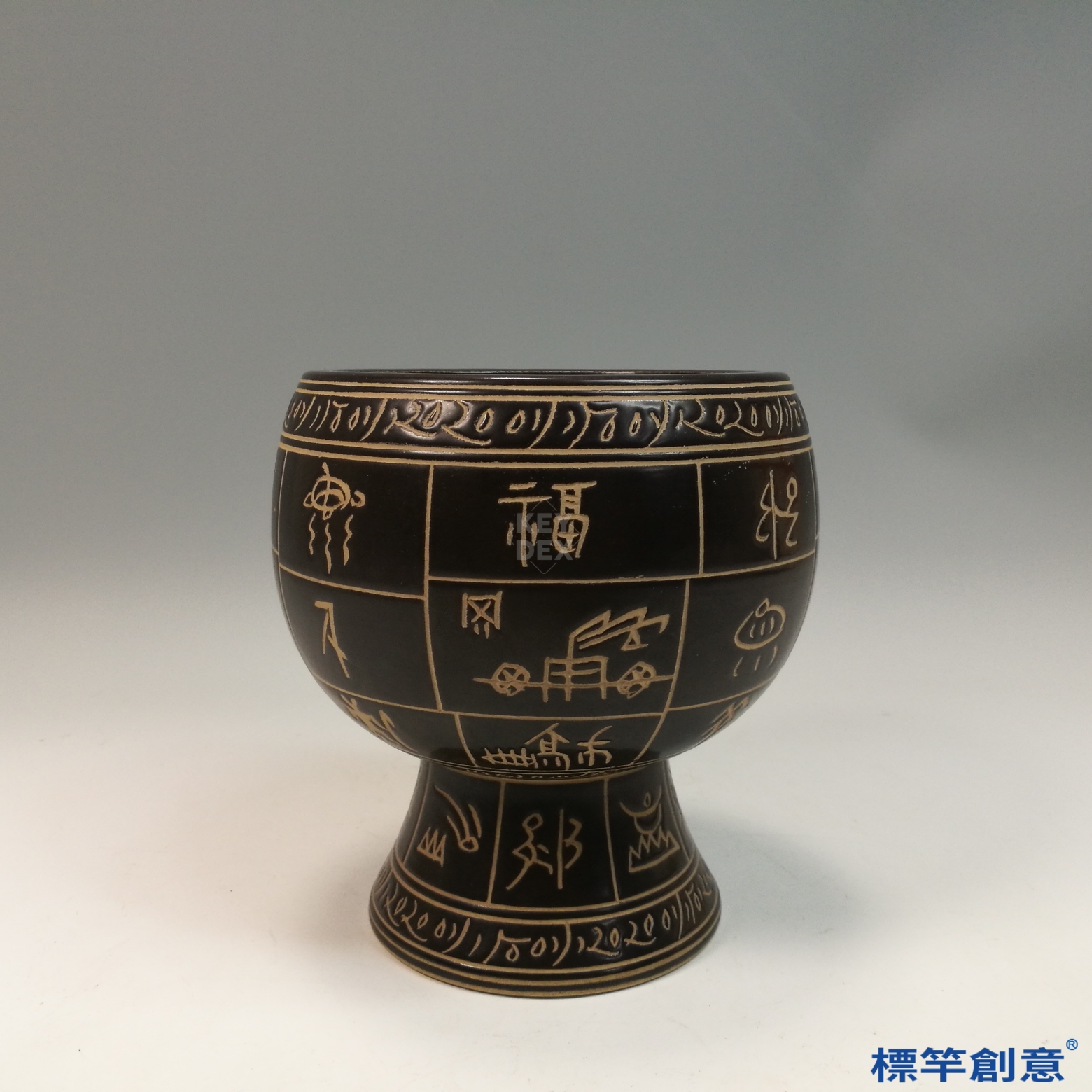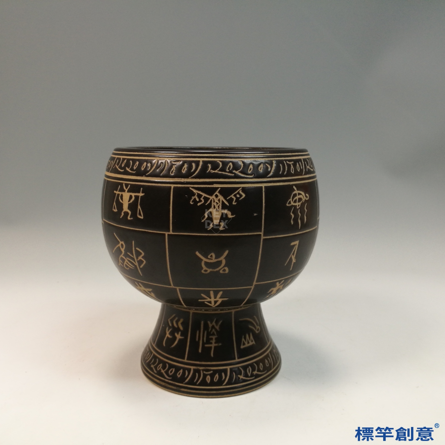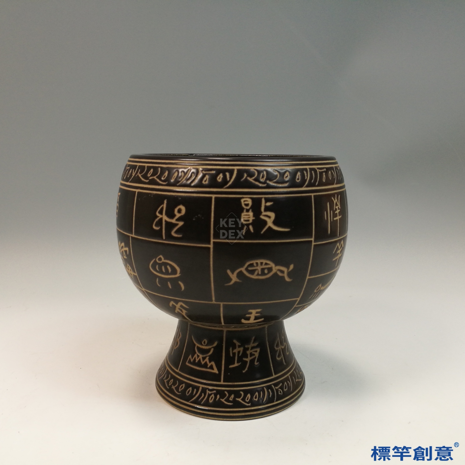 GE032 金代磁州窯醬黑釉刻古文高足鉢