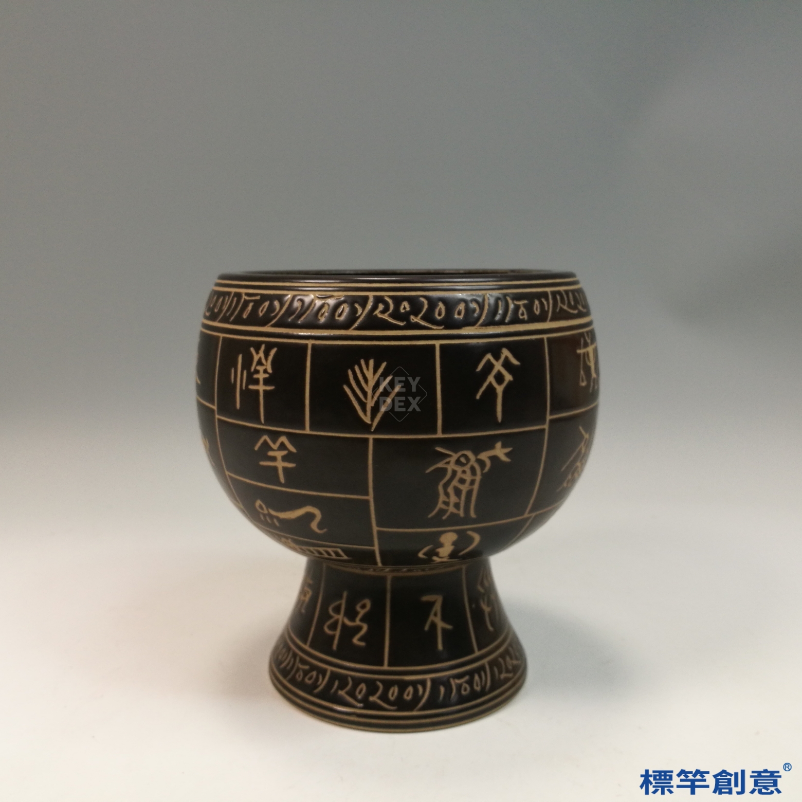 器表通體施醬黑釉,釉面光潔潤澤,黑中泛褐。採陰刻工藝剔寫古文與圖格紋,字形勁健,筆畫清晰,透釉處呈露胎米白色,構成強烈黑白對比。高圈足亦滿飾刻文,足底露胎見燒結痕跡。