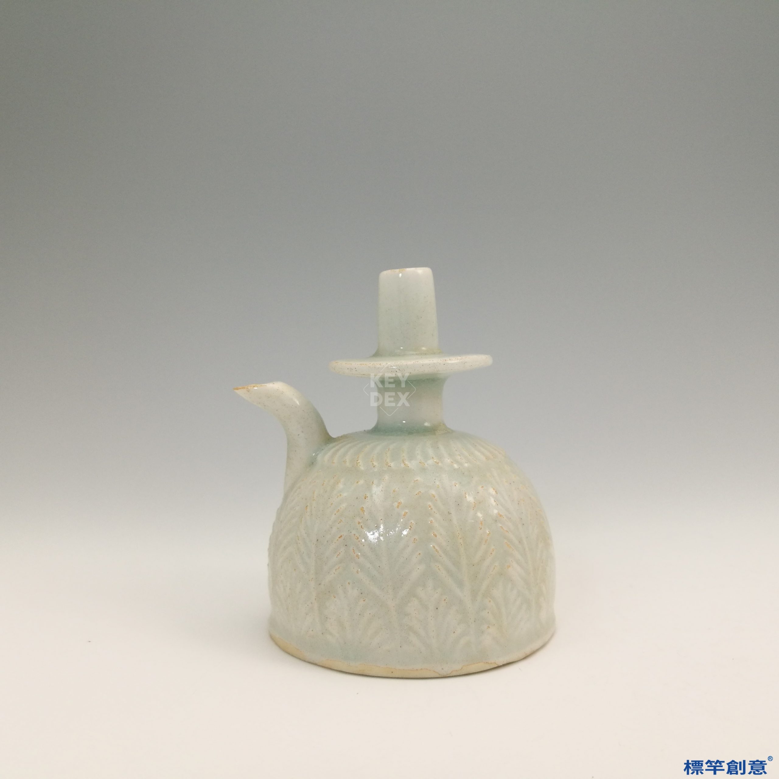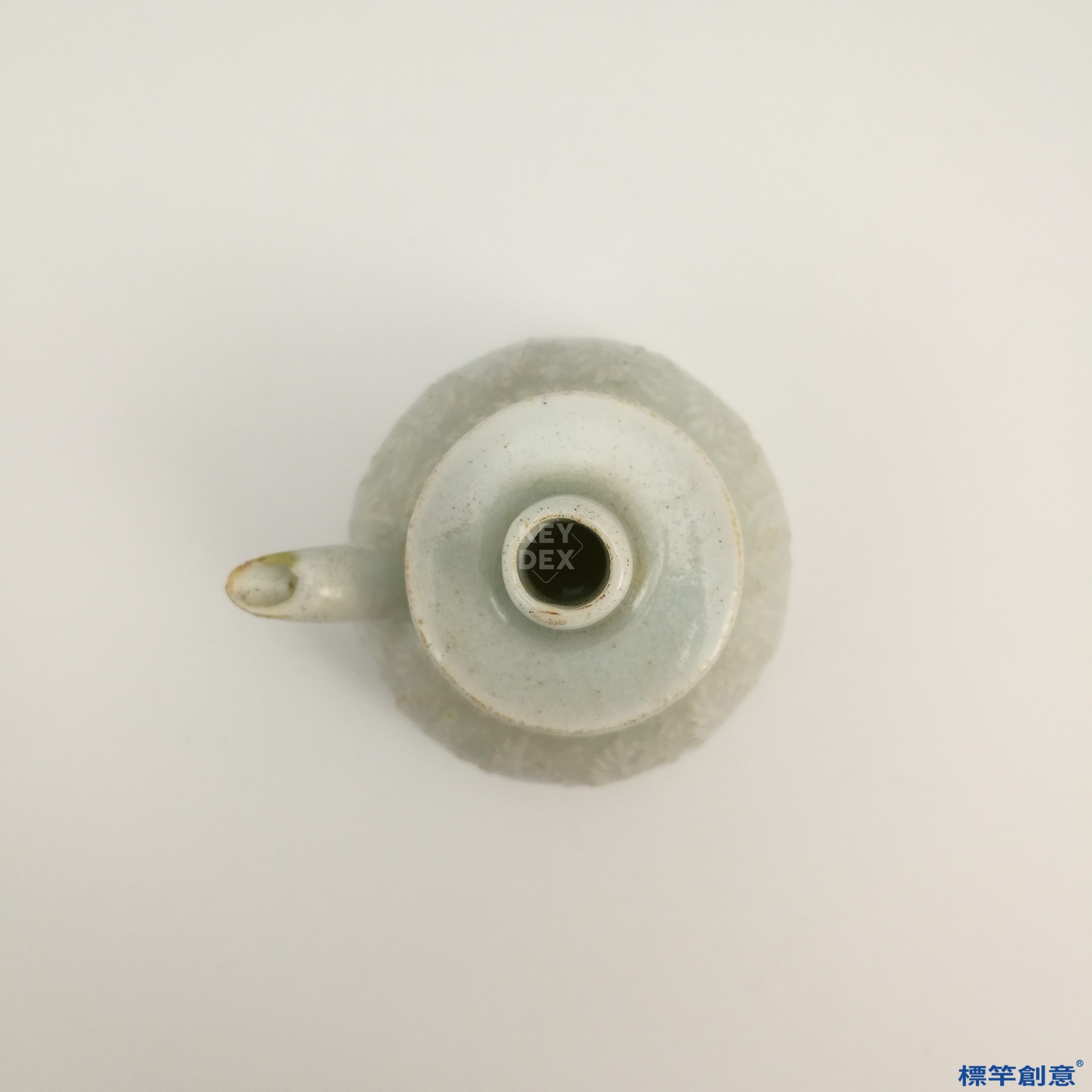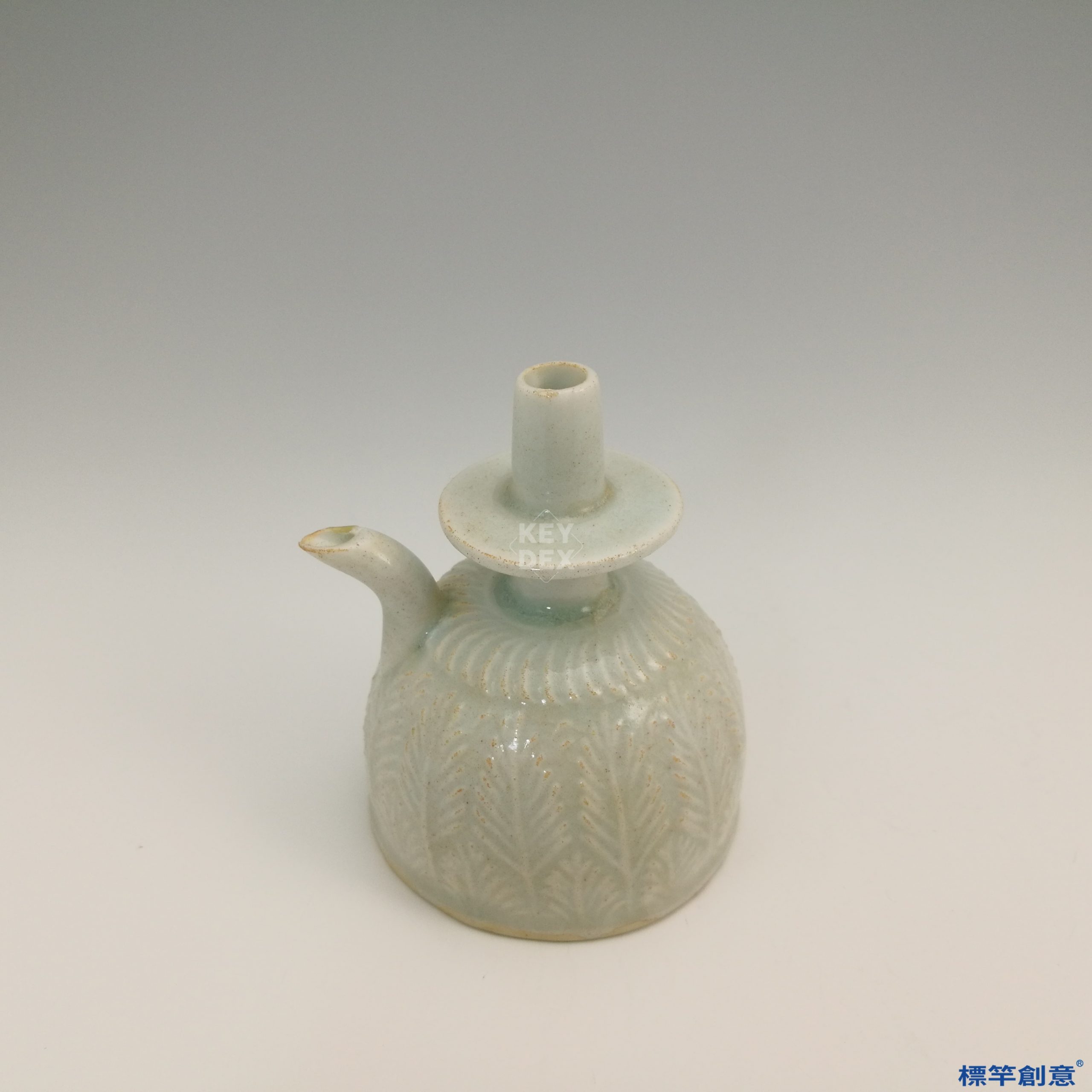 本器高8公分,腹徑7公分,器形小巧端莊。通體呈圓鼓腹造形,短頸外撇,口緣平闊並外挑如盞托,與瓶身相接處微起弦紋;一側設有直流短嘴,外壁均勻刻飾垂葉紋,構圖簡約典雅,瓶底淨平無釉,屬典型桌案供奉用器。