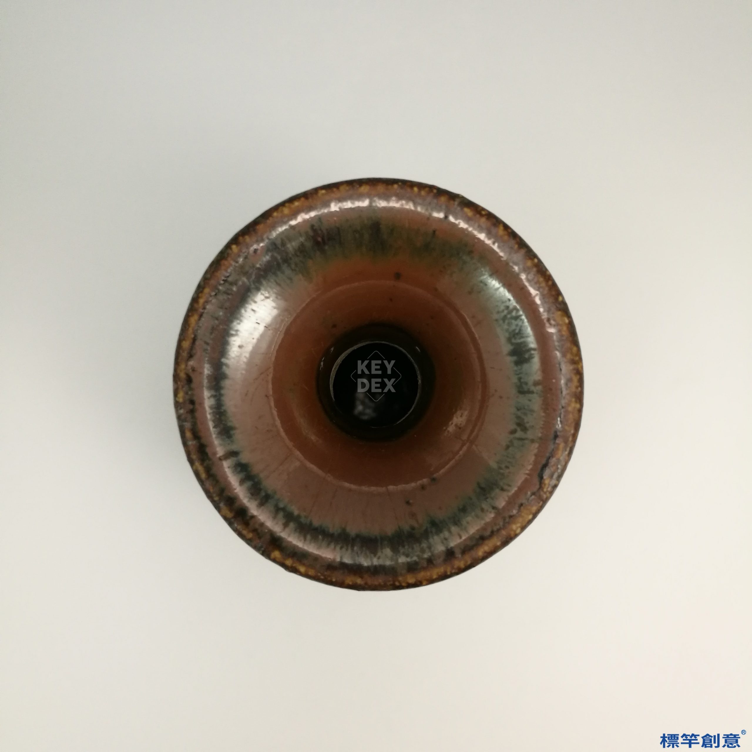胎體以白色泥料成型,經素燒後施紫金釉,入窯高溫還原燒成。釉料中富含氧化鐵,在高溫控制下呈現金屬質感。底部露胎,胎質堅致。