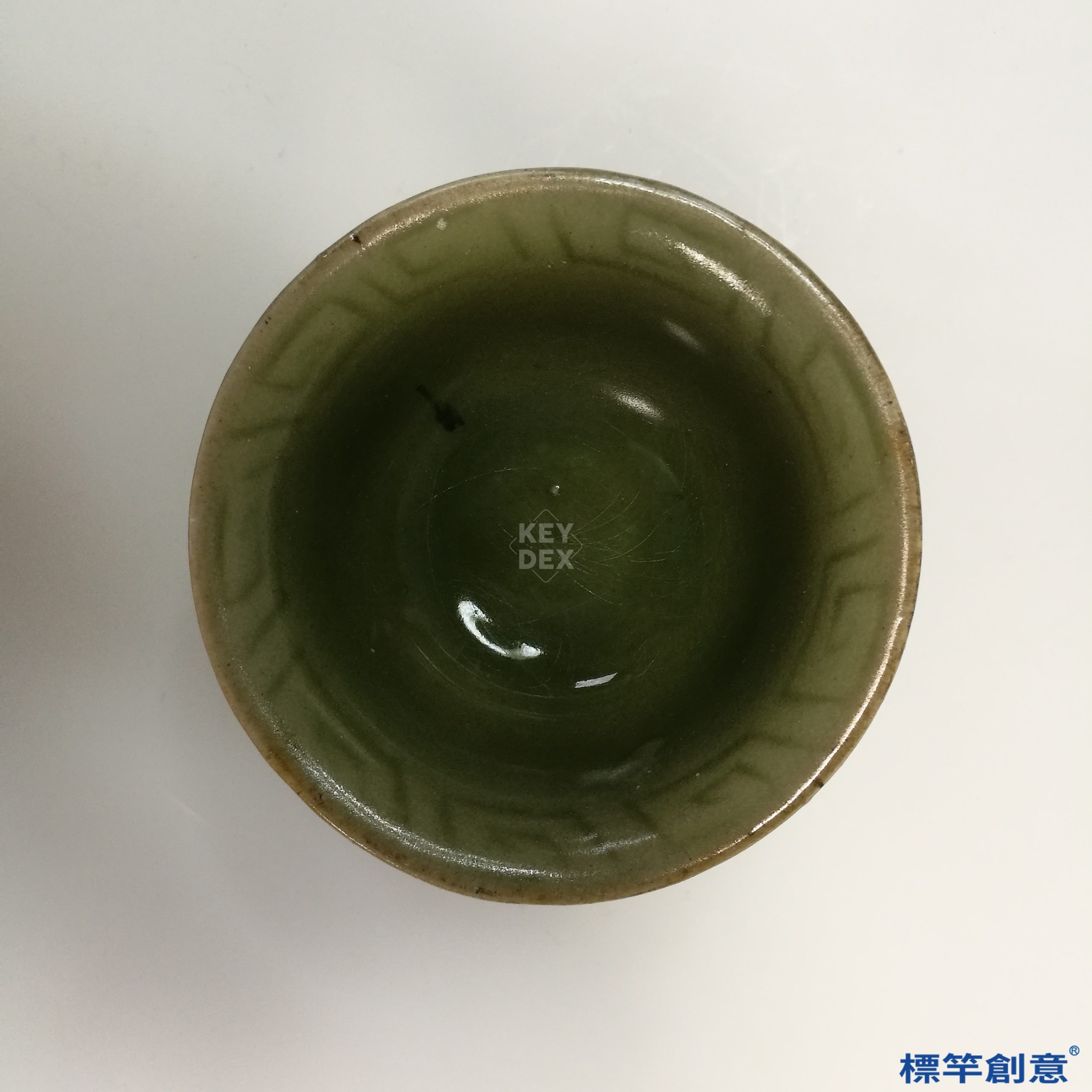 通體施土青釉,釉層勻淨光潤,杯身外壁刻有簡練花卉紋飾,線條流暢,刀痕隱現於釉下。足部露胎,呈鐵褐色,為龍泉窯典型風格。
