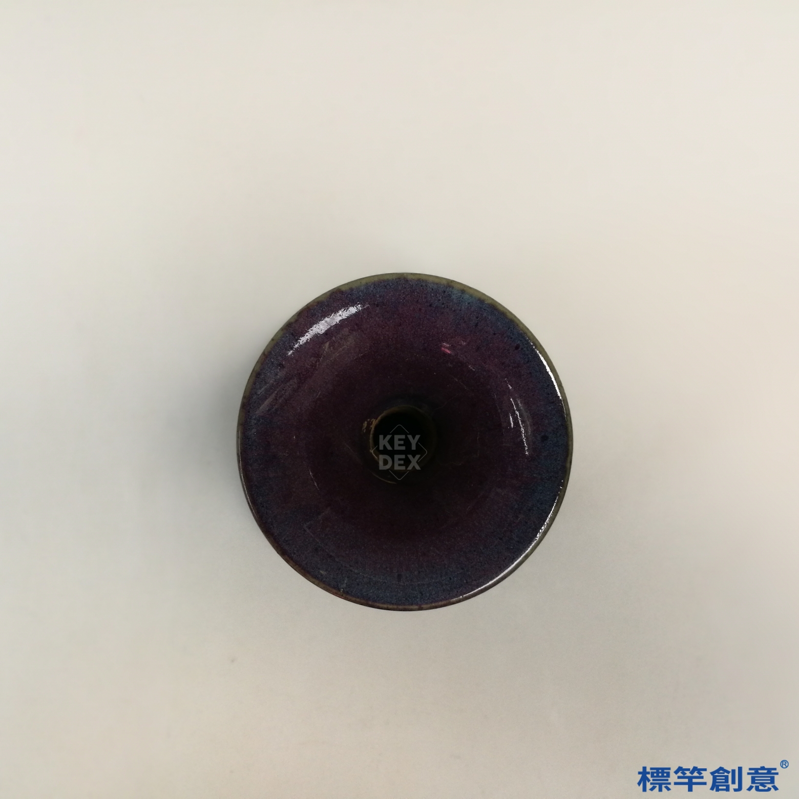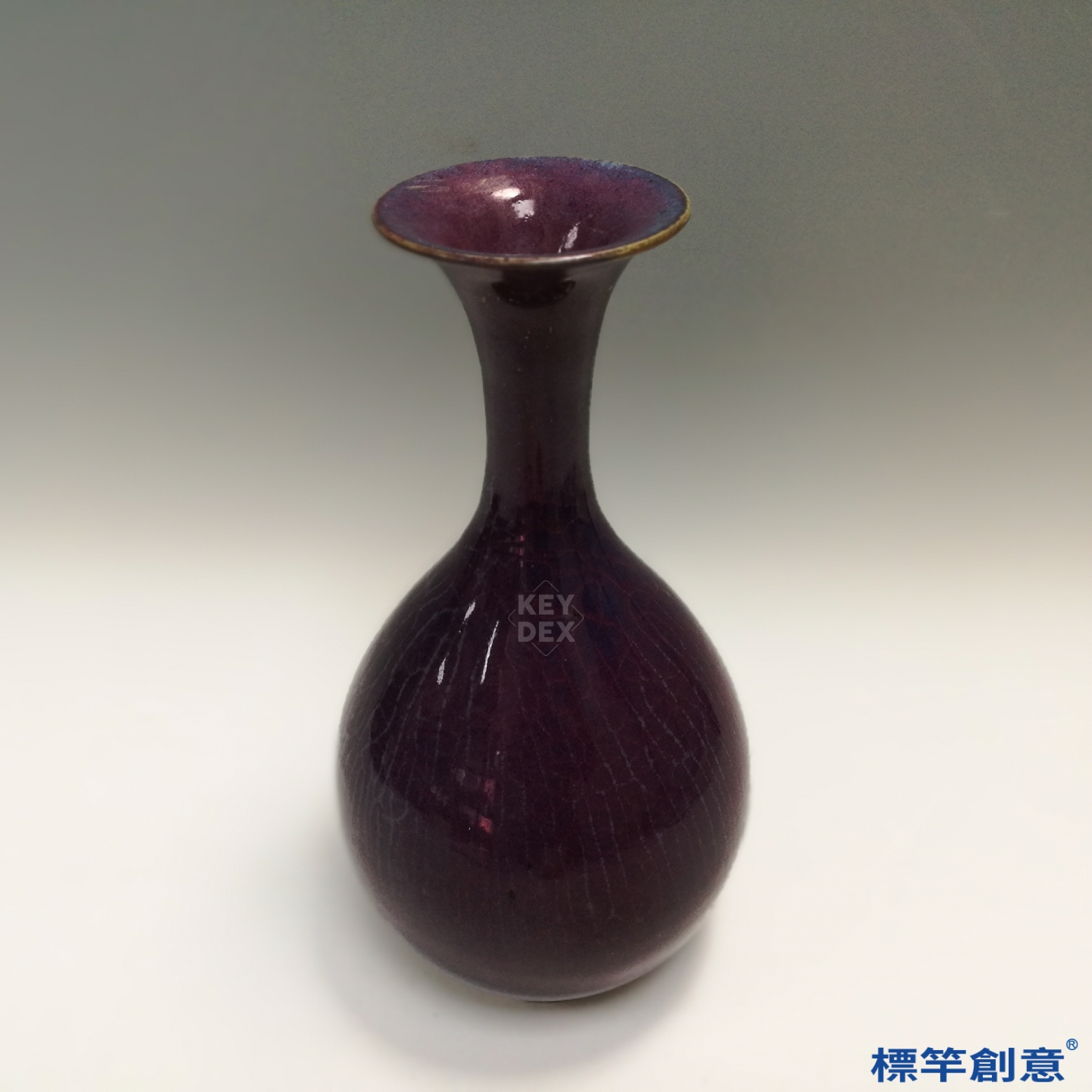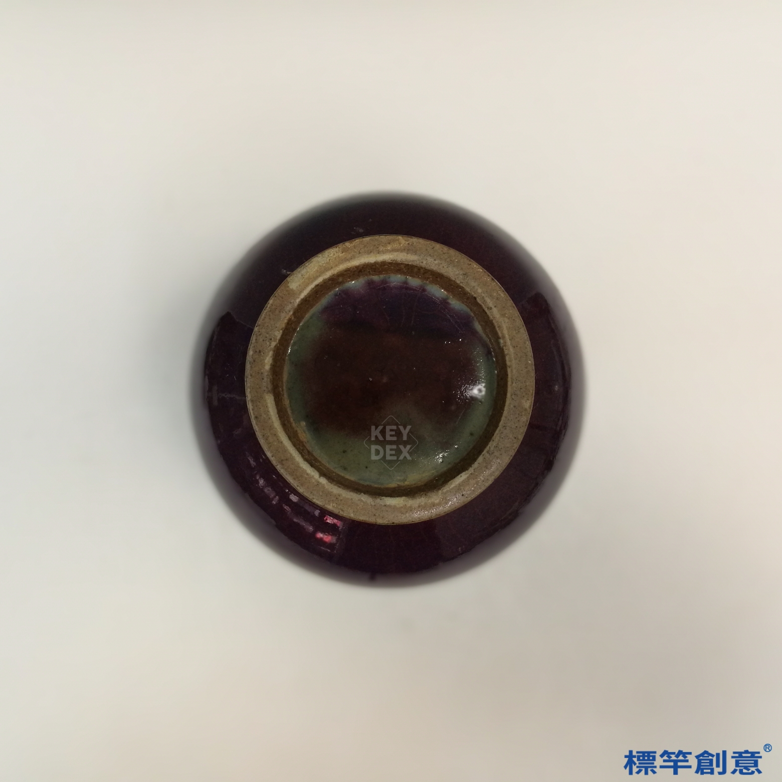 通體施玫瑰紫釉,色澤深沉亮麗,釉面均勻,局部呈現開片紋理。此釉色為銅呈色在還原氣氛中高溫燒成所致,屬典型鈞系紅釉變化之一,色彩表現近似玫瑰紫,具視覺吸引力。