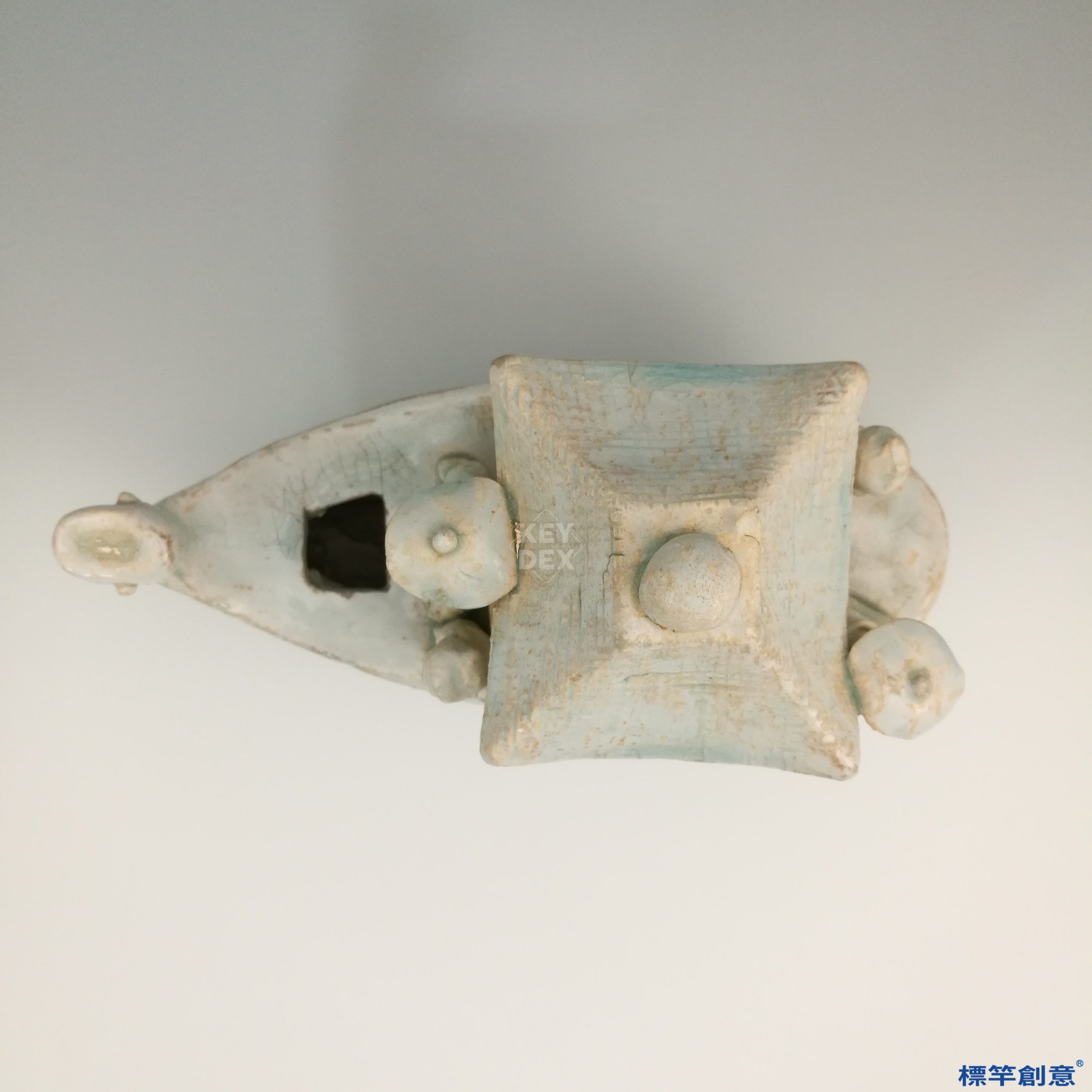 先以模具成形船體與亭亭結構,再另塑人物後貼附於本體,待乾燥後施以青白釉,一次入窯高溫燒成。局部釉薄或脫釉為自然歷時結果,亦增加其歷史與藝術價值。