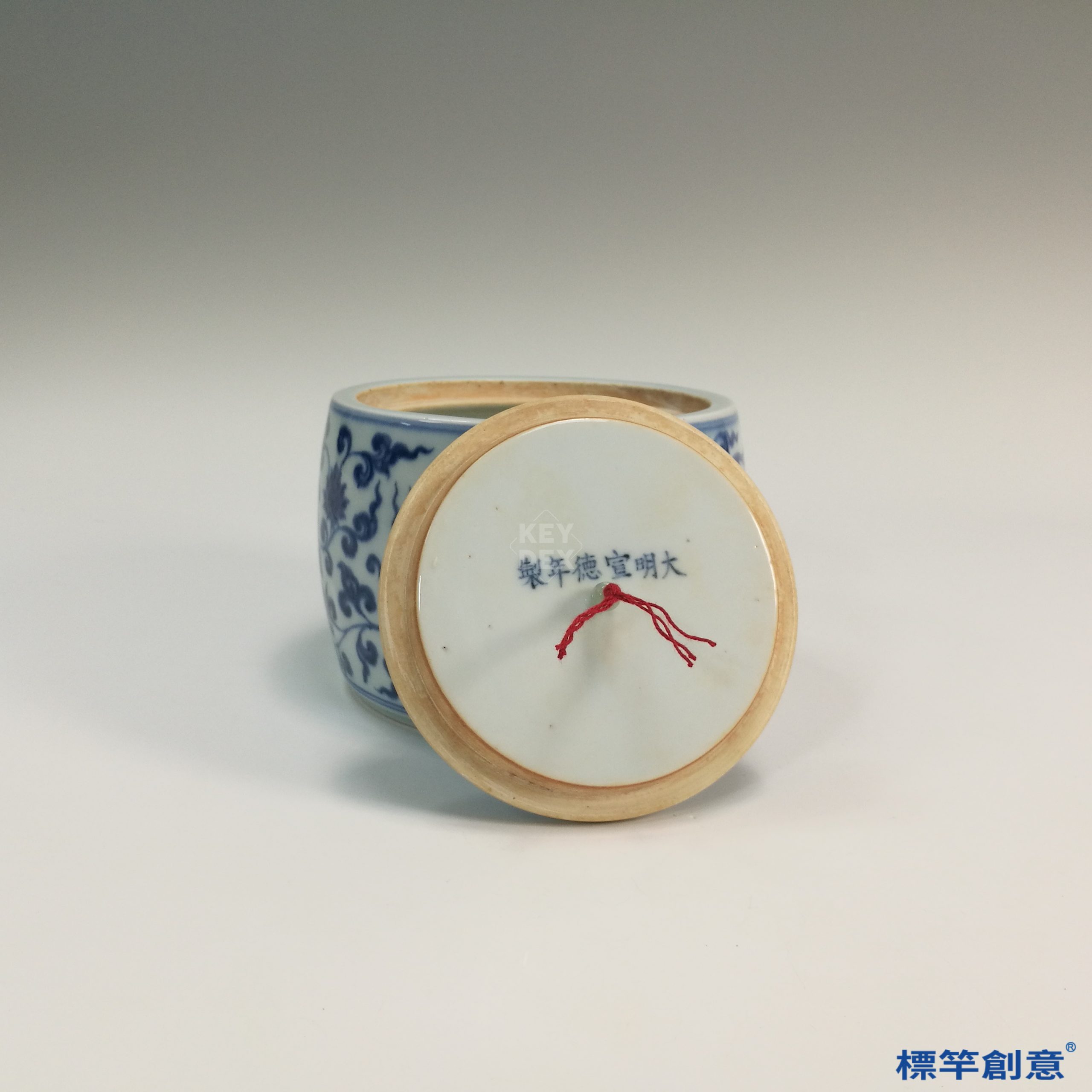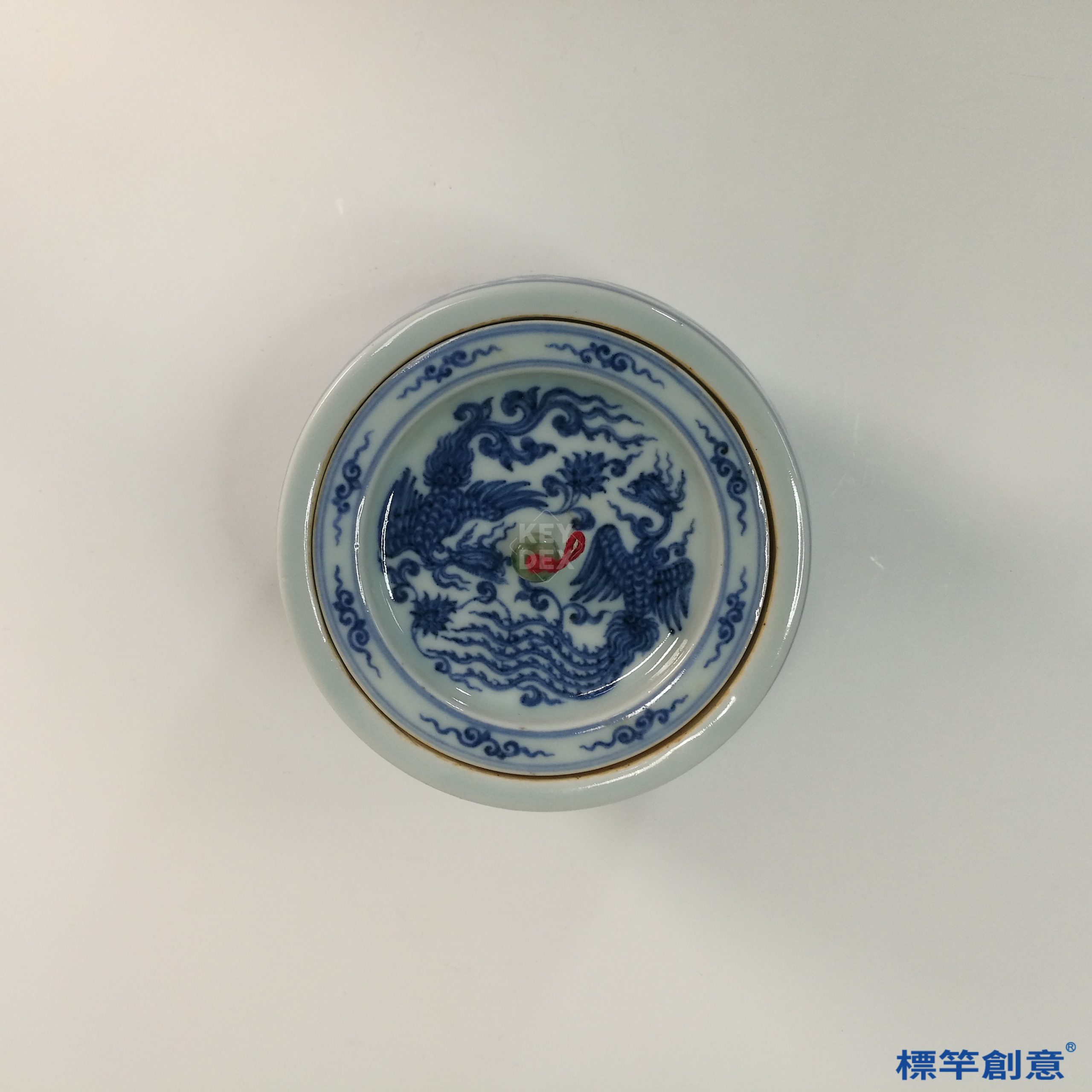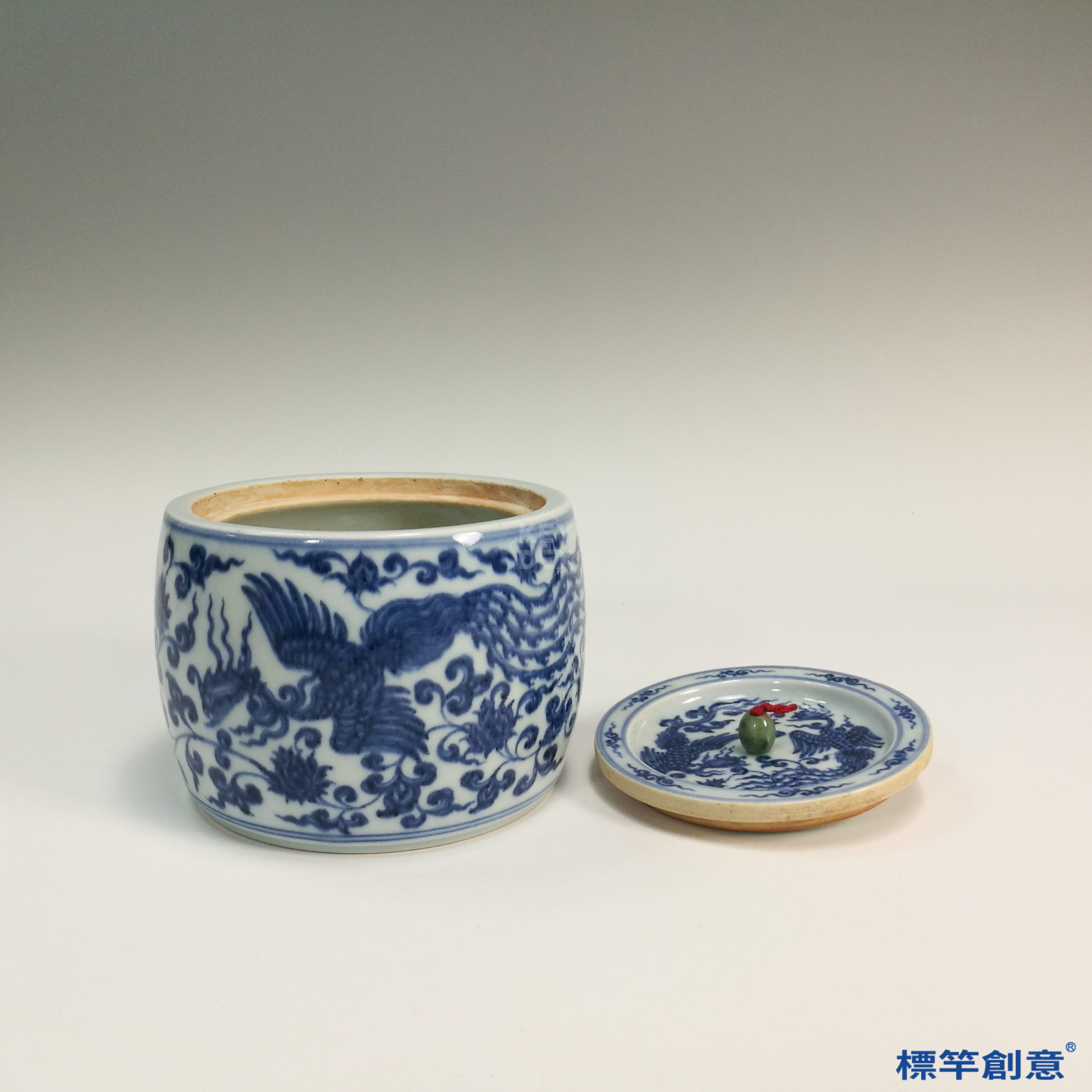 器形簡潔,紋飾富有動感,蓋鈕設計便於實用,可為現代文具罐、香盒或茶罐設計參考。其青花用筆與鳳紋構圖,亦可作為青花繪畫學習範例。