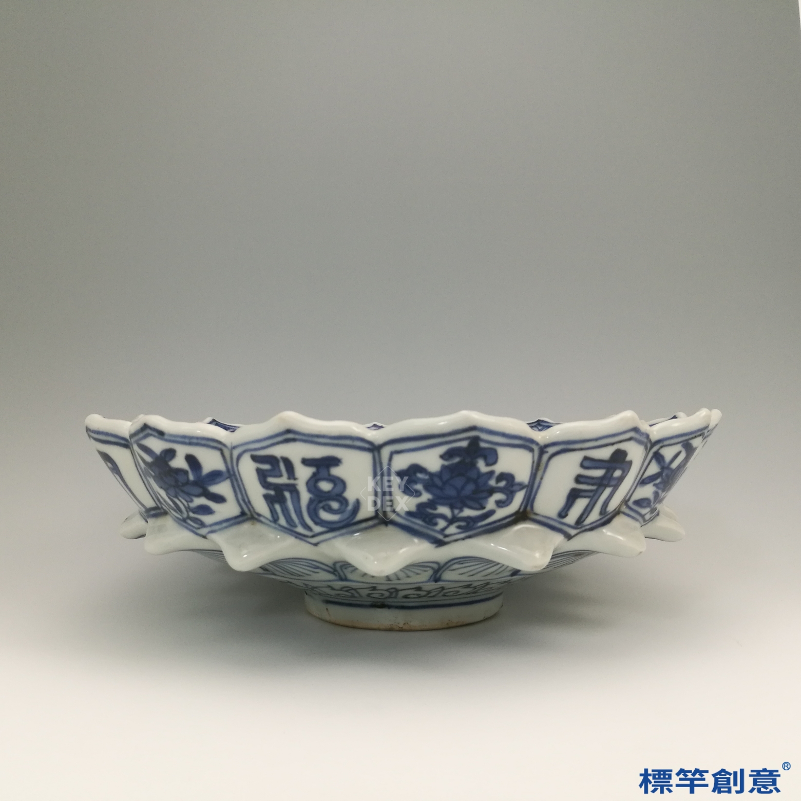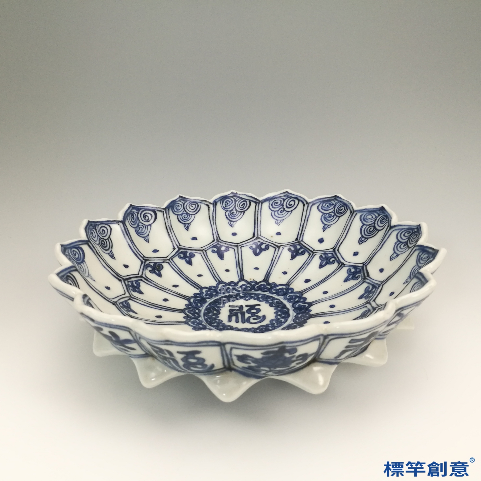 通體施青花裝飾,蓮瓣細繪卷雲與如意紋飾,筆意秀麗,青花發色濃淡有致,層次分明。盤面採模印與堆貼技術,蓮瓣雕塑立體,視覺與觸覺效果俱佳,結合塑形與繪畫技法。