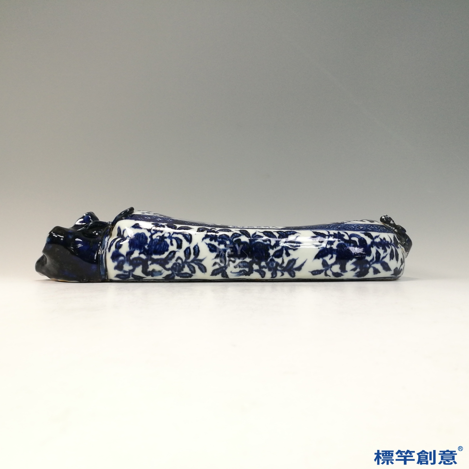 宣德青花以用料講究、紋飾秀雅著稱,此件布袋枕兼具生活實用與吉祥象徵意涵,反映明代宮廷與社會審美觀。具重要歷史與藝術價值,亦為明宣德瓷枕存世之少見品種。