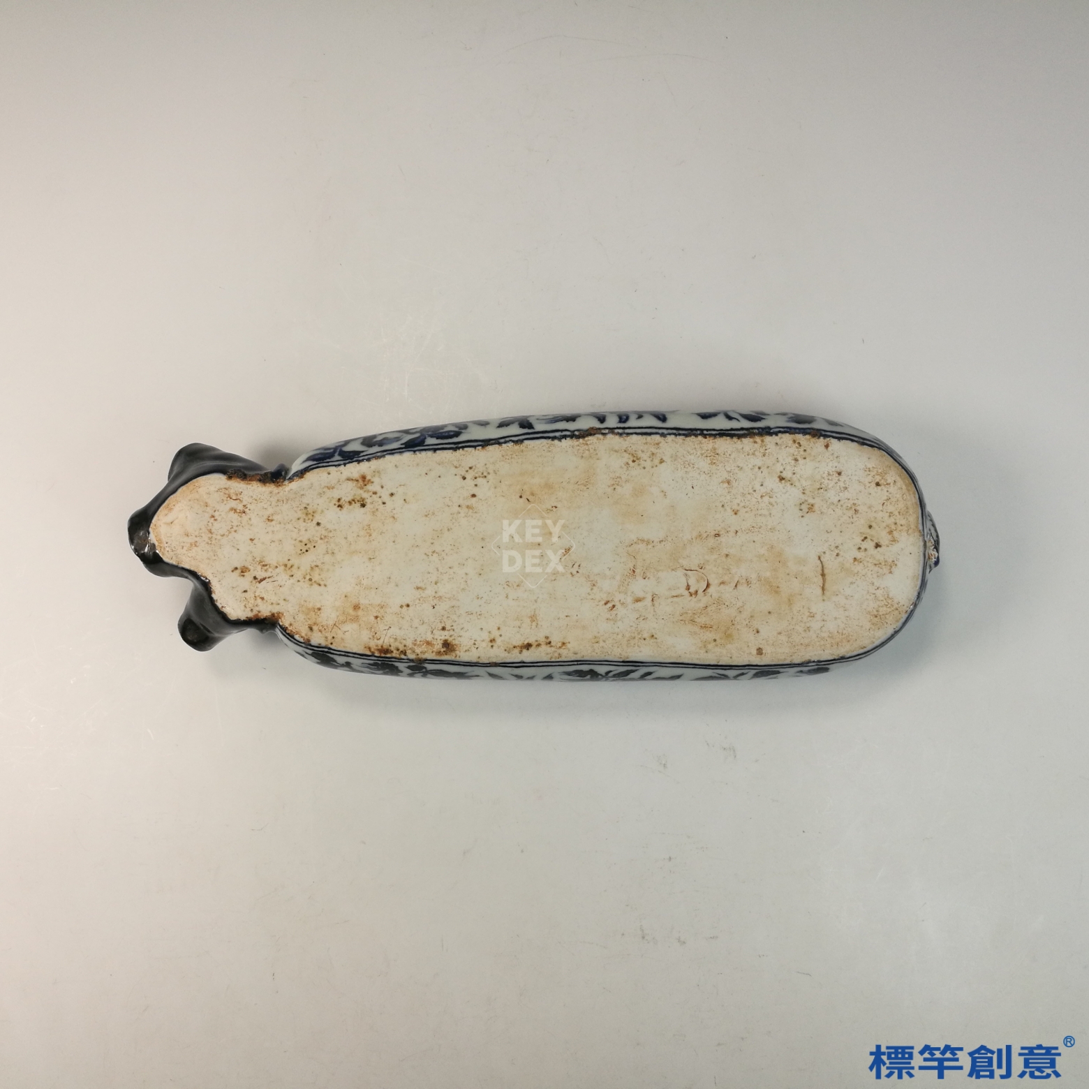 本瓷枕呈布袋形制,枕面微弧,整體形態飽滿圓潤,底部平整便於安置。高約 7.8cm,長約39.5 cm。
