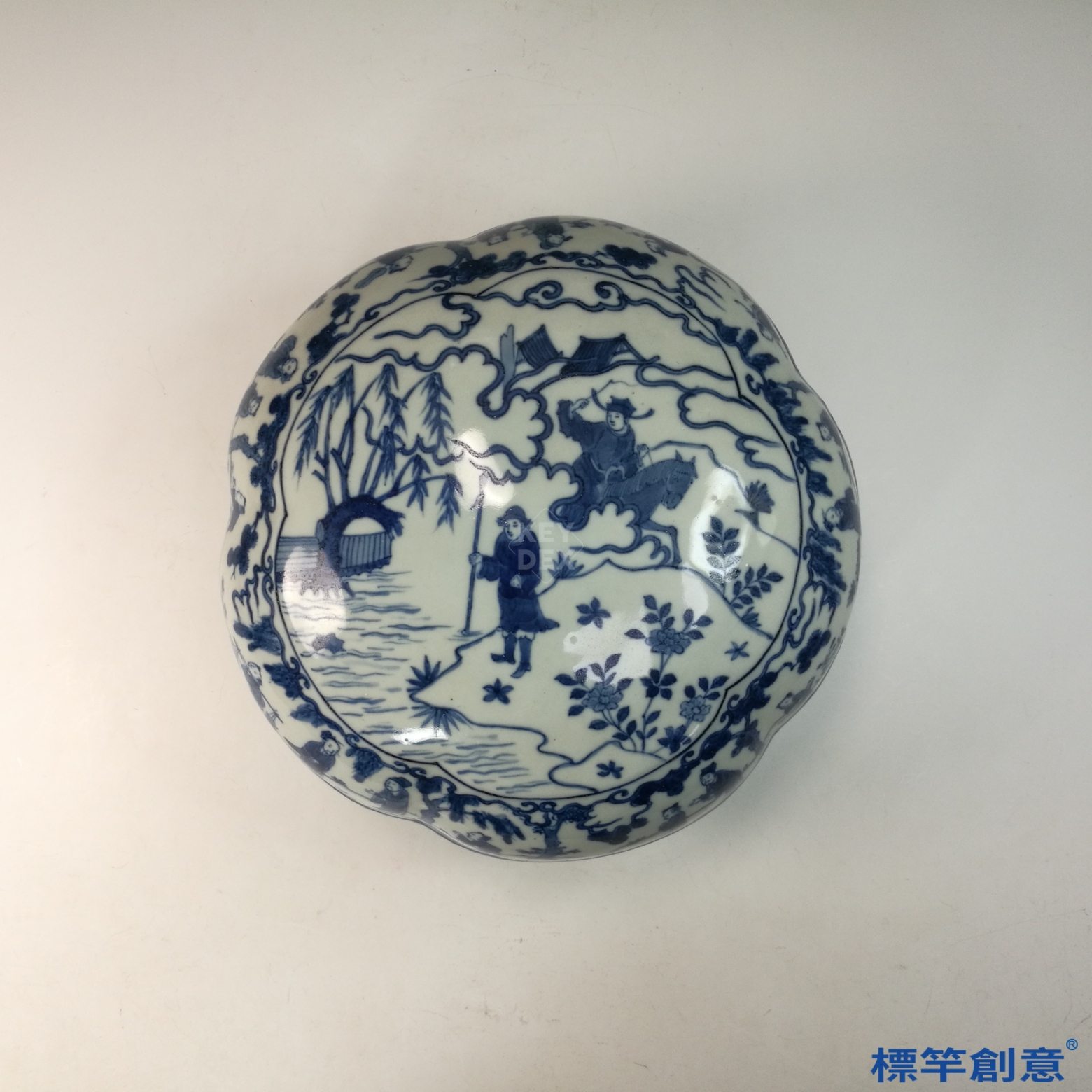 萬曆青花以其敘事性圖案與複雜構圖為時代特徵,此件八稜捧盒不僅體現了文人風尚與審美趣味,亦展現晚明社會對故事題材與實用美器的喜好。具有較高的歷史、藝術與收藏價值。