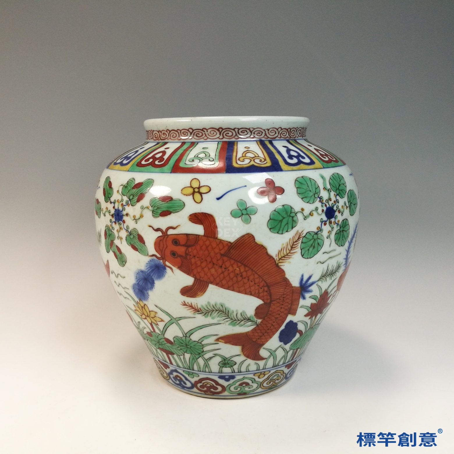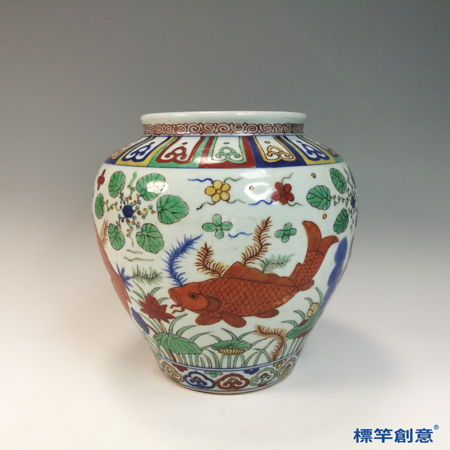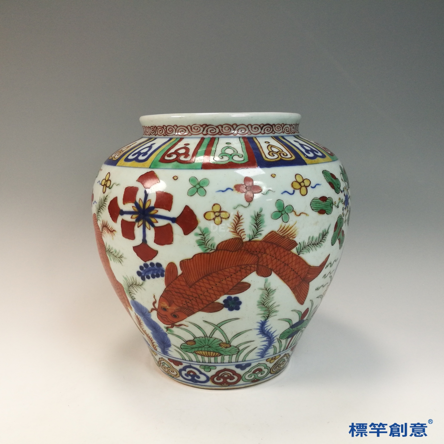 先以釉下青花描繪魚藻輪廓,經高溫一次燒成後,再於釉上以礬紅、銅綠等料繪製彩色部位,最後以低溫窯再燒定彩,為二次燒製工藝。
