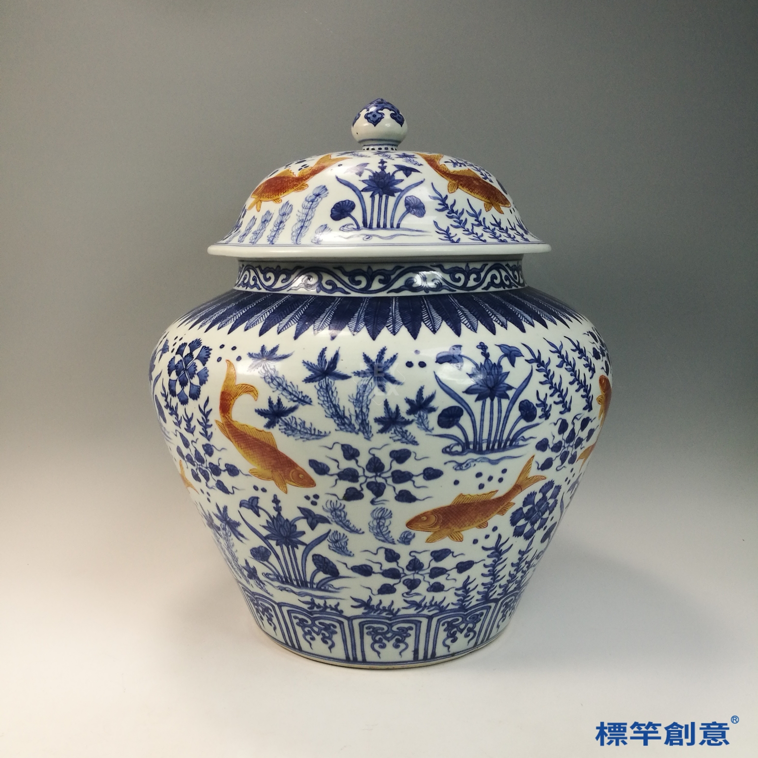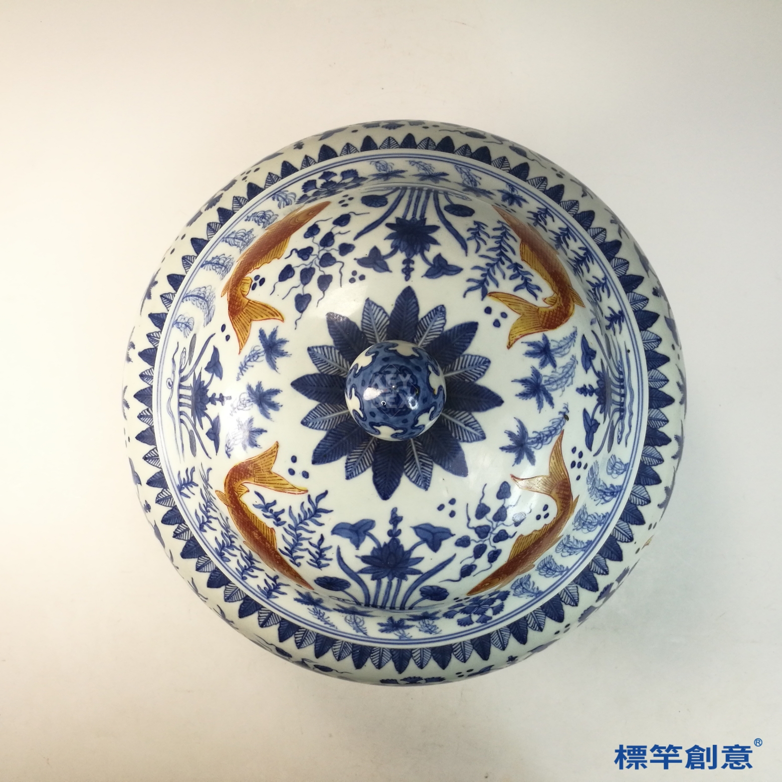 先以細白胎素燒成型後,以青花鈷料繪製紋樣,再以銅紅料點飾魚紋,整體施透明釉,入還原焰高溫一次燒成,為景德鎮窯釉下多彩之成熟技術。