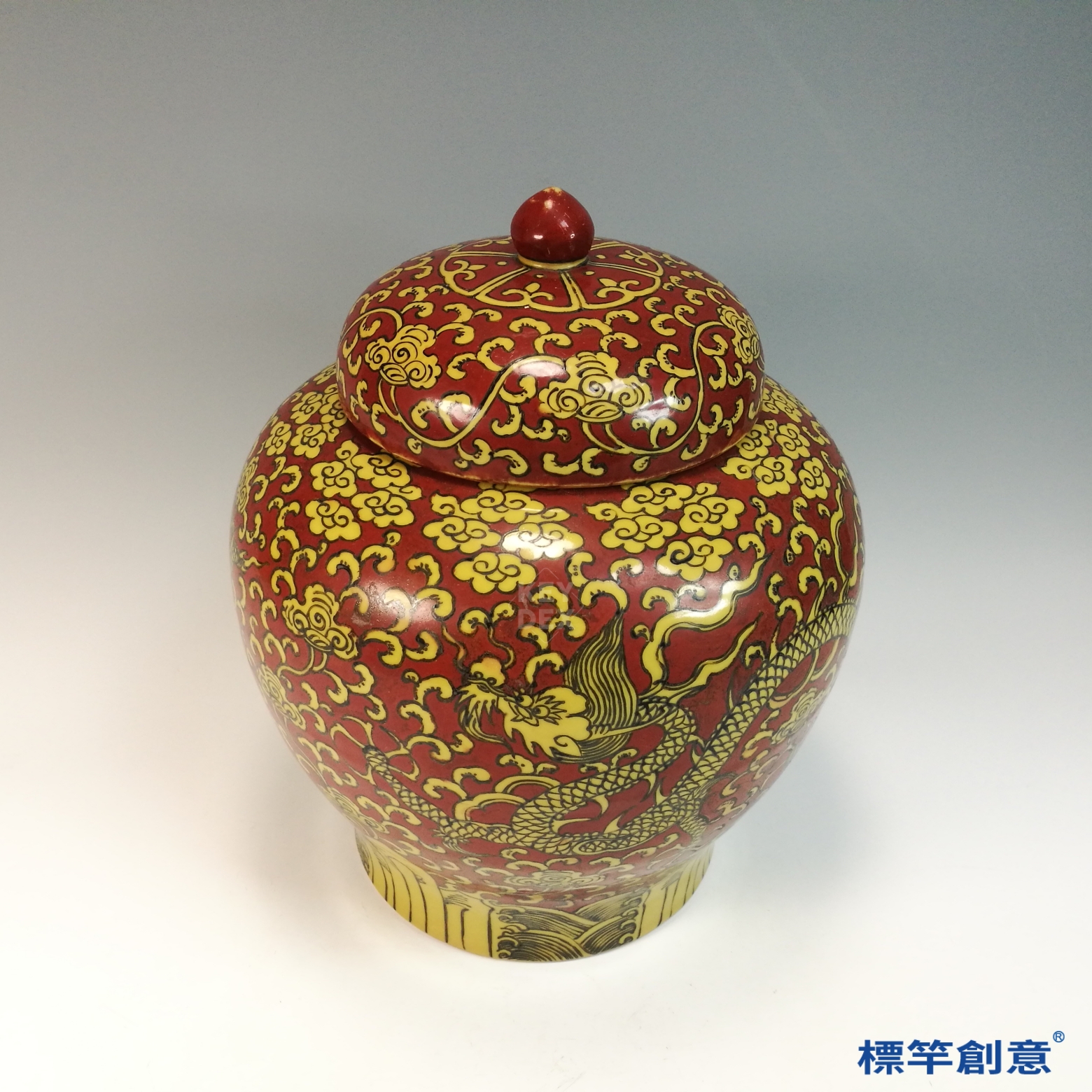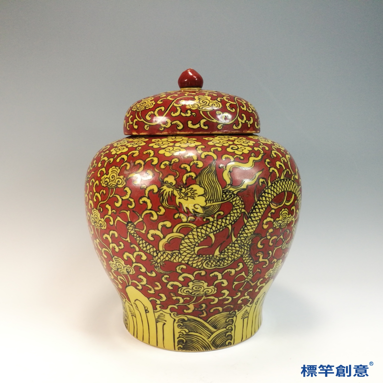 HB094 明代嘉靖景德鎮官窯紅釉地黃彩繪五爪龍紋蓋罐