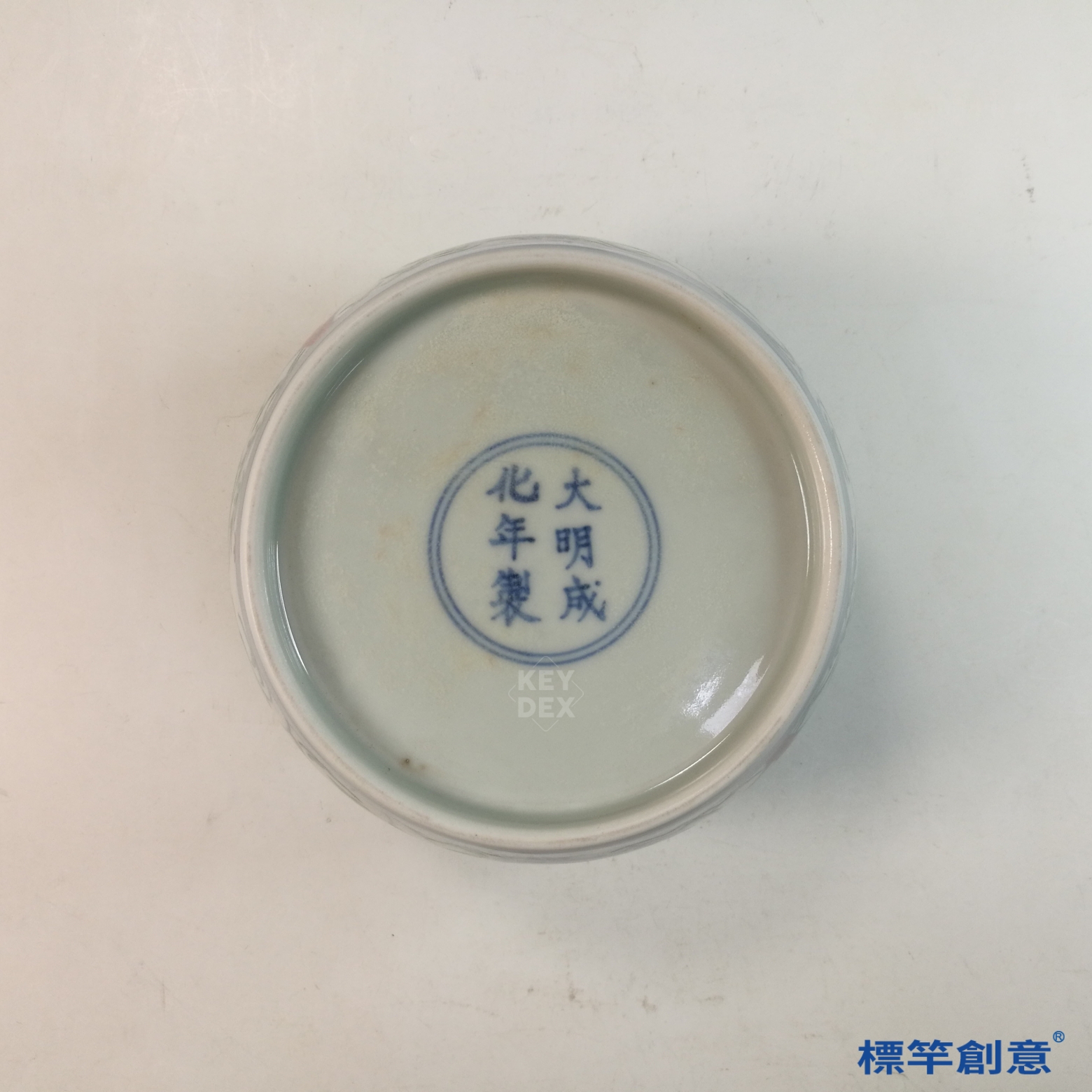 本品為明代晚期景德鎮窯所燒,底署「大明成化年製」款,為後世仿成化官窯之民窯作品,反映明晚期仿古之風盛行。