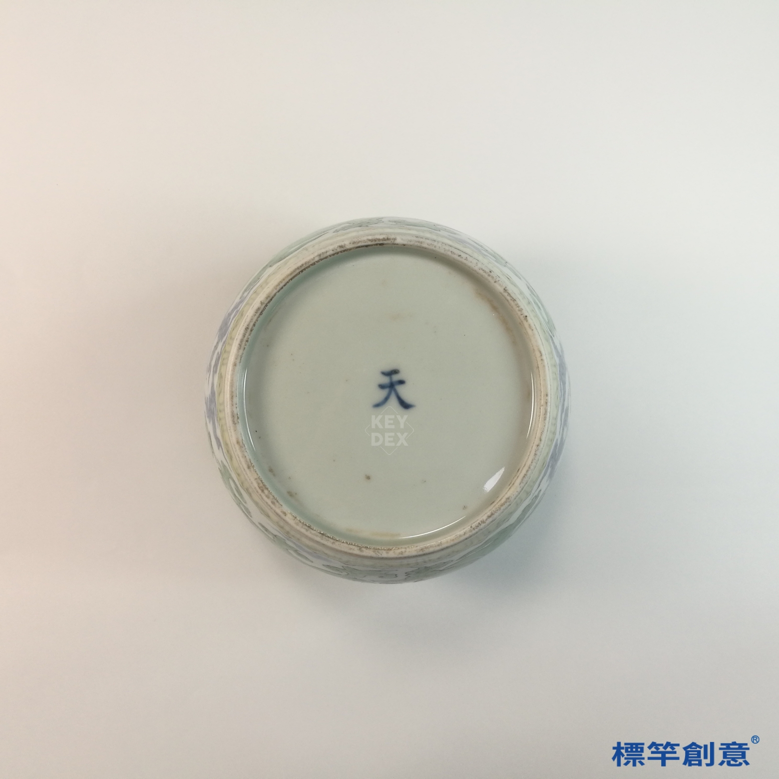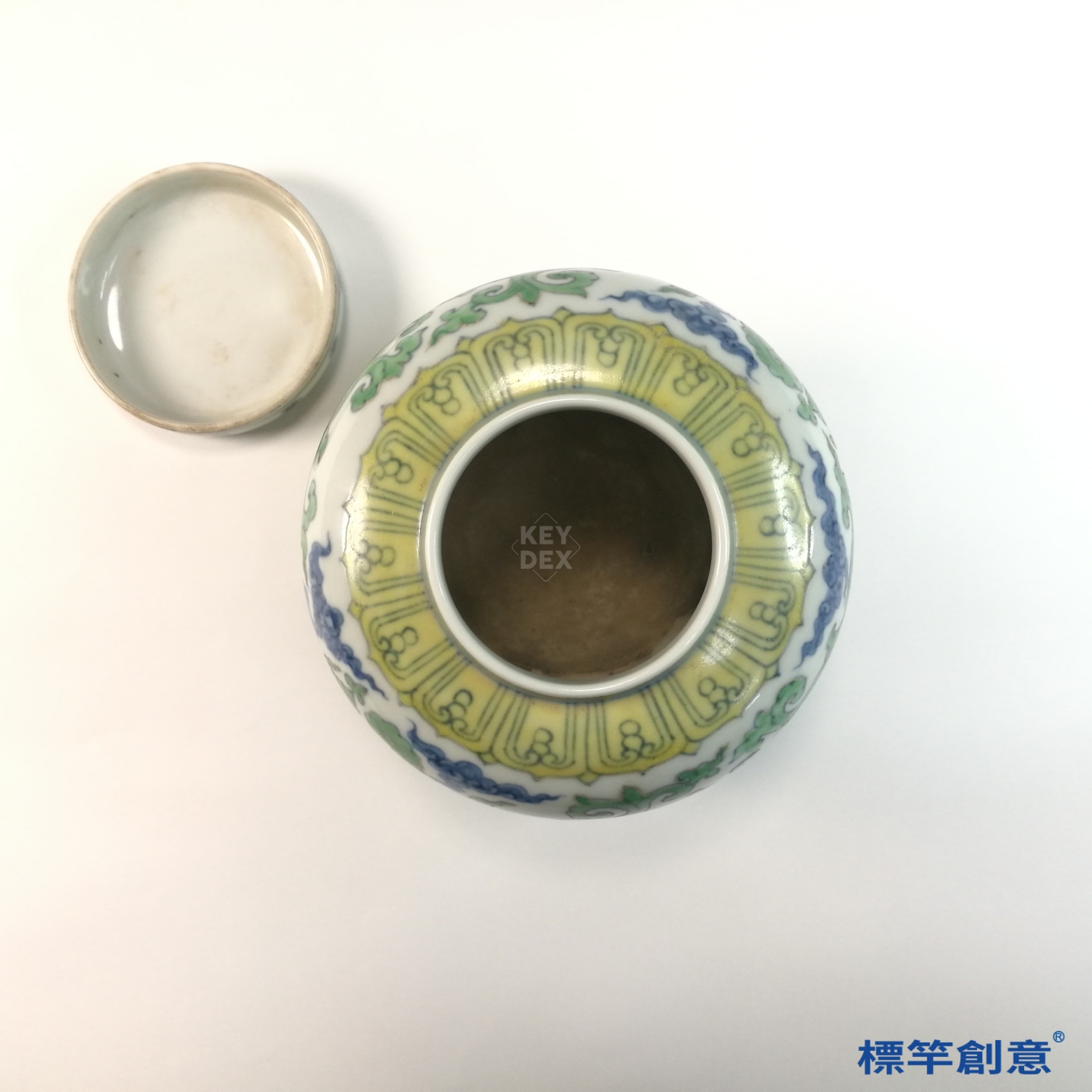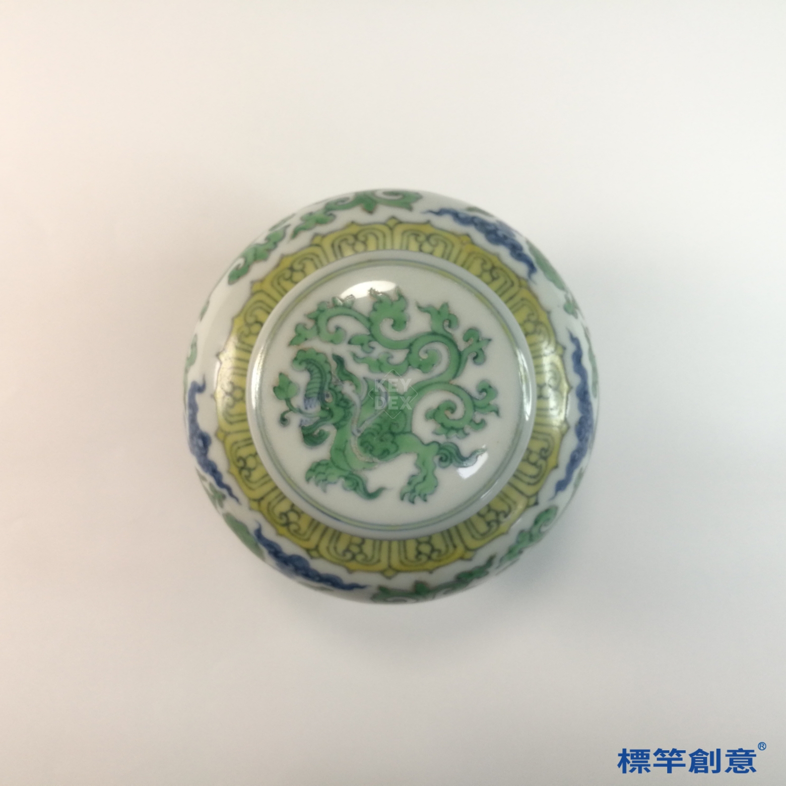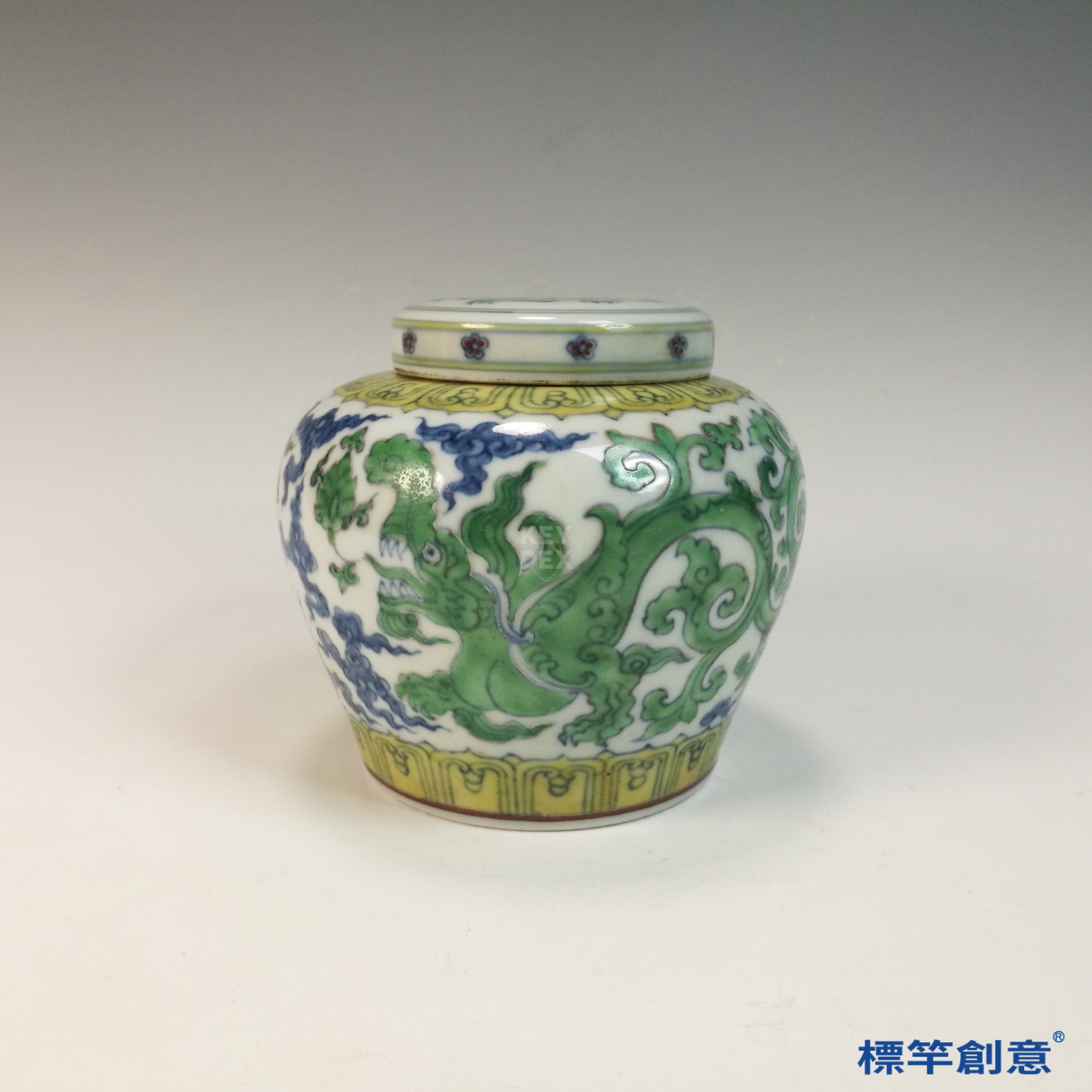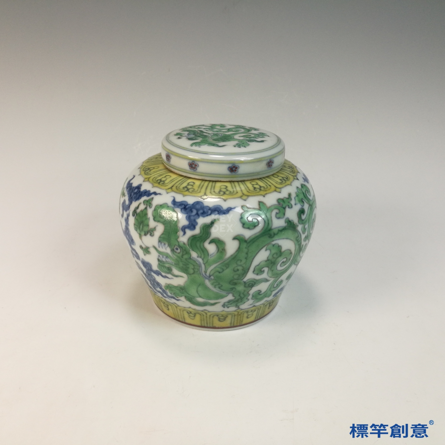 HB110 明中晚期青花綠彩天字款獸化龍紋蓋罐