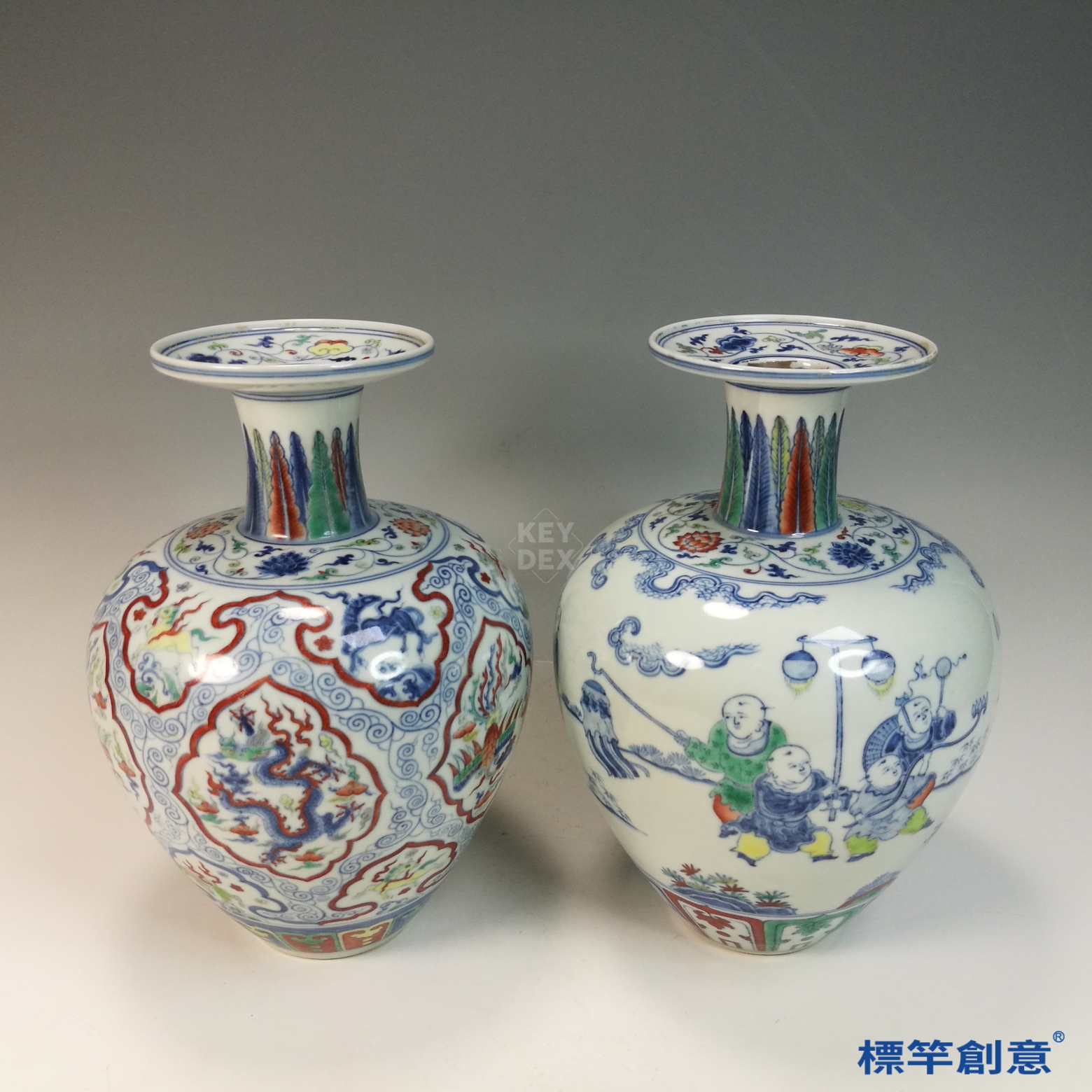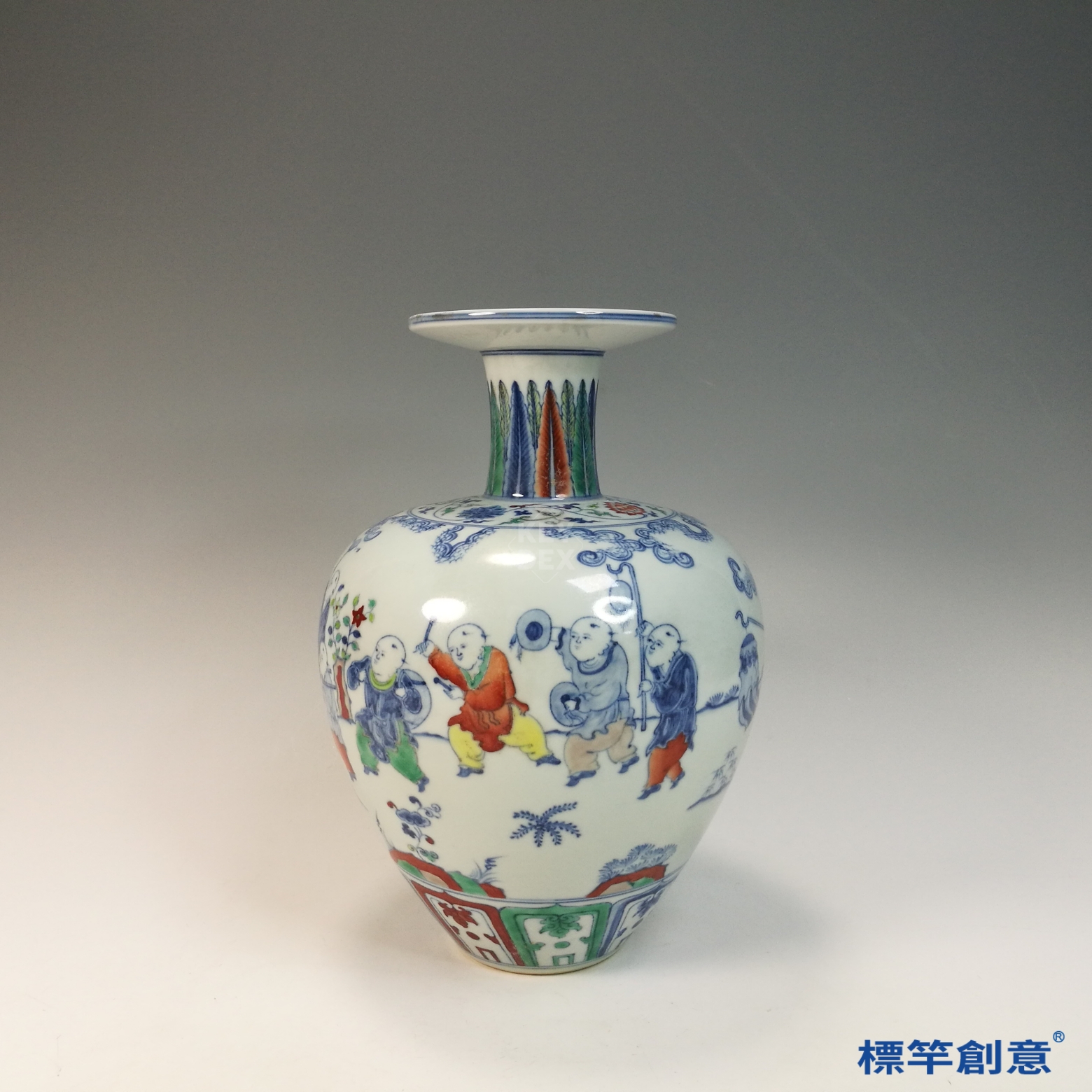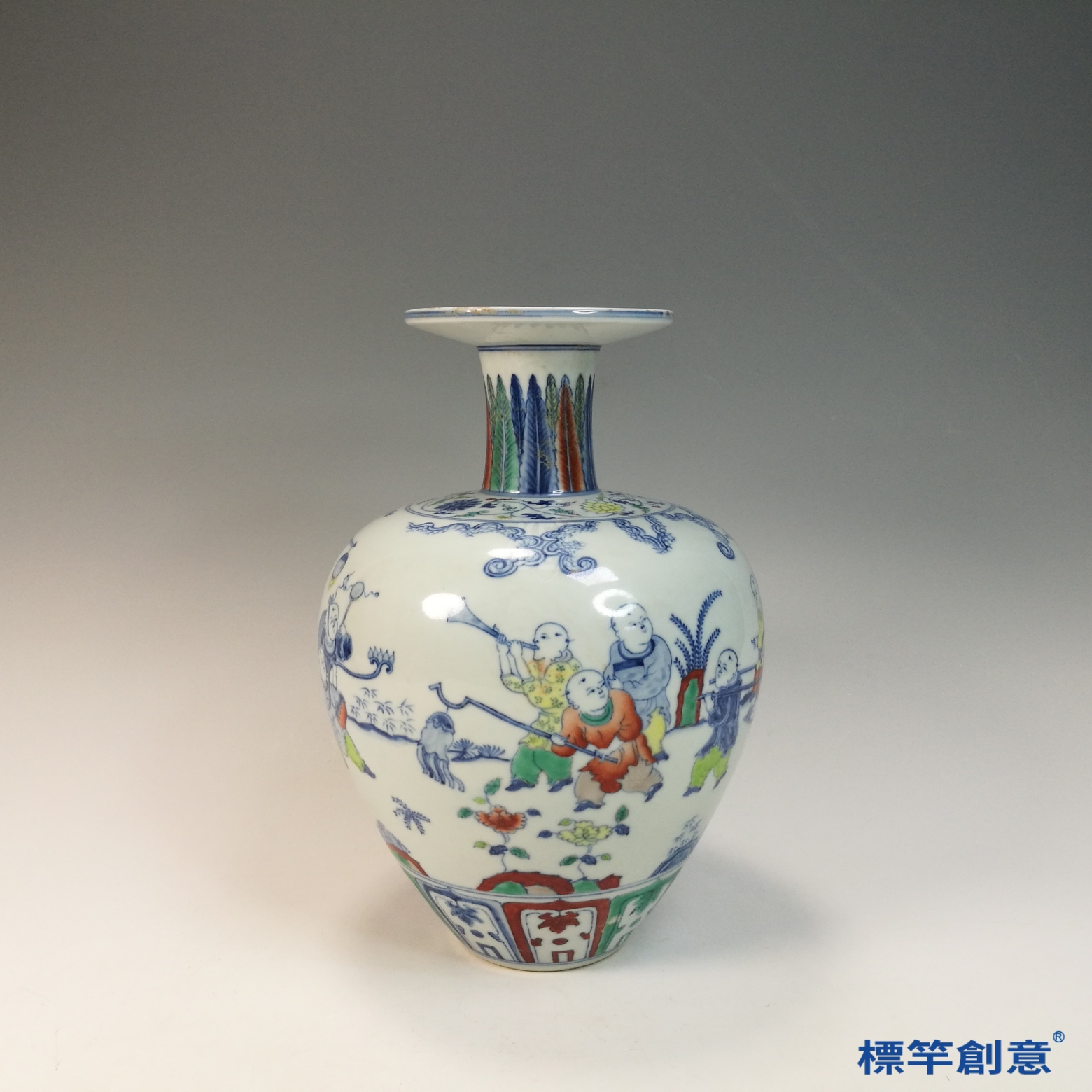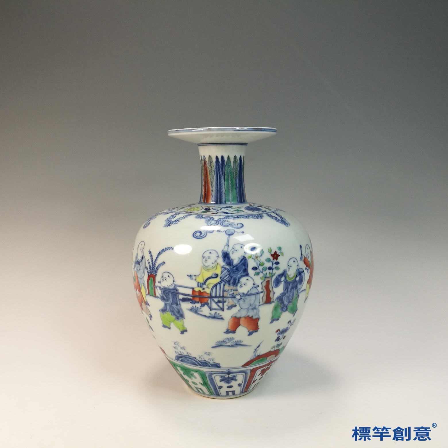 HB122 明中晚期青花五彩成化款嬰戲紋盤口瓶一對
