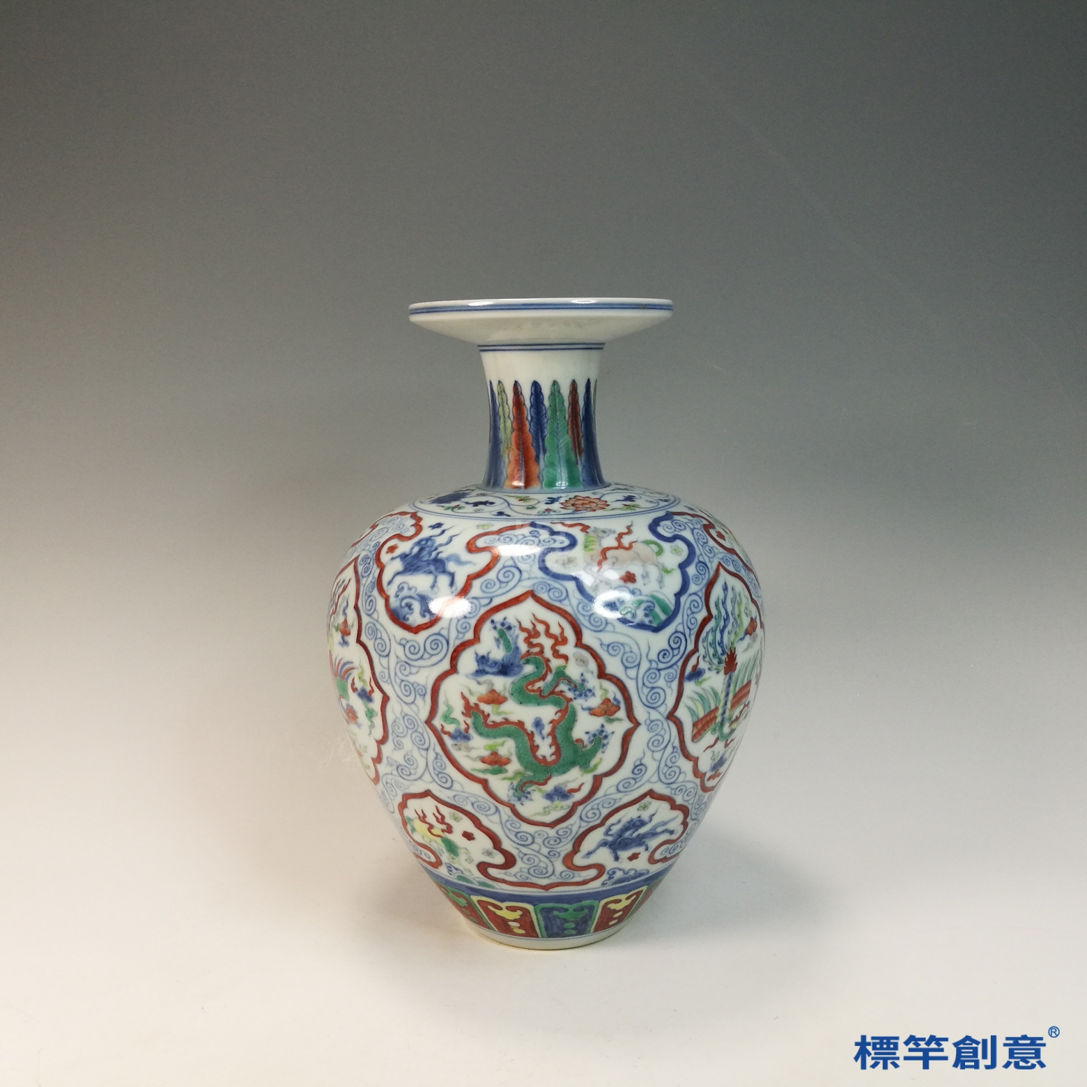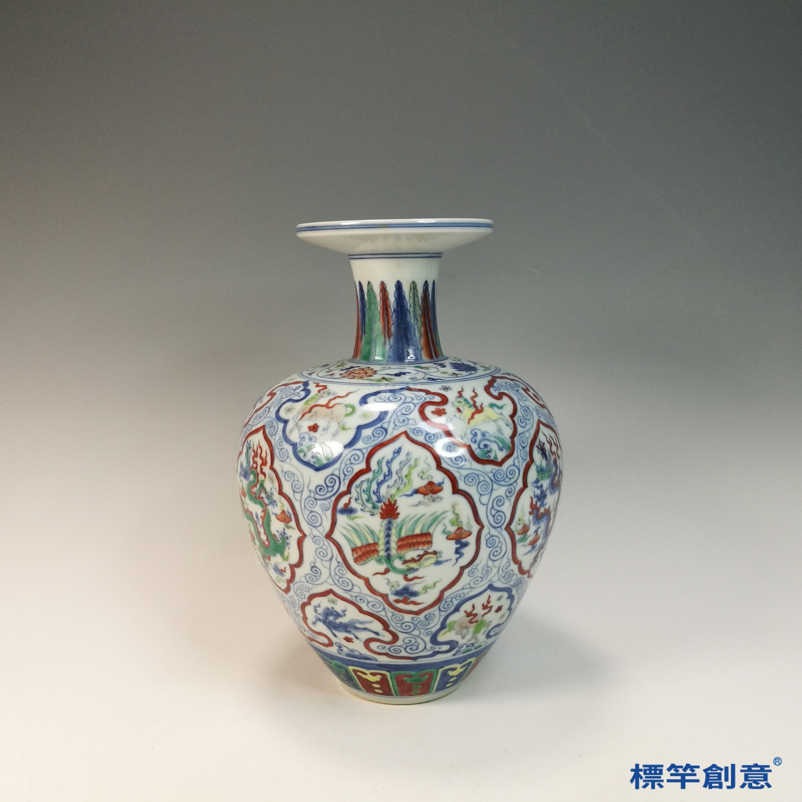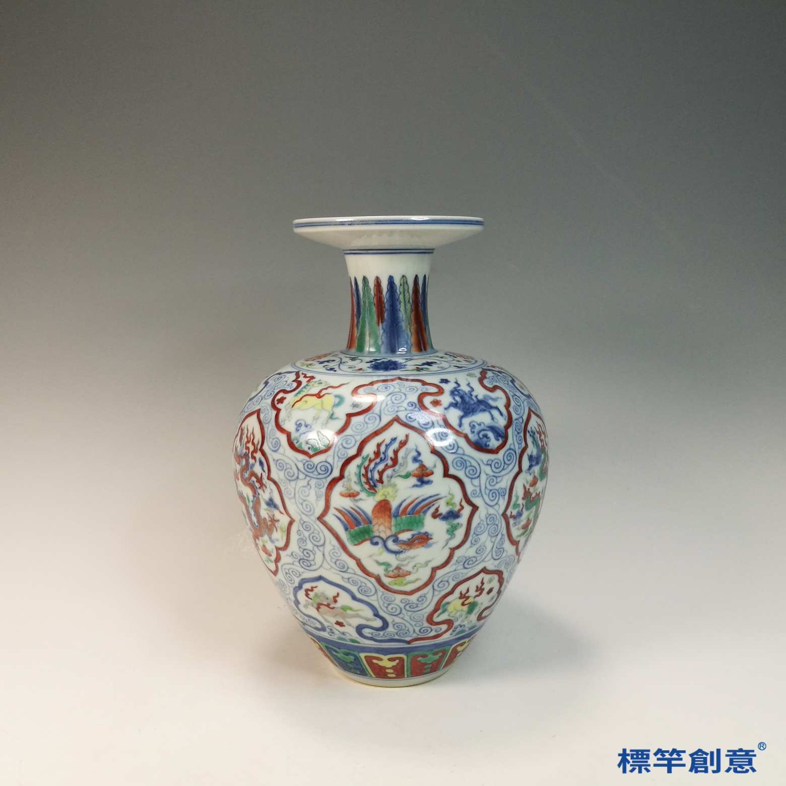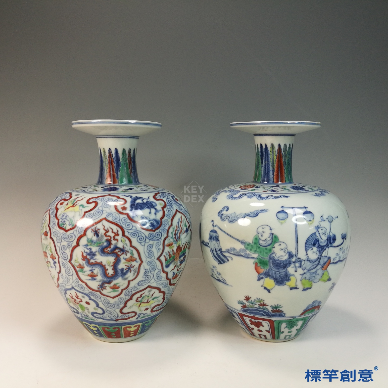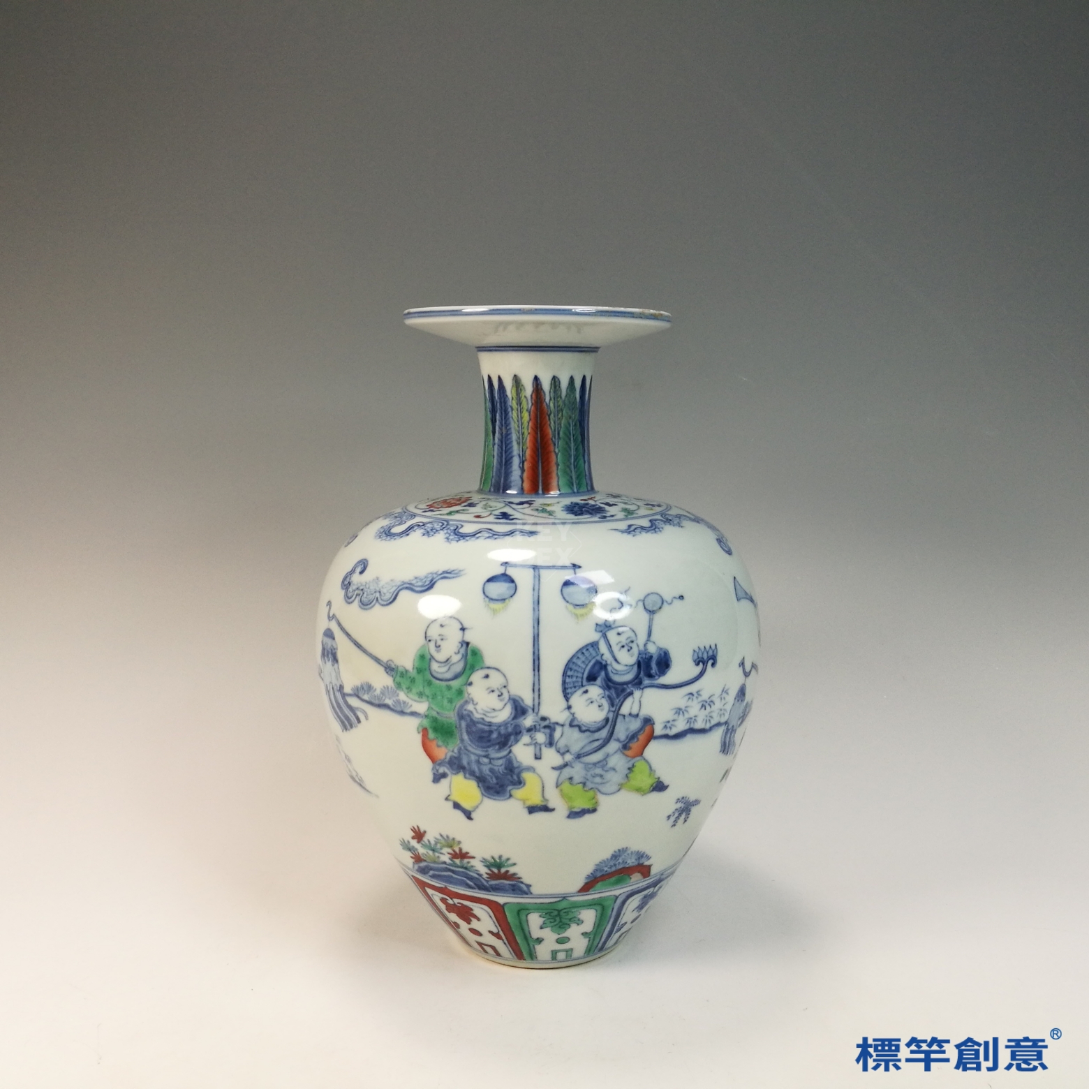 HB122 明中晚期青花五彩成化款嬰戲紋盤口瓶一對