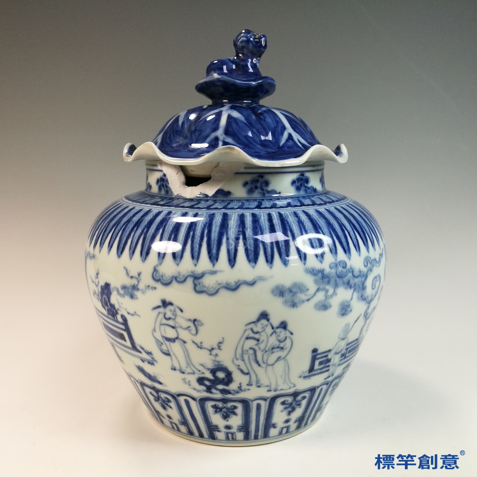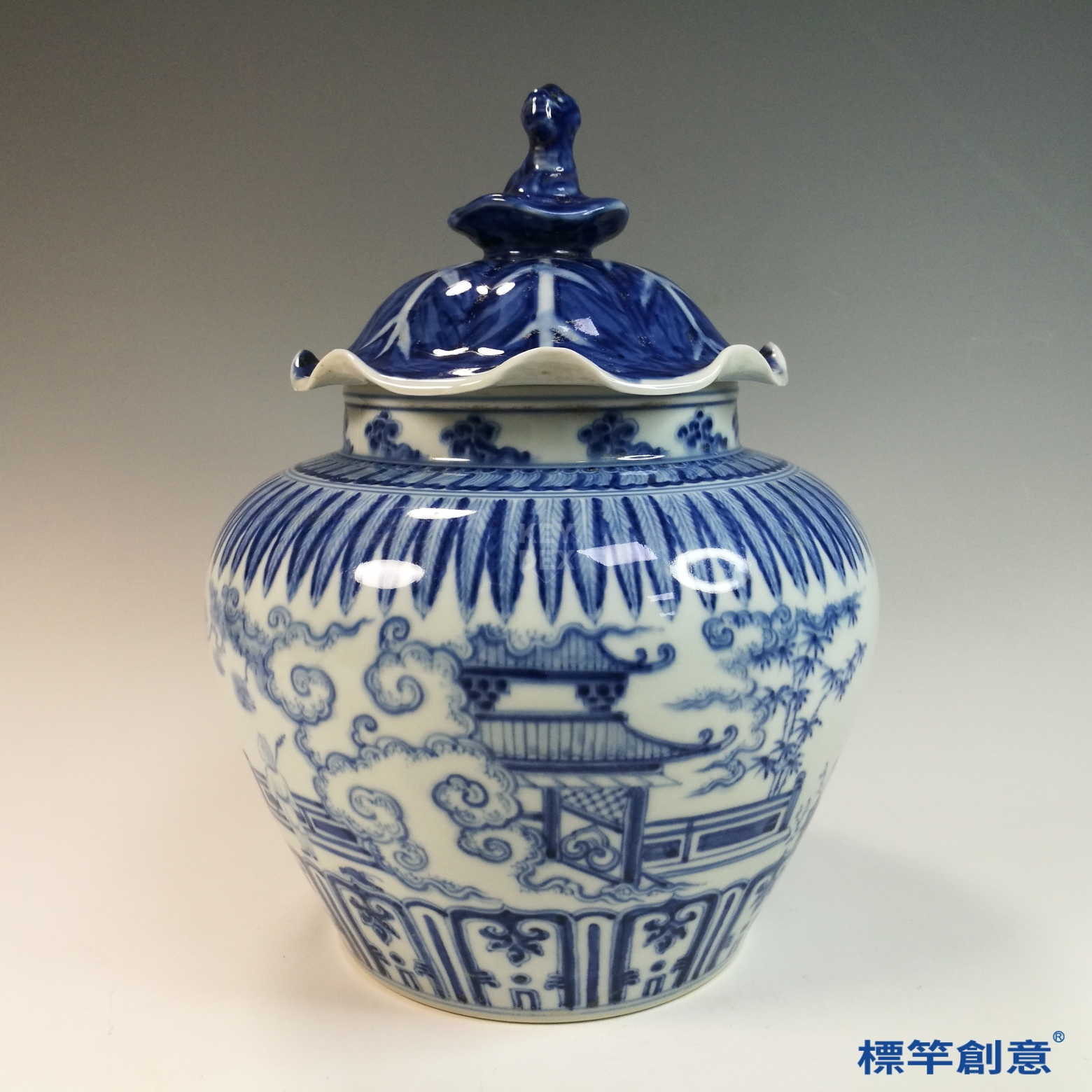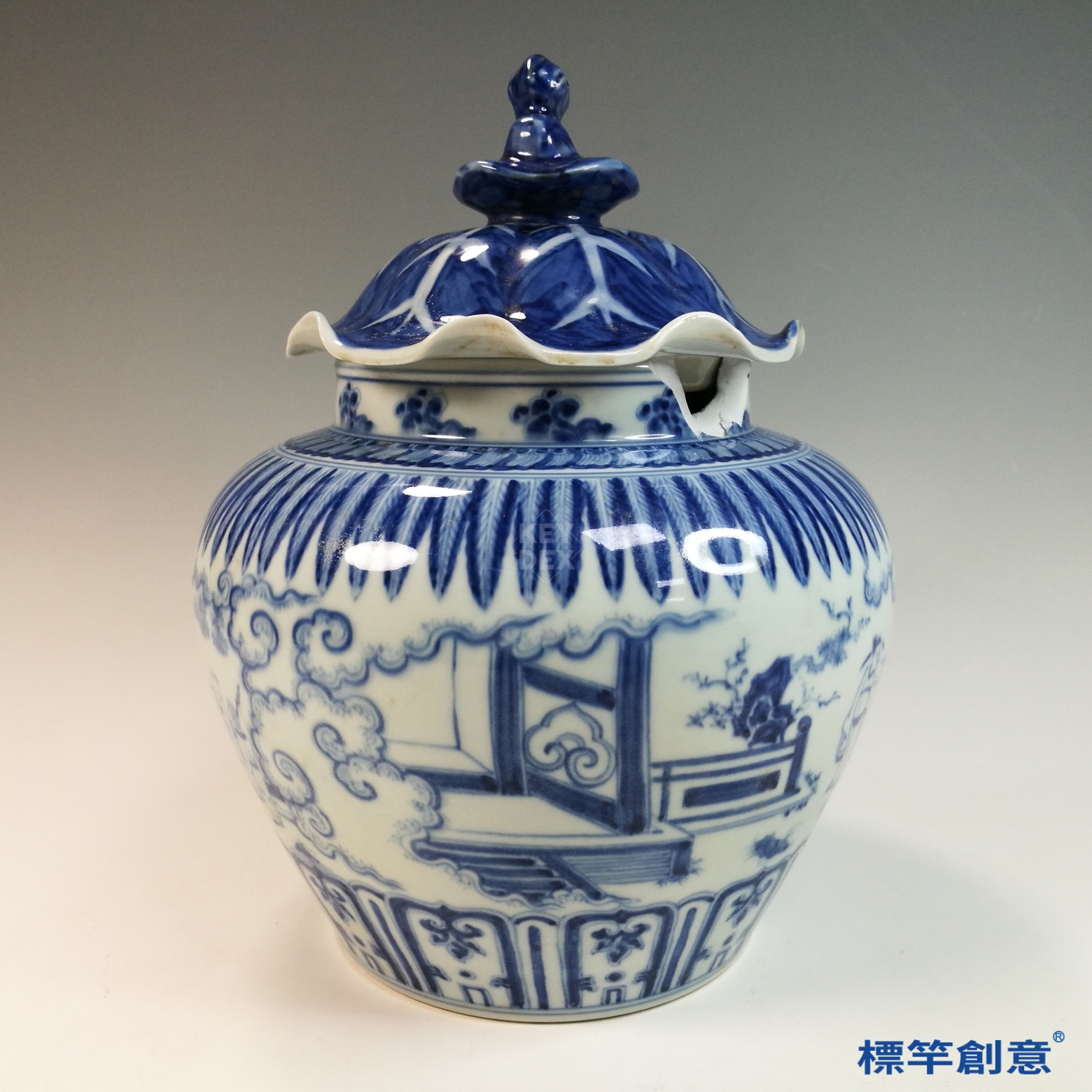 HB131 明中晚期青花成化款人物庭園紋荷葉蓋罐(口沿小損)