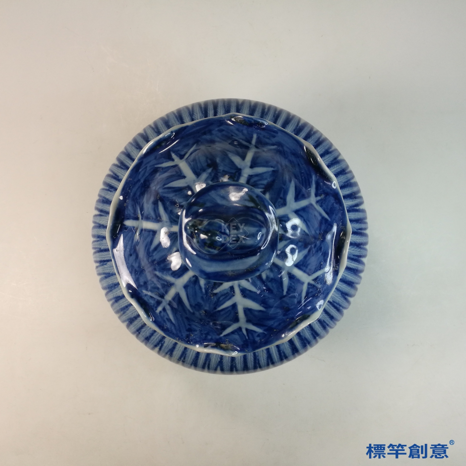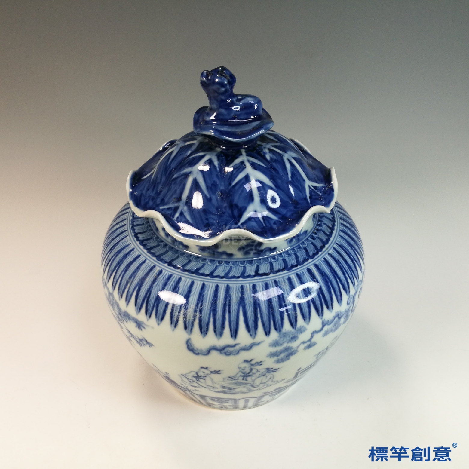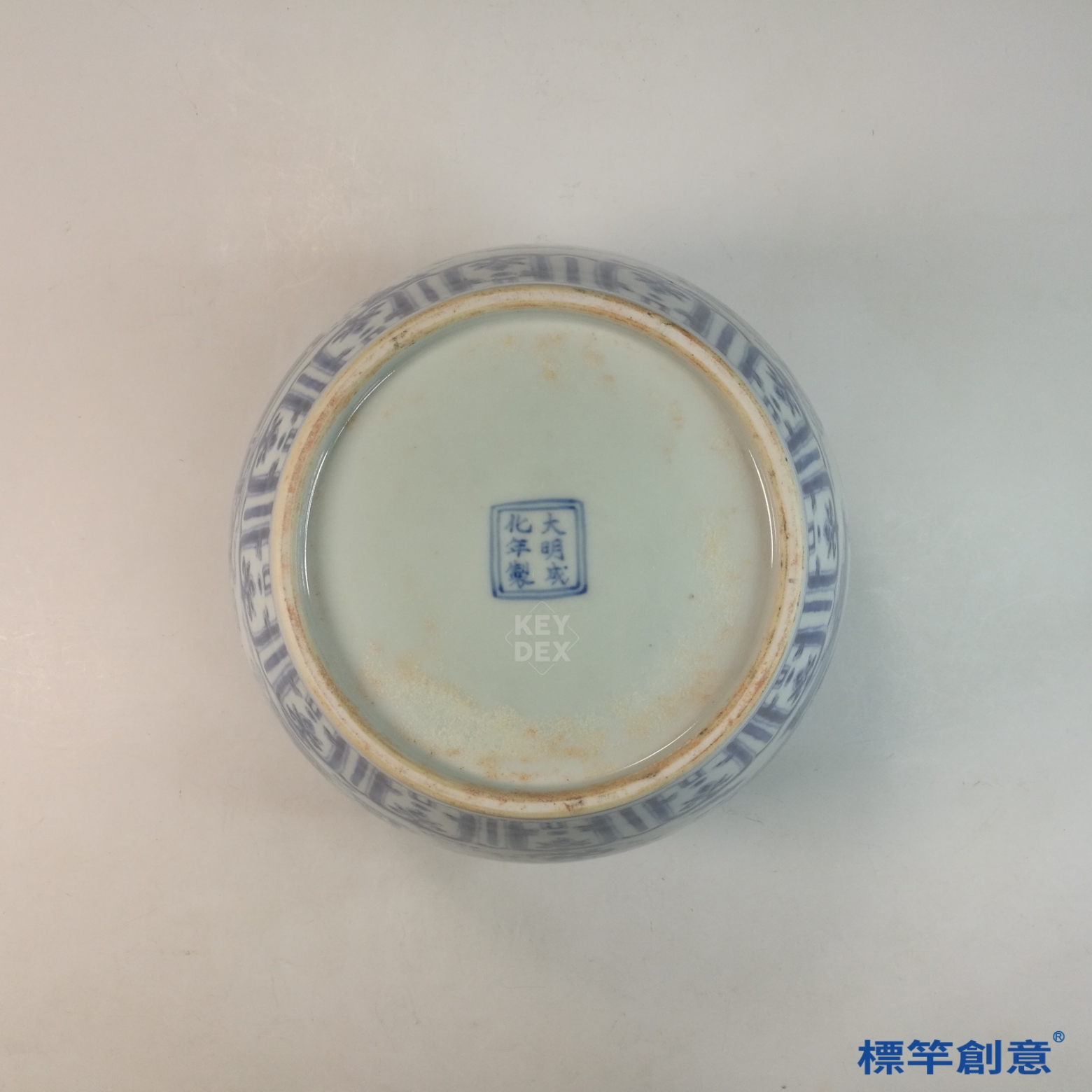 HB131 明中晚期青花成化款人物庭園紋荷葉蓋罐(口沿小損)