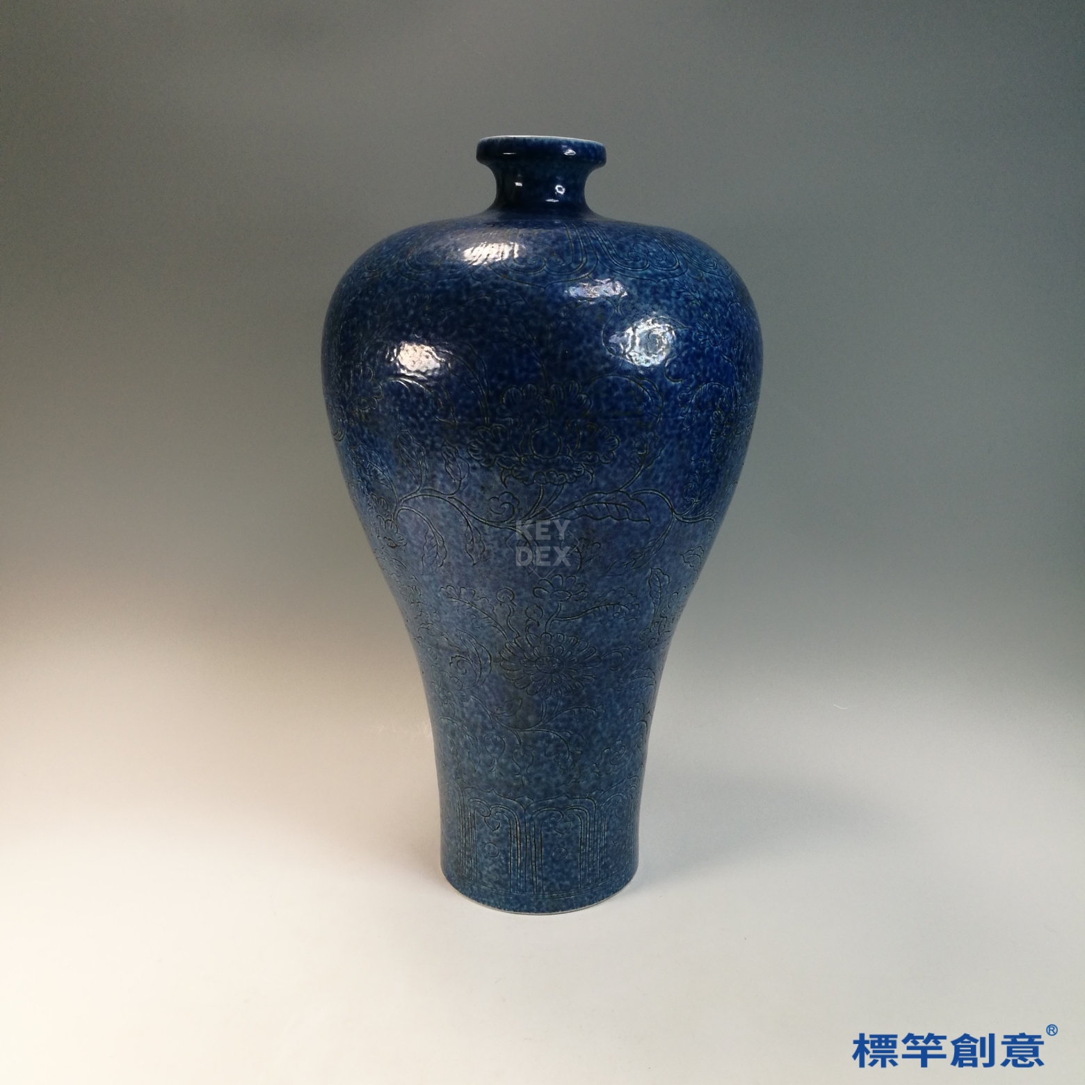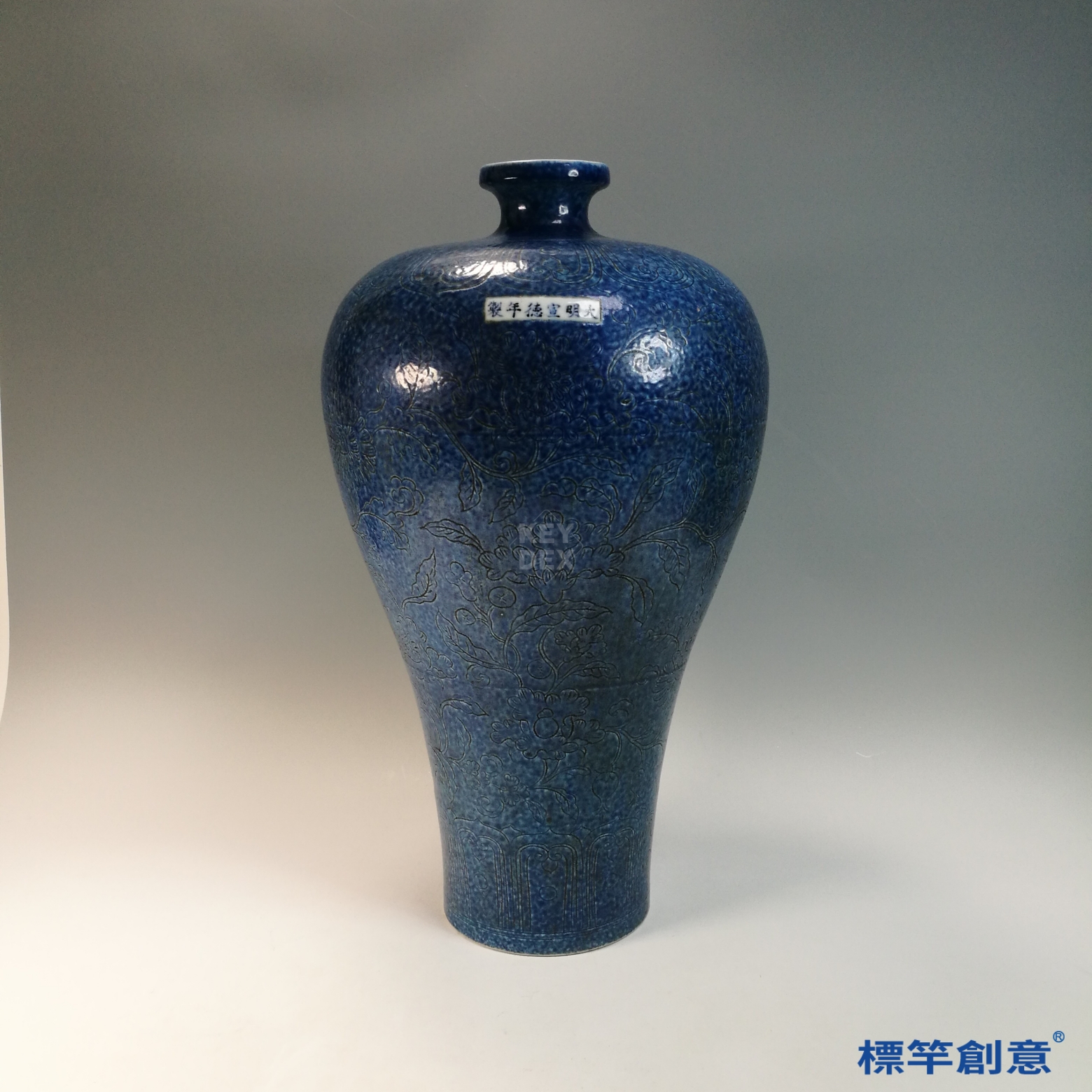 HB138 明宣德灑藍釉刻纏枝花卉紋宣德款梅瓶