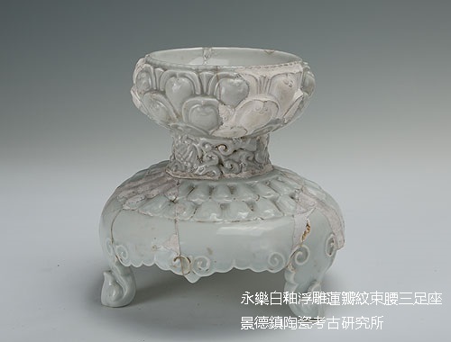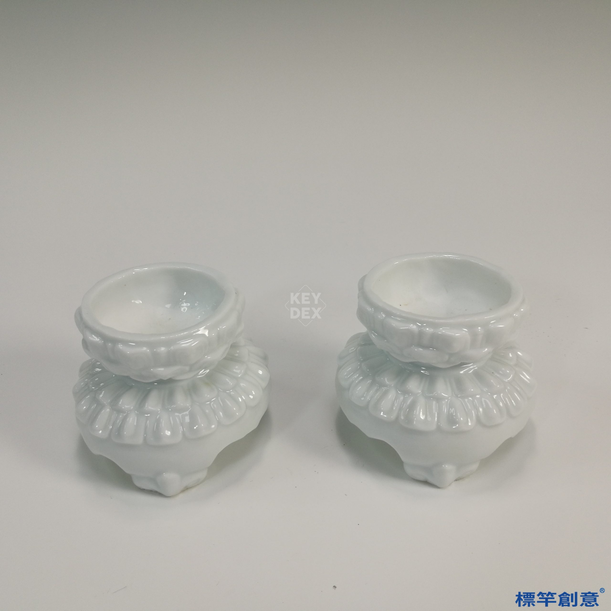 通體施白釉,釉質潔淨細膩,光澤柔和。外壁浮雕蓮瓣紋飾對稱整齊,線條圓潤清晰。底部三足承托穩定,燈台中央略凹,可置燈芯、油脂或蠟燭,結構明確,便於使用。